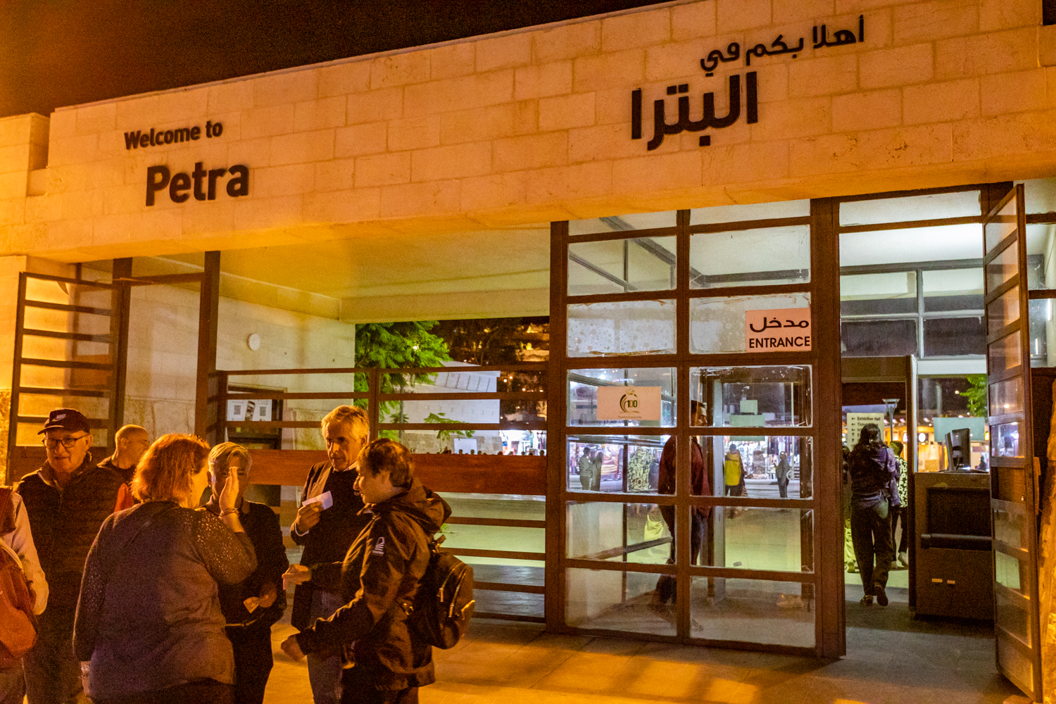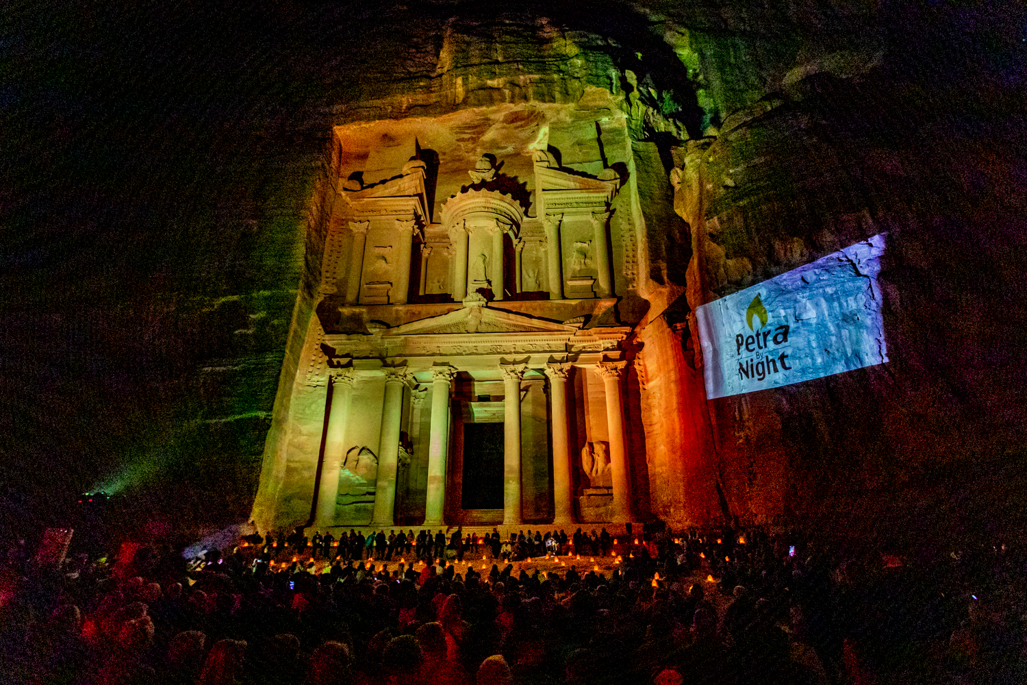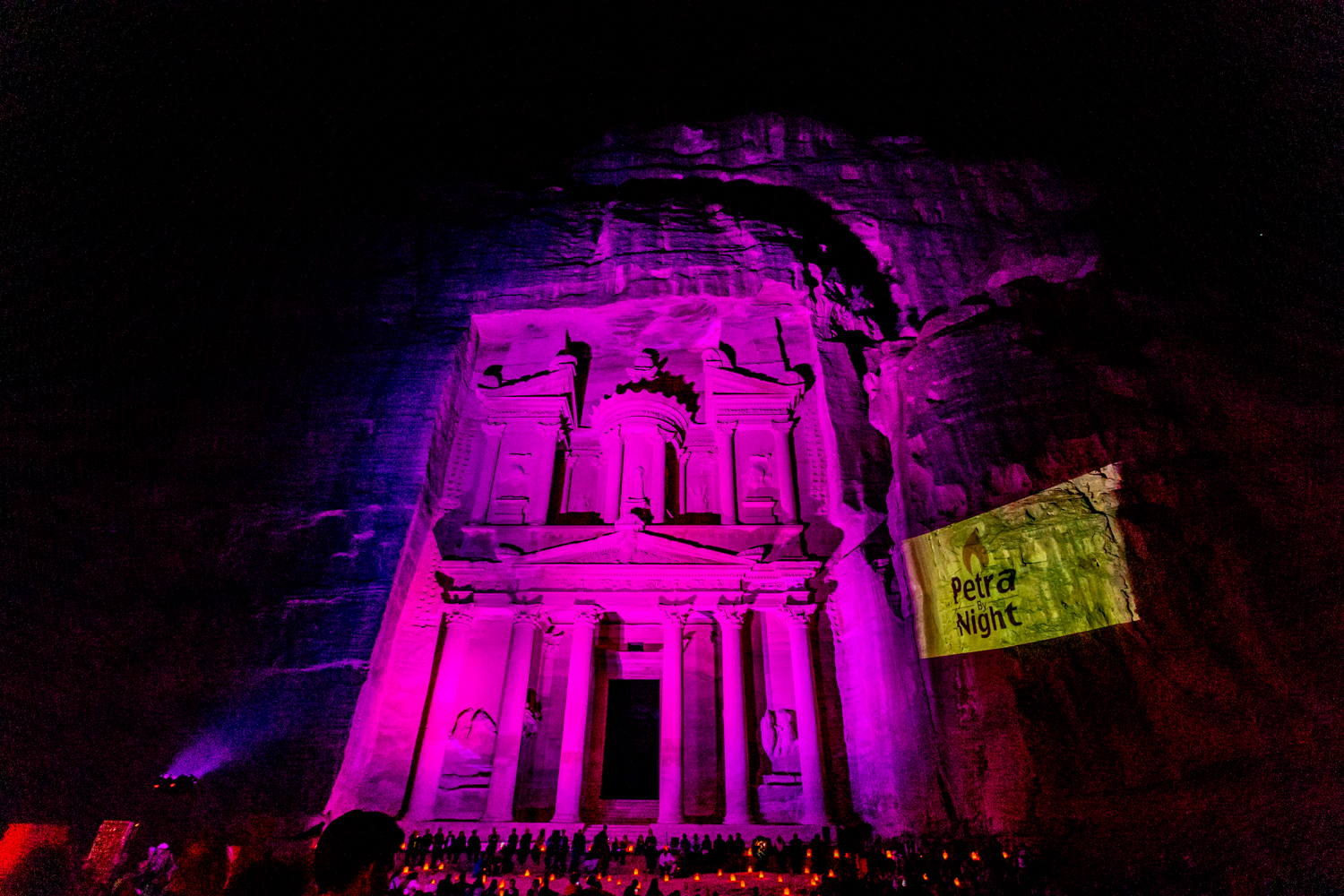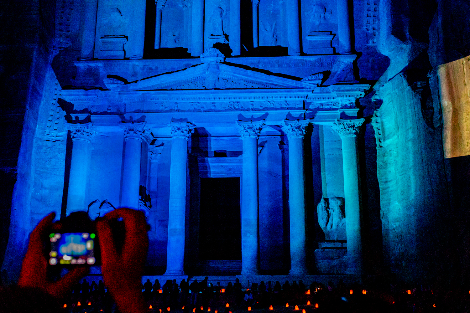 We leave dinner at 8PM and enter Petra (Only a 5 minute ride from our hotel) for a night hike that does not disappoint, except for the 2 kilometer hike each way. We get to the Treasury totally exhausted but it is lit up in changing colors and a treat for our camera lenses!