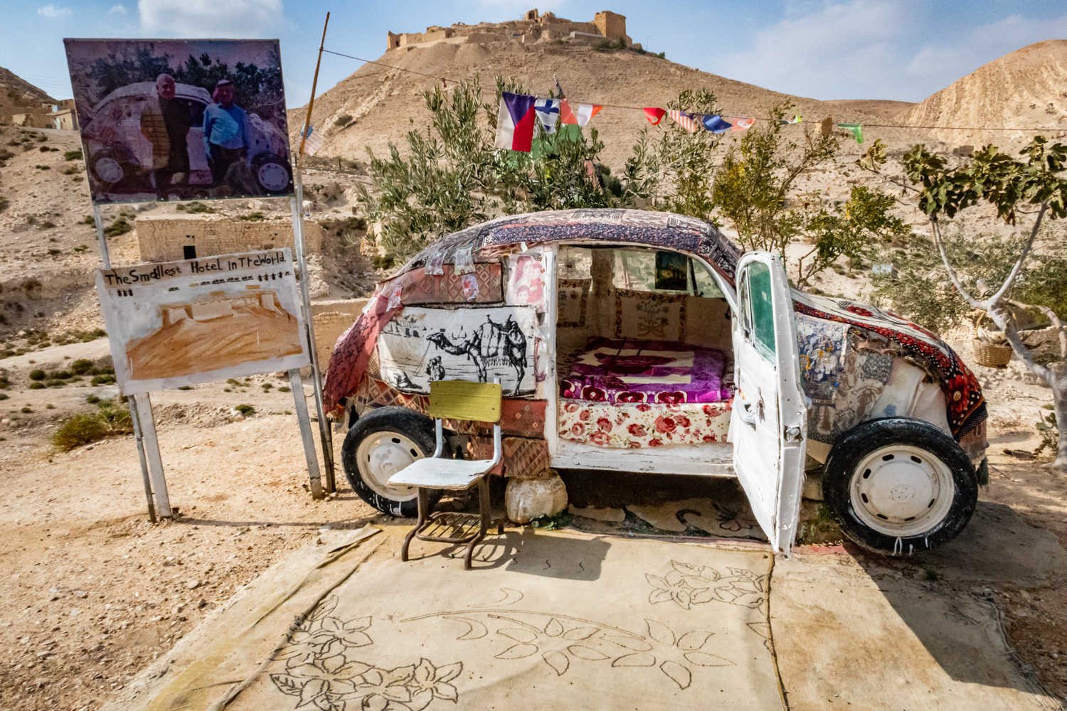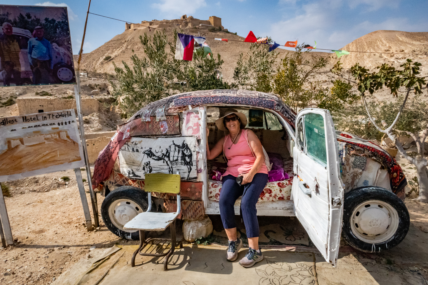 Then it’s back to Camp where we check out and load back onto our bus. We drive for an hour and a half to a place called the Citadel which requires a lot of walking uphill and down. The group ops not to visit. So we see the World’s Smallest Hotel (one room outdoors, LOL, in an old VW).