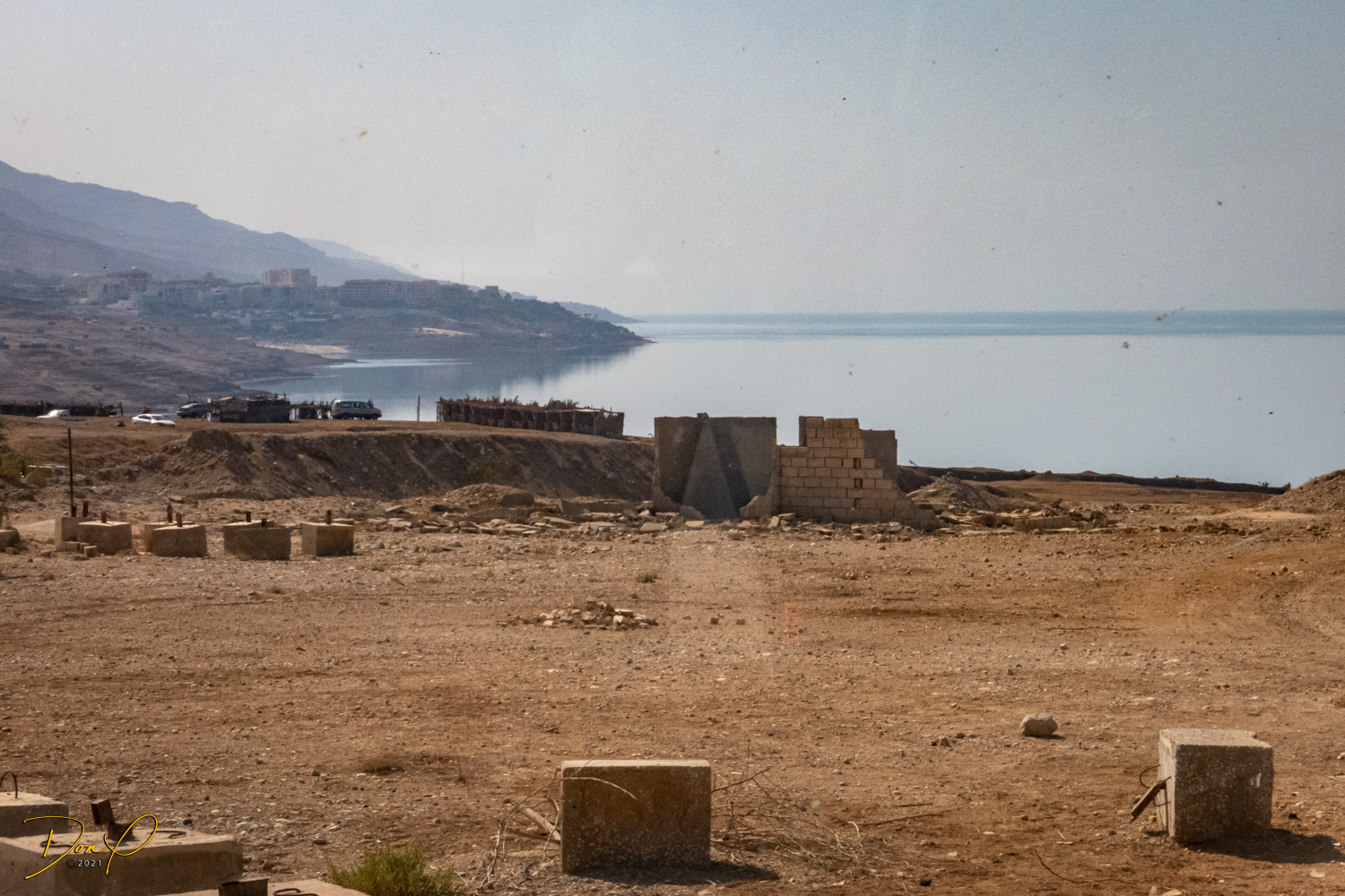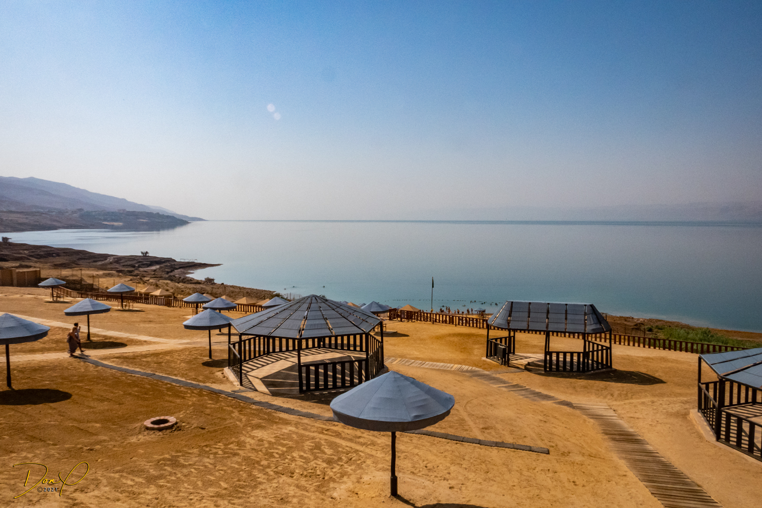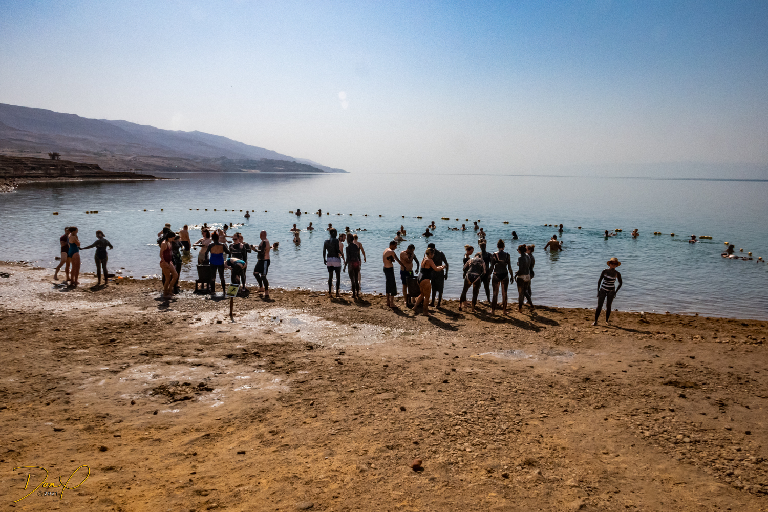 We arrive and lucky for us we have carried our swim trunks separately with us. We are at a large hotel that hosts swims in the Dead Sea. It is quite a downhill walk still to the Sea and we trudge down the boardwalk that leads there. I stop at a set of rest rooms and shower stalls to change into my suit.