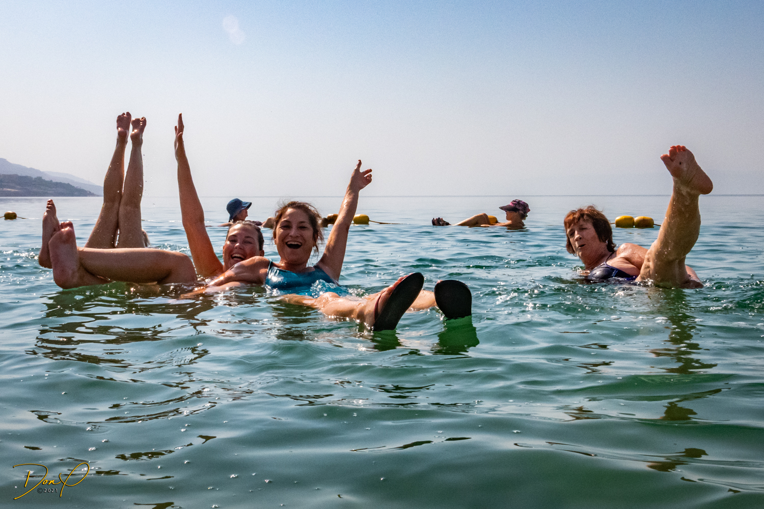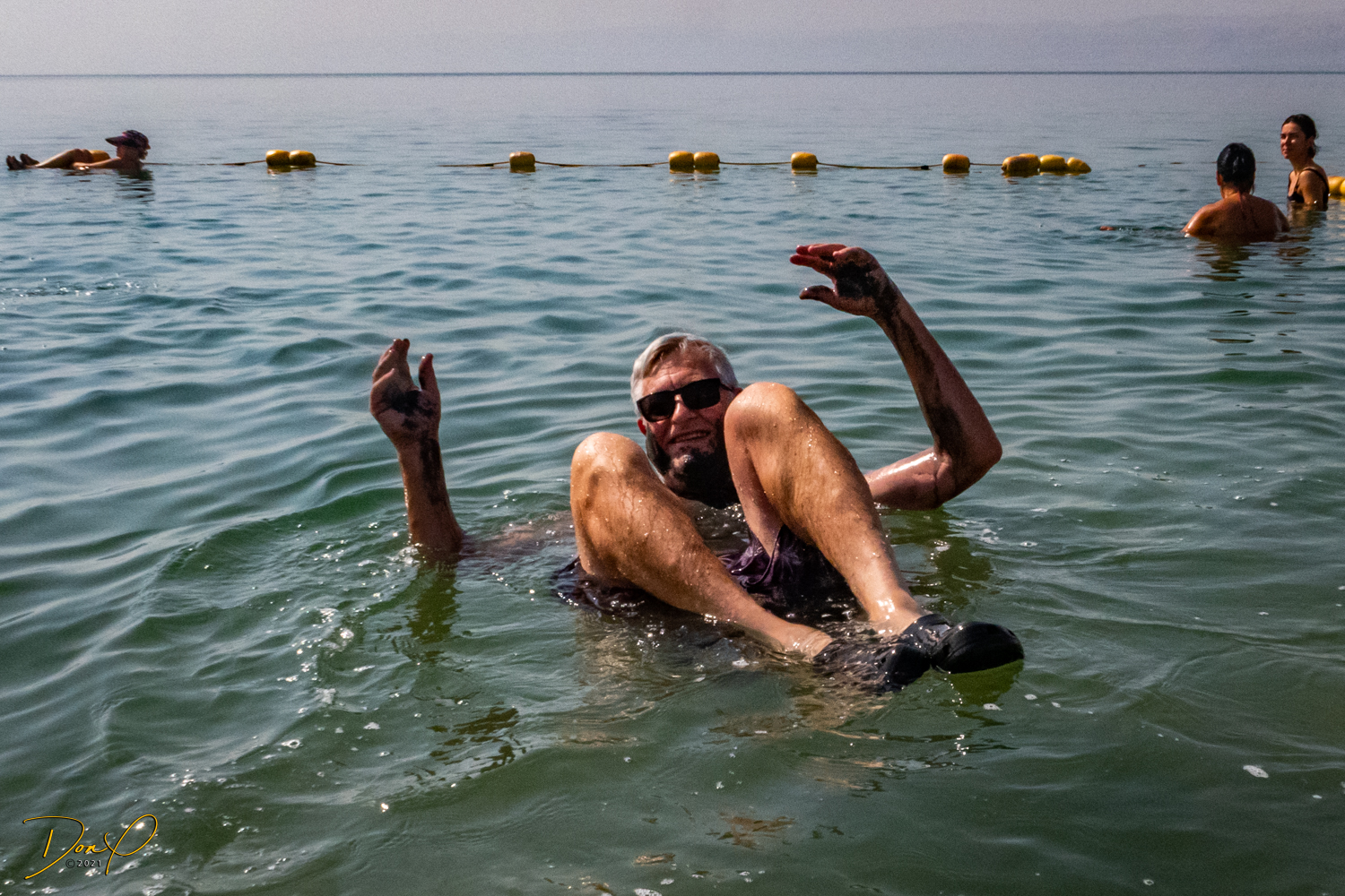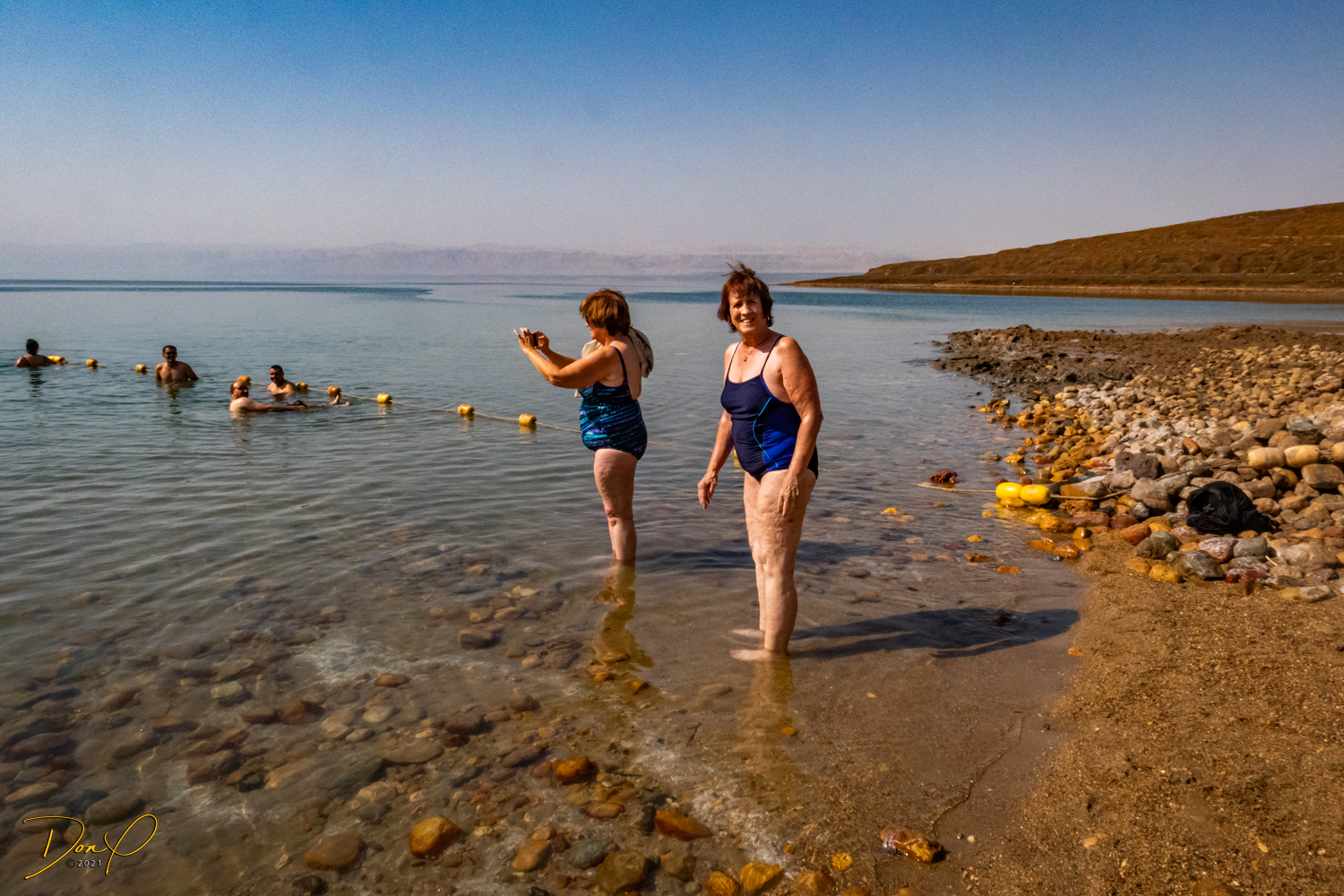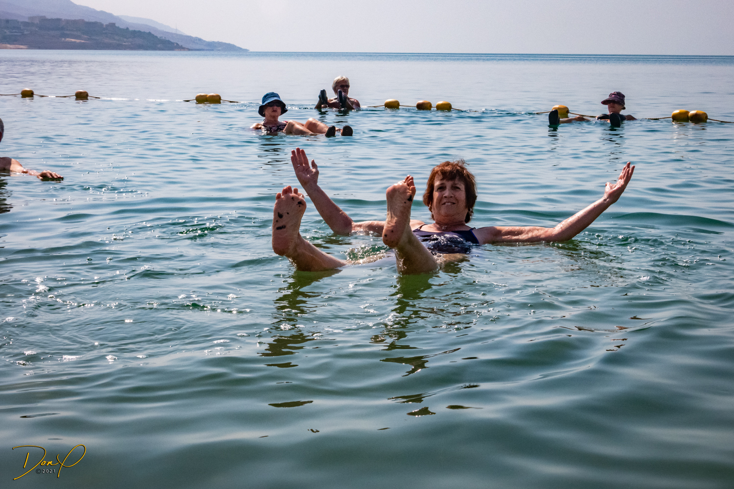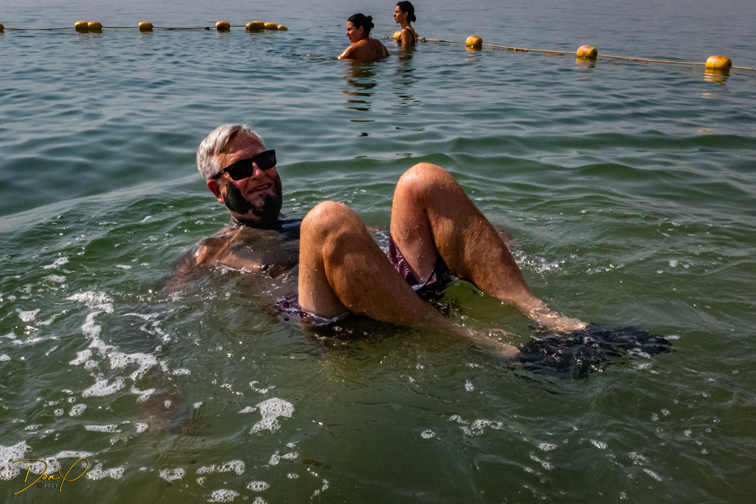 We gingerly work our way into the water. It feels weird. Slimy almost. We get deep enough to float and lift our feet off the bottom. Our bodies immediately pop up on top of the water and two-thirds are above water. Weird. Surreal. You can’t sink. I try to but no way, my body stays well out of the water. I go to deeper water and stay vertical. No need to tread water, I stay vertical and my chest and head are out of water. I have to work to keep my feet down. It is easier to just float on my back. My skin feels weird and slimy but very smooth. Several of the ladies play and cavort in the water, lifting their legs effortlessly in the air with no difficulties!