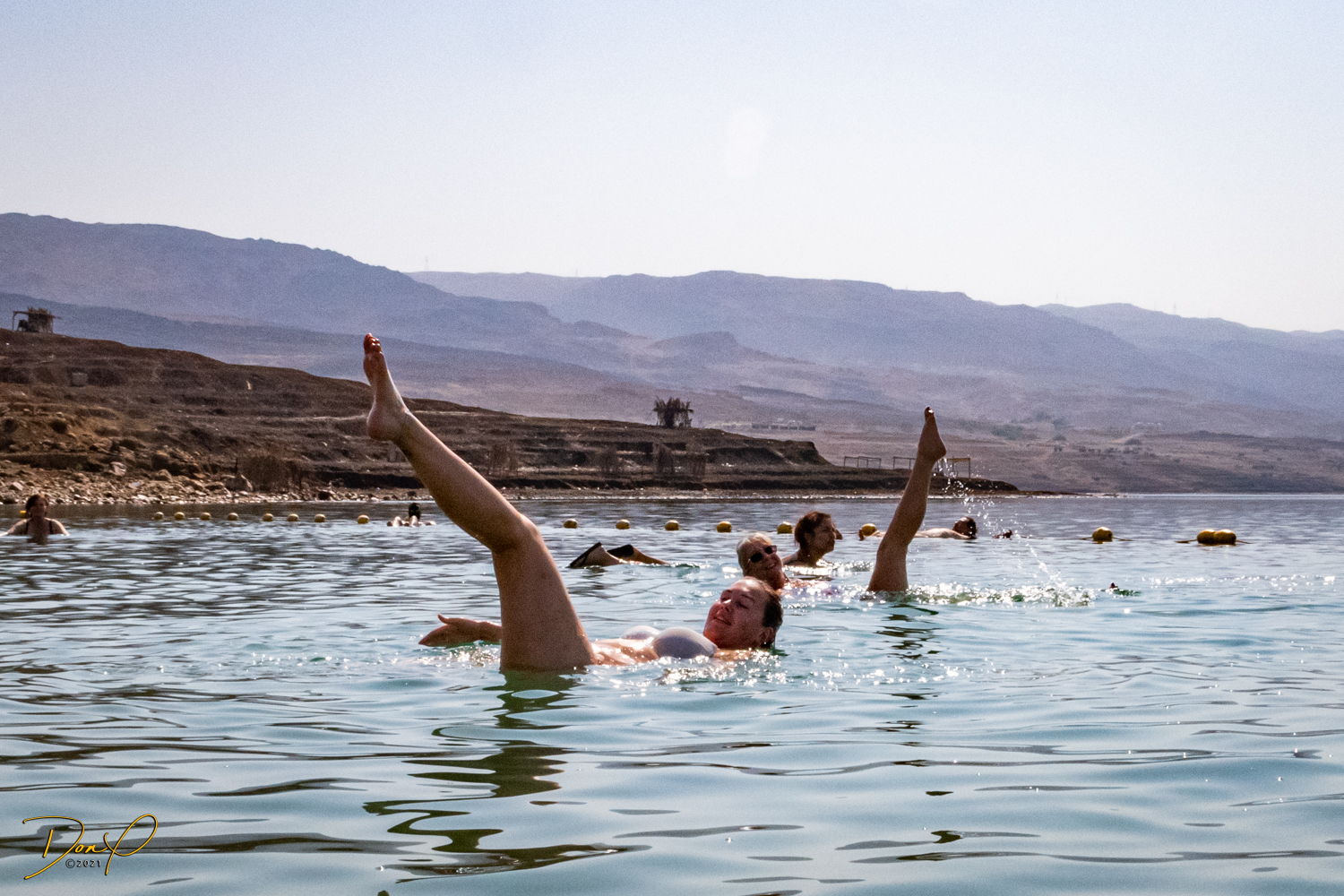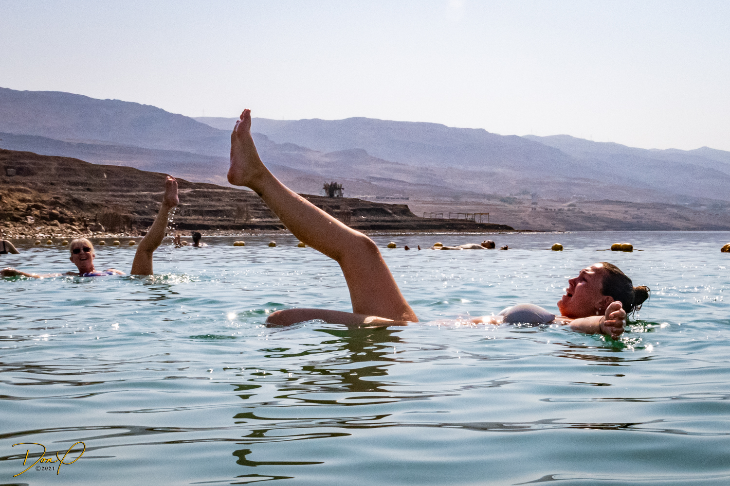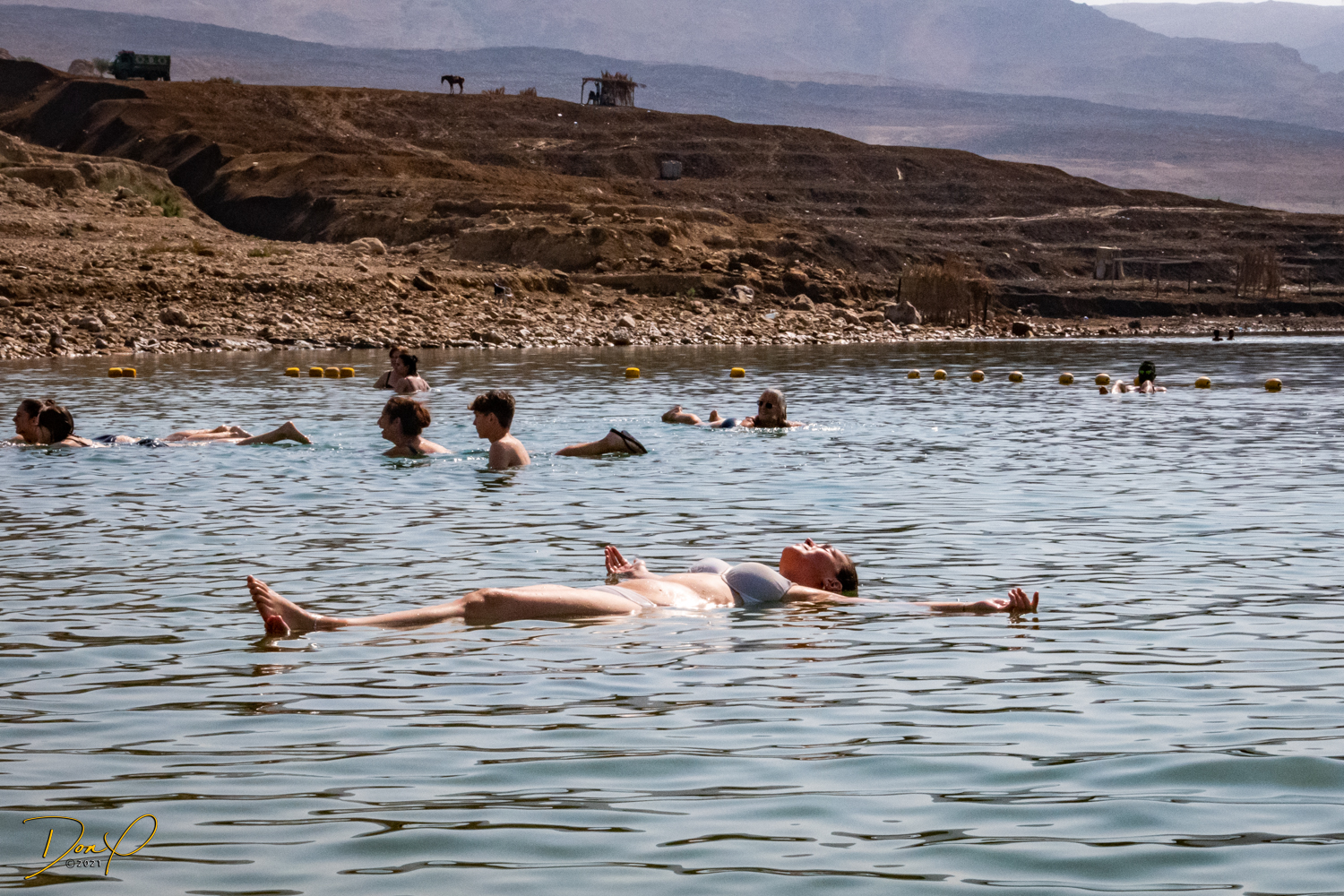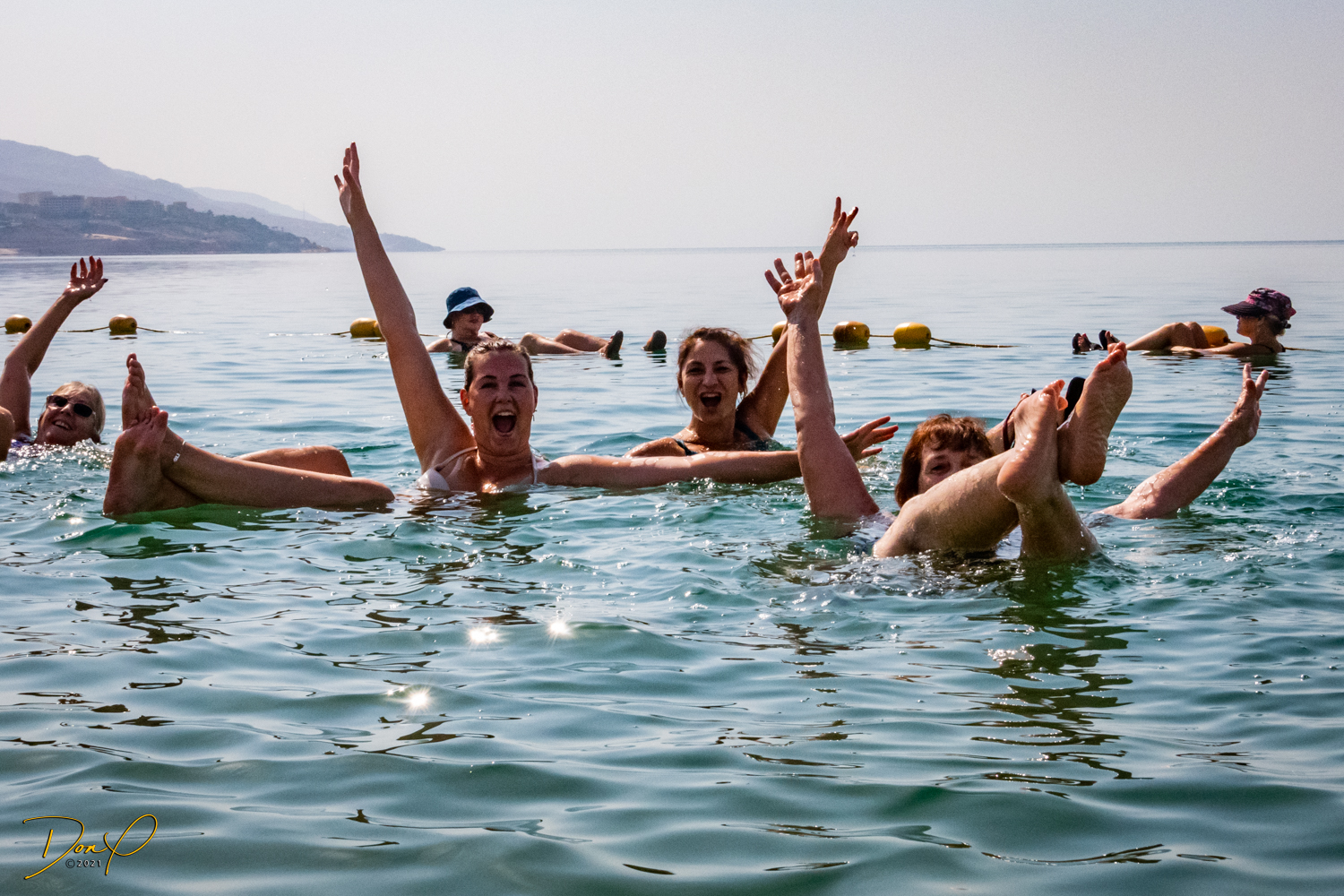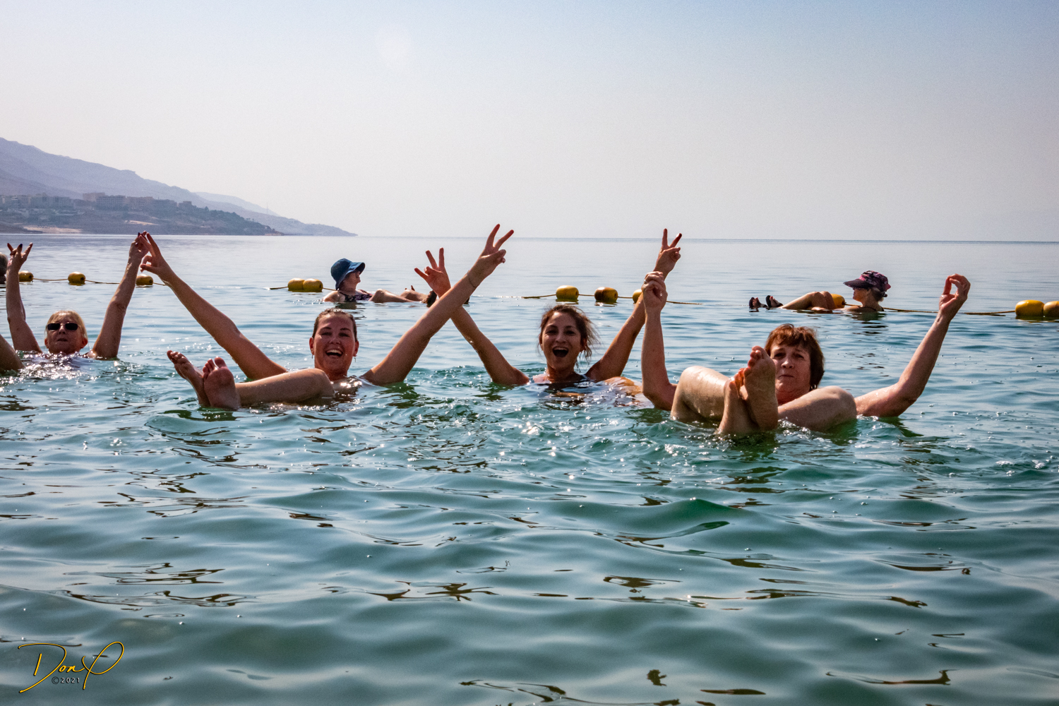 We gingerly work our way into the water. It feels weird. Slimy almost. We get deep enough to float and lift our feet off the bottom. Our bodies immediately pop up on top of the water and two-thirds are above water. Weird. Surreal. You can’t sink. I try to but no way, my body stays well out of the water. I go to deeper water and stay vertical. No need to tread water, I stay vertical and my chest and head are out of water. I have to work to keep my feet down. It is easier to just float on my back. My skin feels weird and slimy but very smooth. Several of the ladies play and cavort in the water, lifting their legs effortlessly in the air with no difficulties!