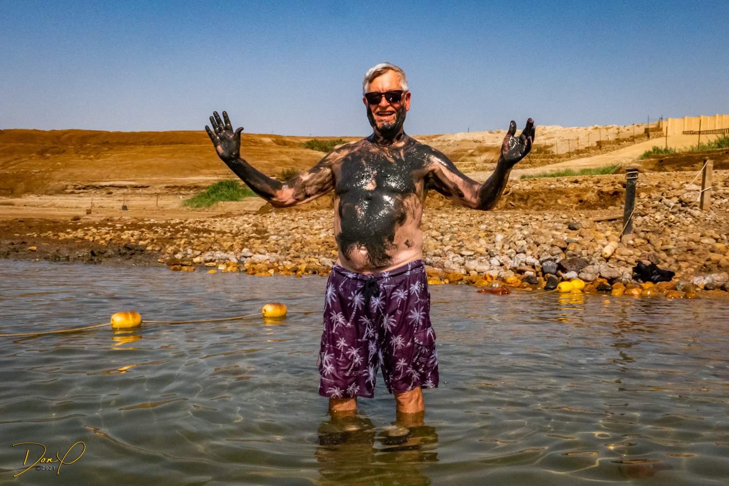 Elee gets the nerve to get some black mud and wipe it on her body. I take some and put it on my arms. No healing happening here, just hard to wash off. After a half hour in the water I call it quits and work my way out. I had brought my camera with me for some fun photos but then had put it back on the beach to play in the water. I retrieve the camera and we work our way back up the beach to the hotel, stopping at the showers to rinse off. The slimy feeling remains and I can’t wait to get to the hotel for a proper shower. I leave my swim trunks behind (I have more) as they are a salty mess.