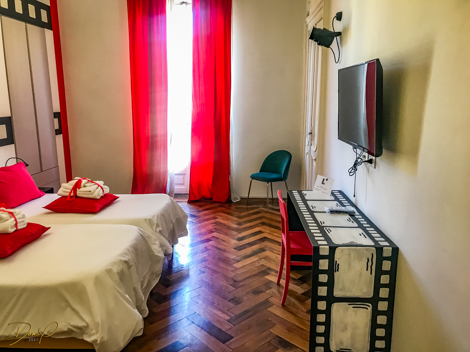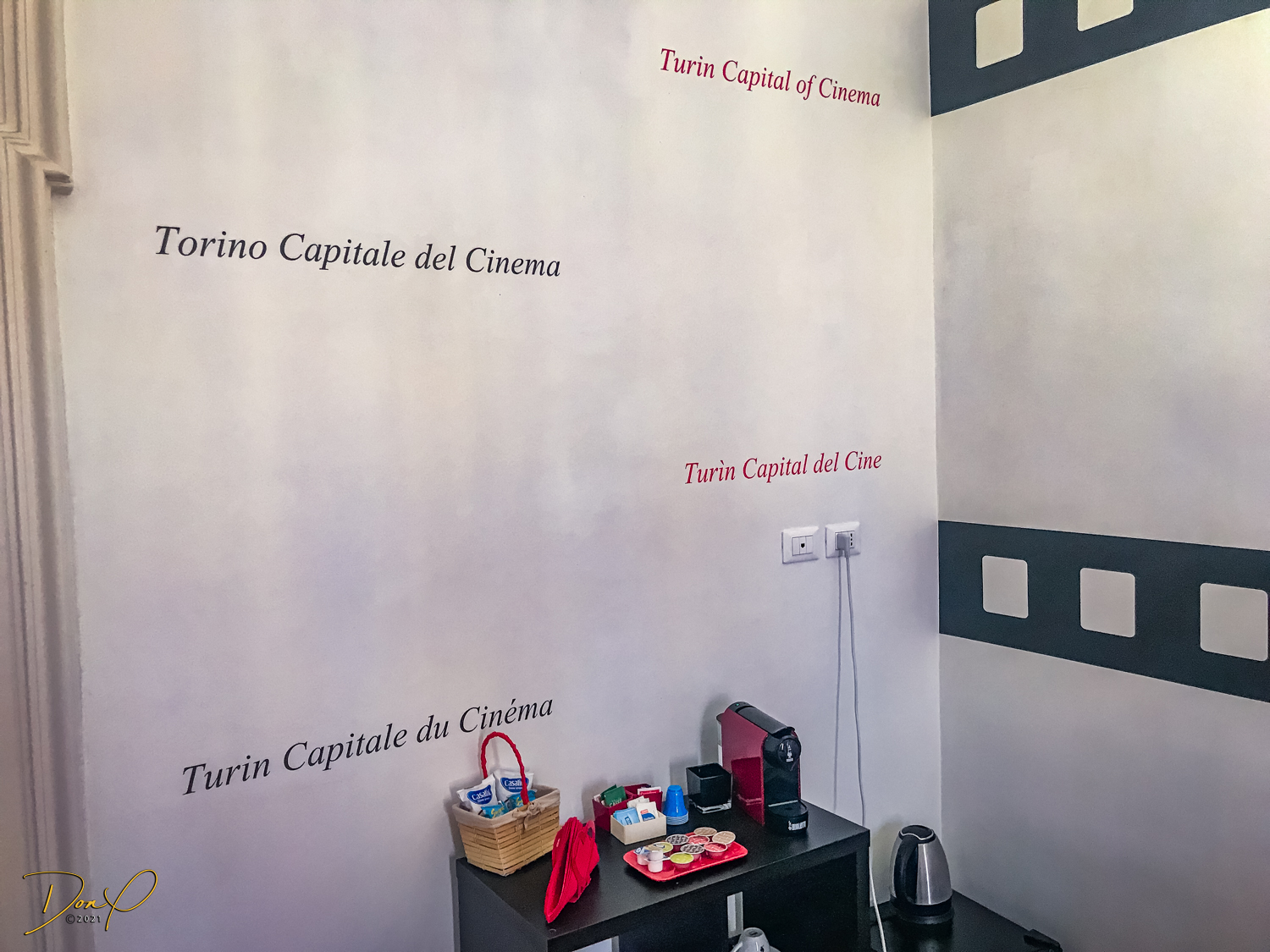 After getting into our latest AirB&B, we find a parking garage for our car. It turns out to be a fun room to stay in as it is called, “The Movie Room”! It also turns out that Turino is the capital of the movie industry in Italy! See the photo of our room!