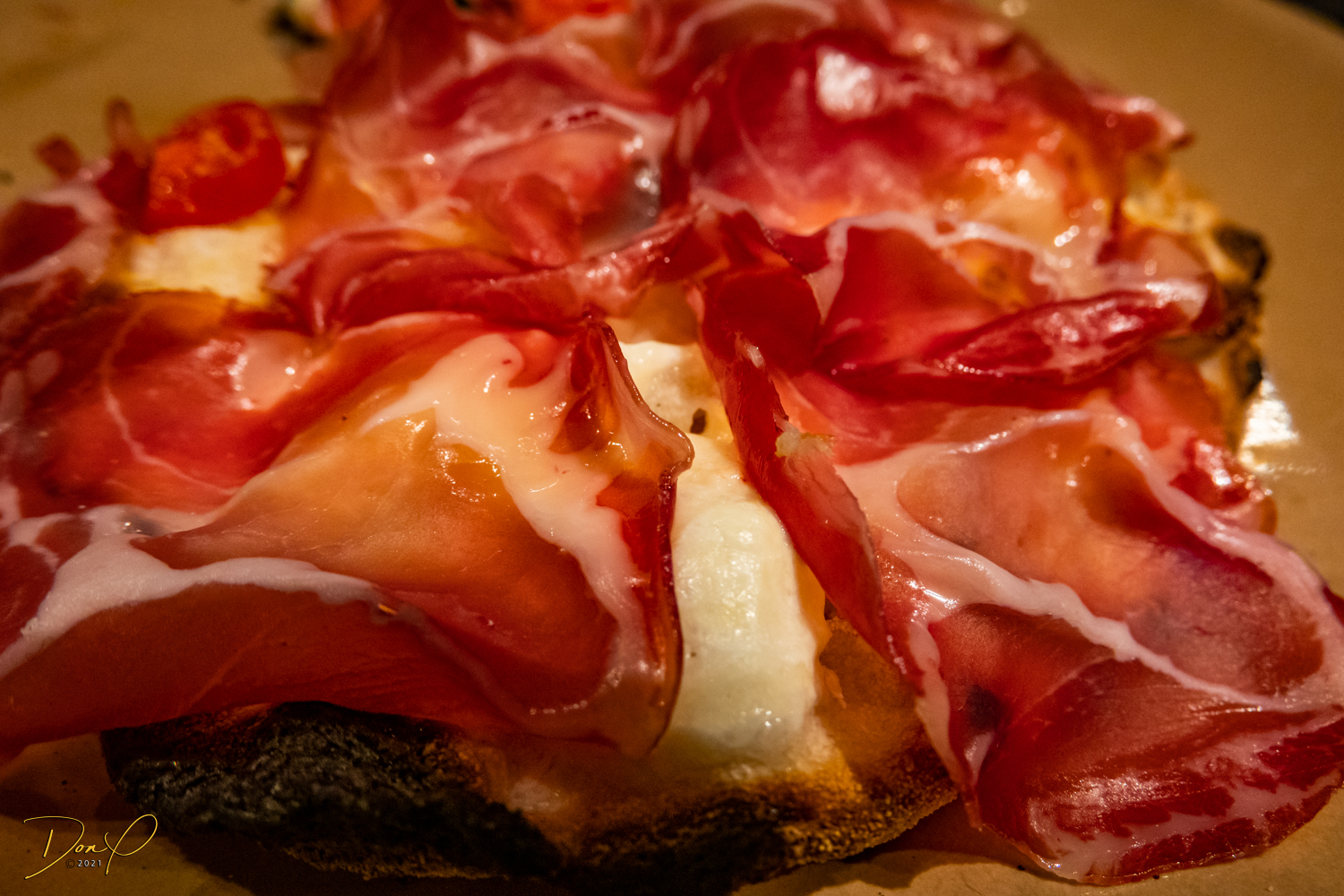 We wake up at 8PM and seek out dinner. Have I mentioned that in all Italy, most restaurants don’t even open until 7PM? So tonight it’s gourmet Pizza for dinner from Pizzeria Del Ponte, right next door to our hotel. And gourmet it certainly is! Fabulous cheeses and cured meats adorn our pies! I don’t manage to completely finish mine and take a couple slices to go! A glass of Aglianico red wine tops off the meal!