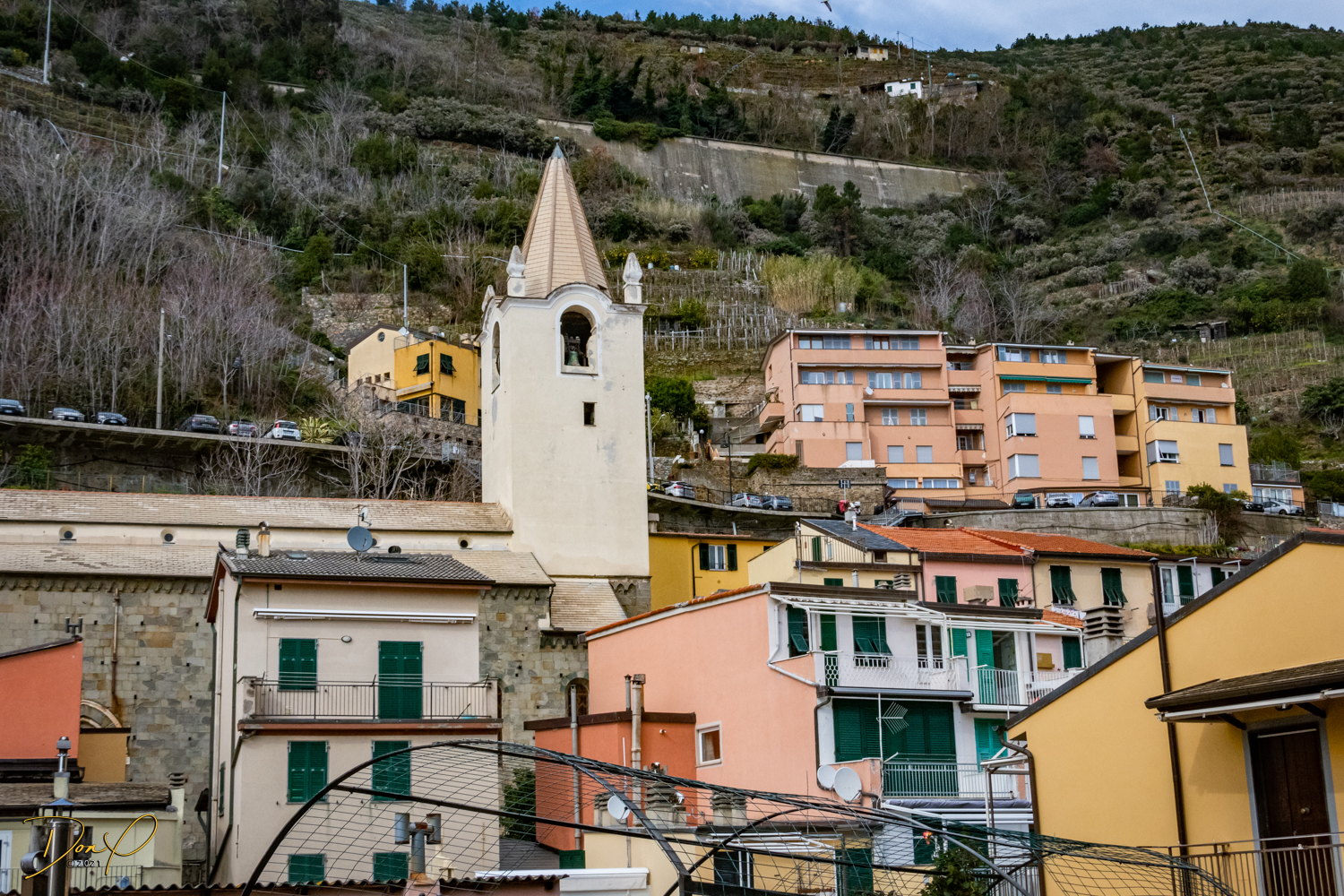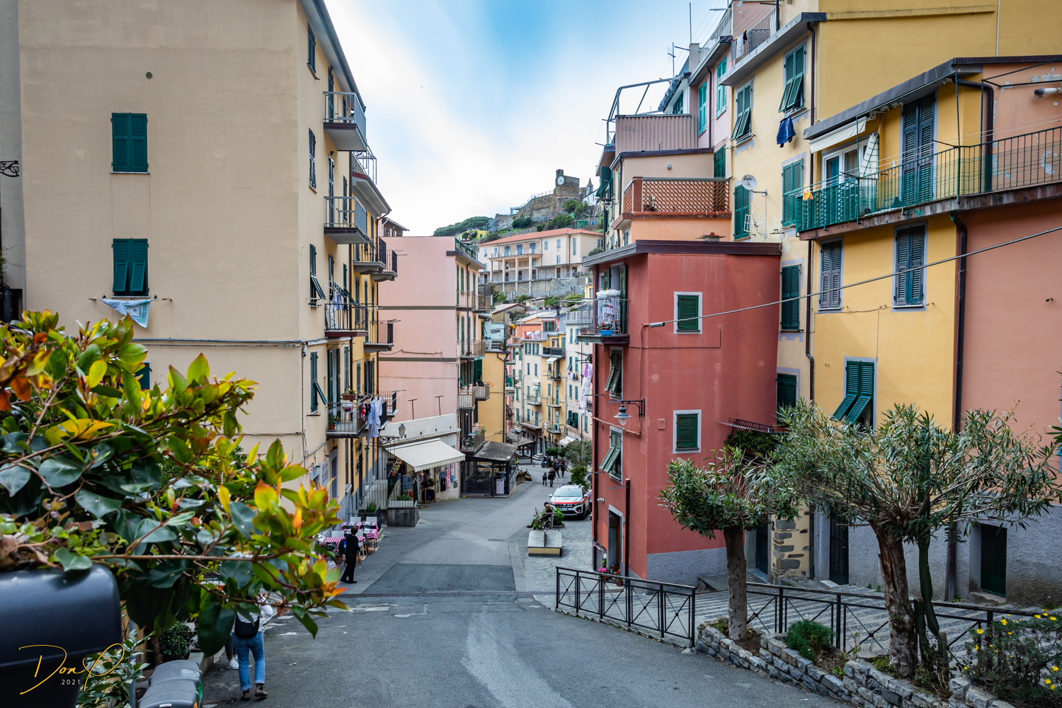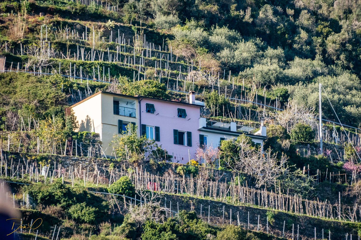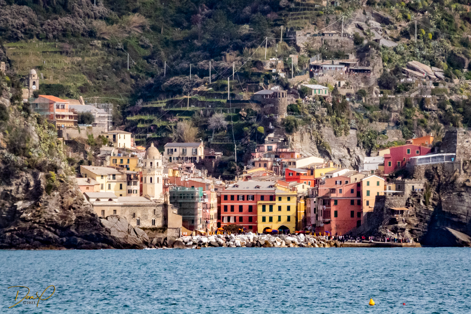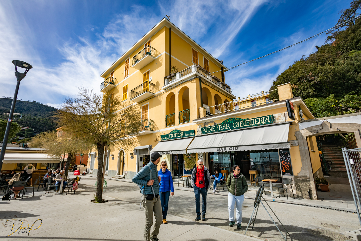 I make my way down and back up to Elee and I take some shots that she has of the other side. Then we work our way out of the Marina and back to the train station. We have the schedule figured out by now and we ride the train to Vernazza next. This is another Village that we are told has good views. We disembark and the trail is clear. Walk downhill. Picturesque buildings all the way! The views are fabulous as we walk down. We take our time to try and help Elee’s knees. I see Tylenol in both of our future evenings!