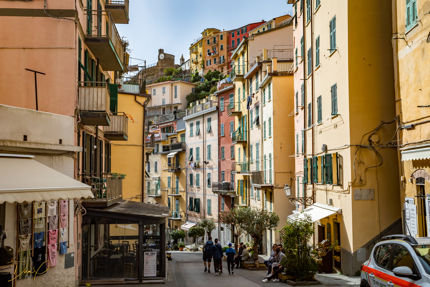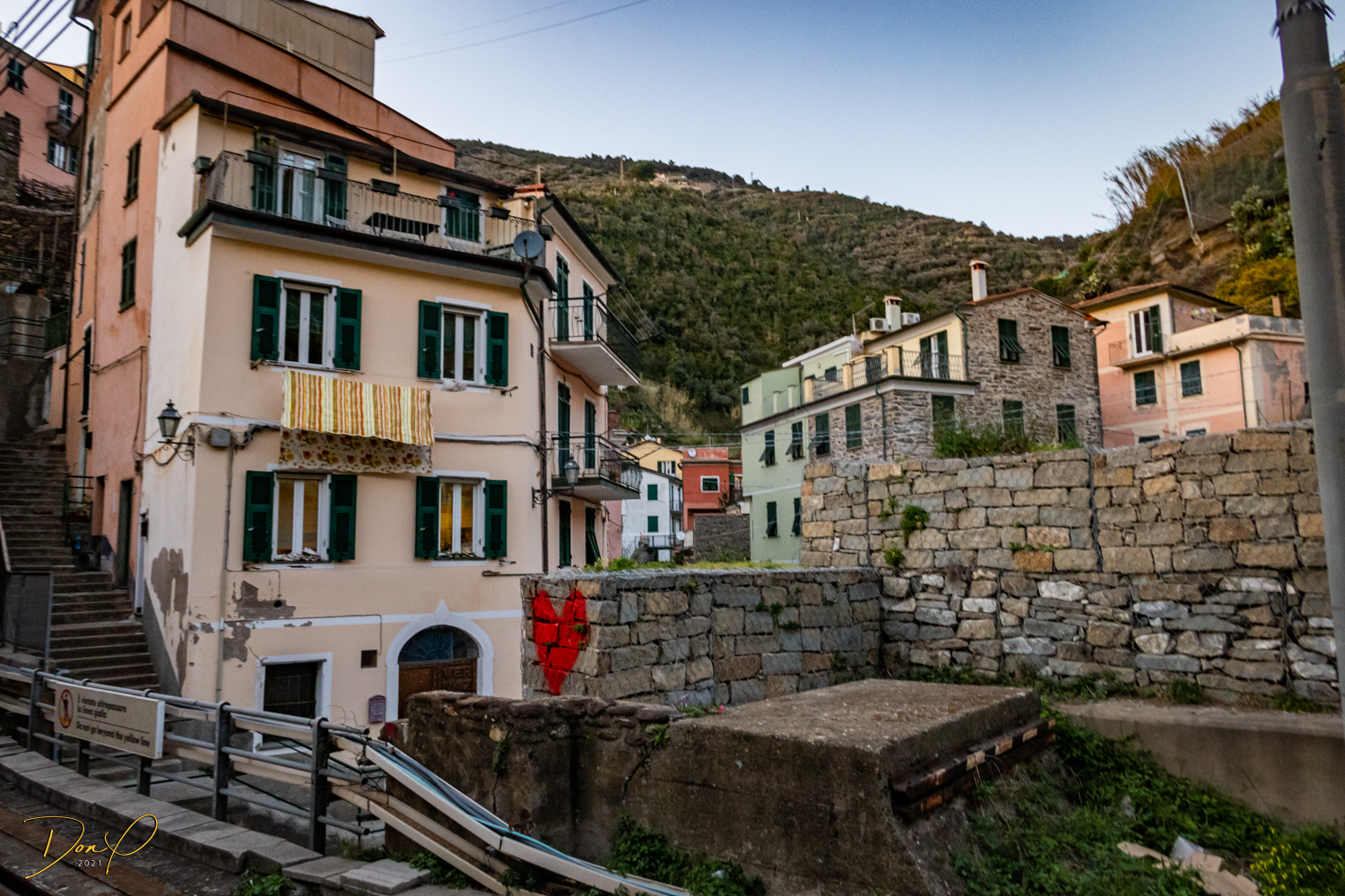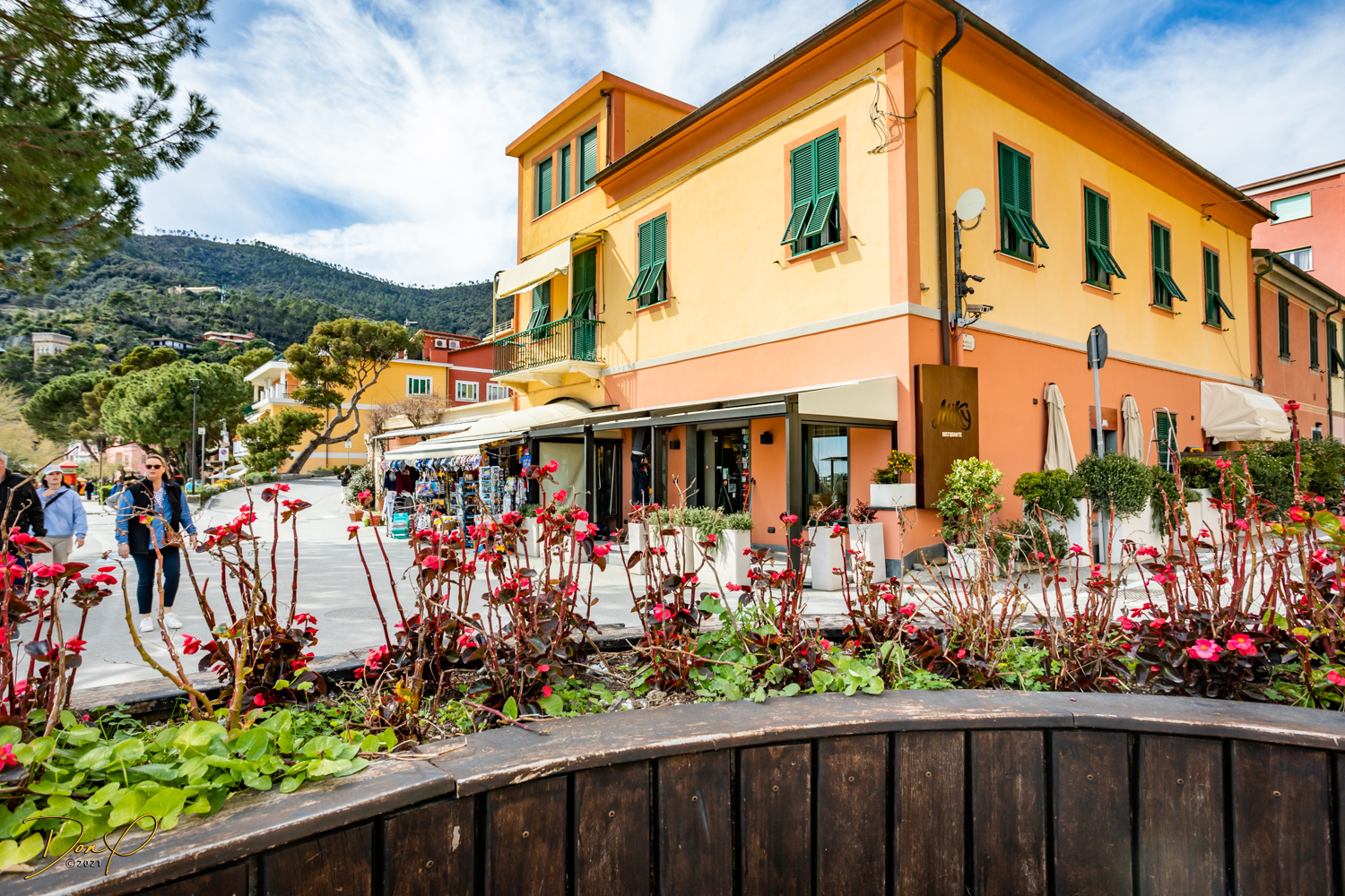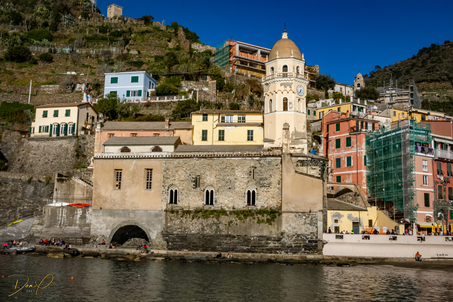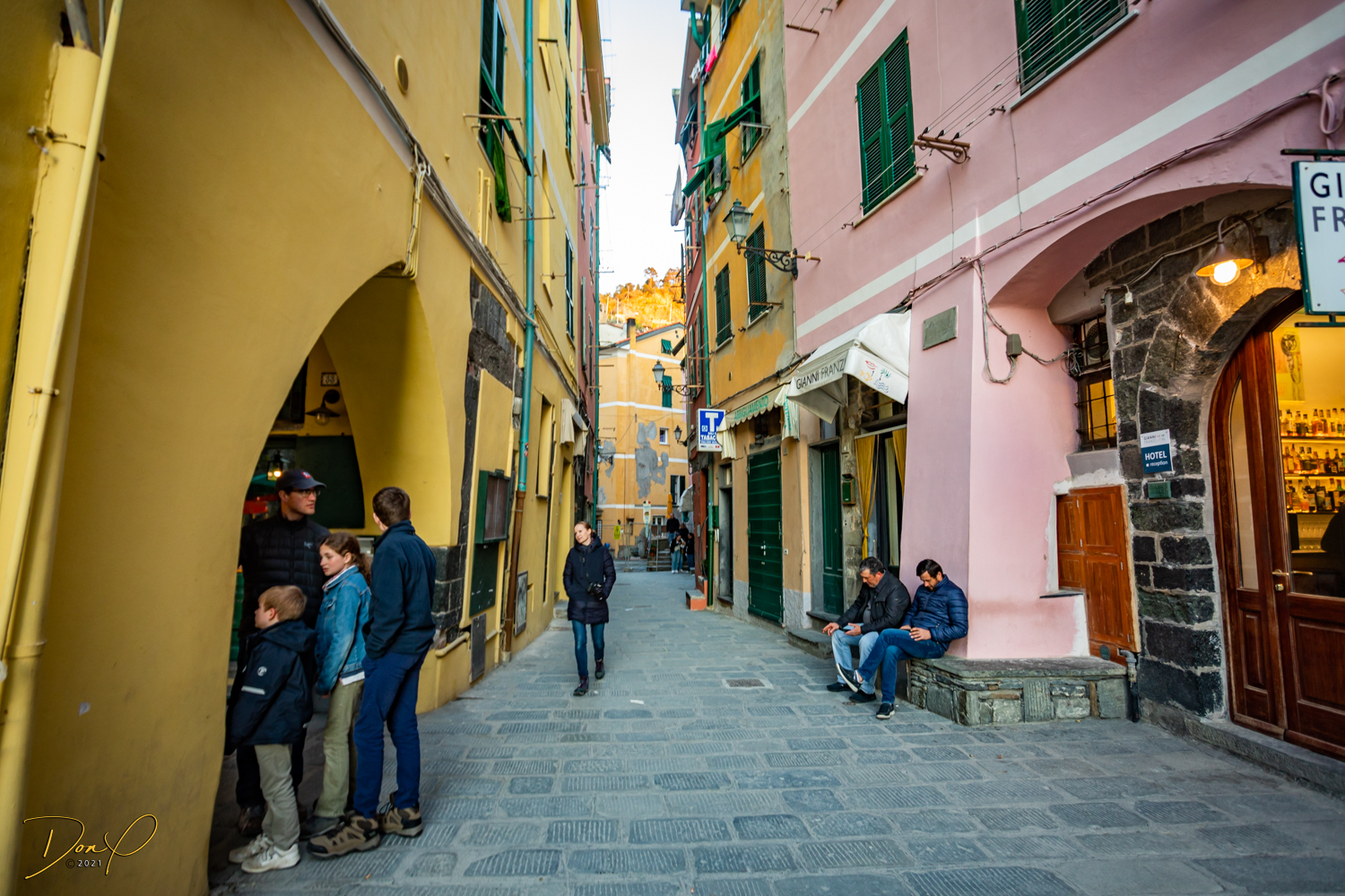 I make my way down and back up to Elee and I take some shots that she has of the other side. Then we work our way out of the Marina and back to the train station. We have the schedule figured out by now and we ride the train to Vernazza next. This is another Village that we are told has good views. We disembark and the trail is clear. Walk downhill. Picturesque buildings all the way! The views are fabulous as we walk down. We take our time to try and help Elee’s knees. I see Tylenol in both of our future evenings!