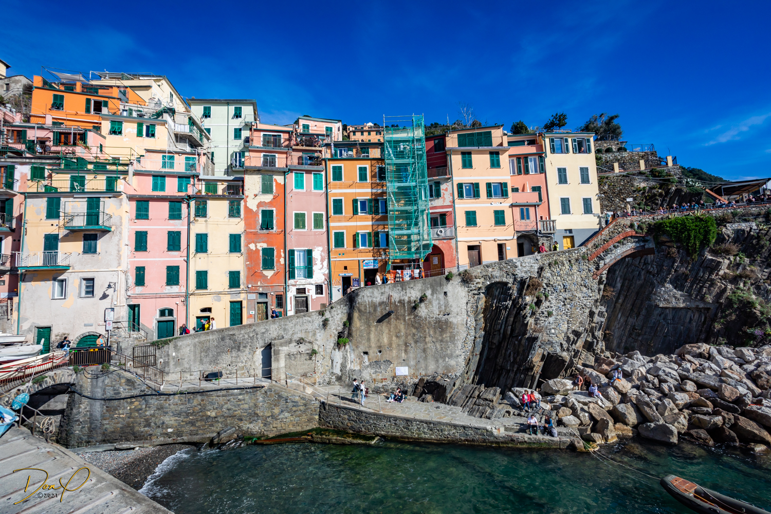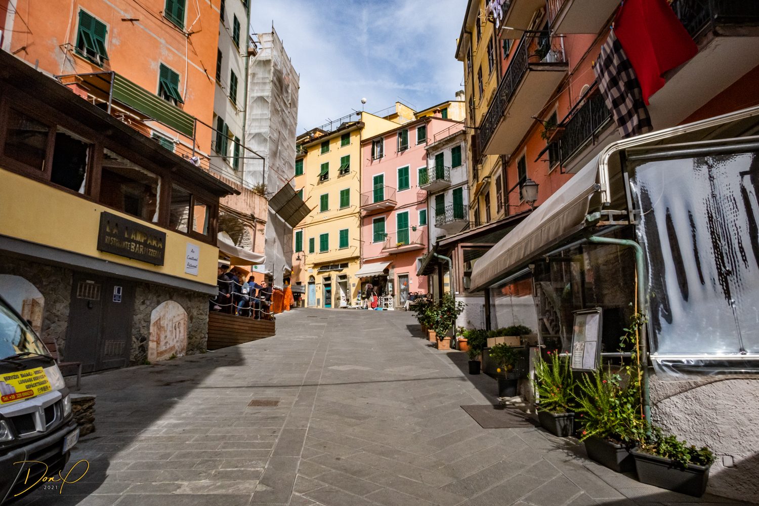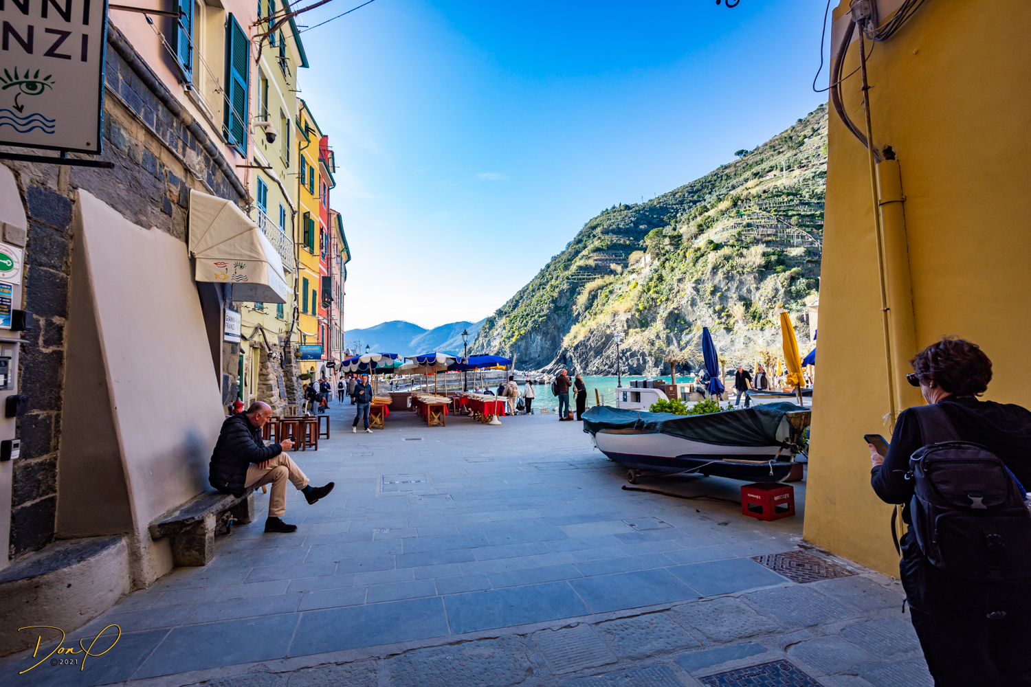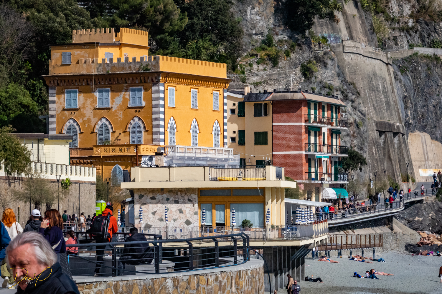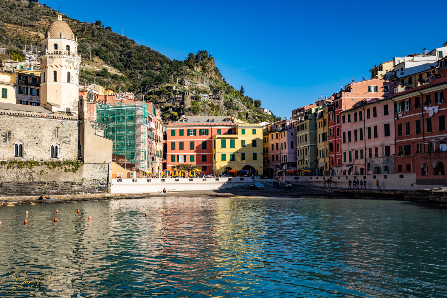 I make my way down and back up to Elee and I take some shots that she has of the other side. Then we work our way out of the Marina and back to the train station. We have the schedule figured out by now and we ride the train to Vernazza next. This is another Village that we are told has good views. We disembark and the trail is clear. Walk downhill. Picturesque buildings all the way! The views are fabulous as we walk down. We take our time to try and help Elee’s knees. I see Tylenol in both of our future evenings!