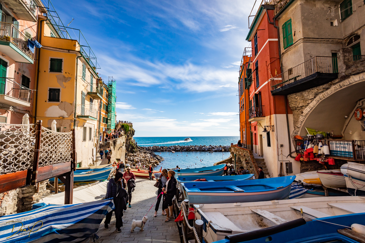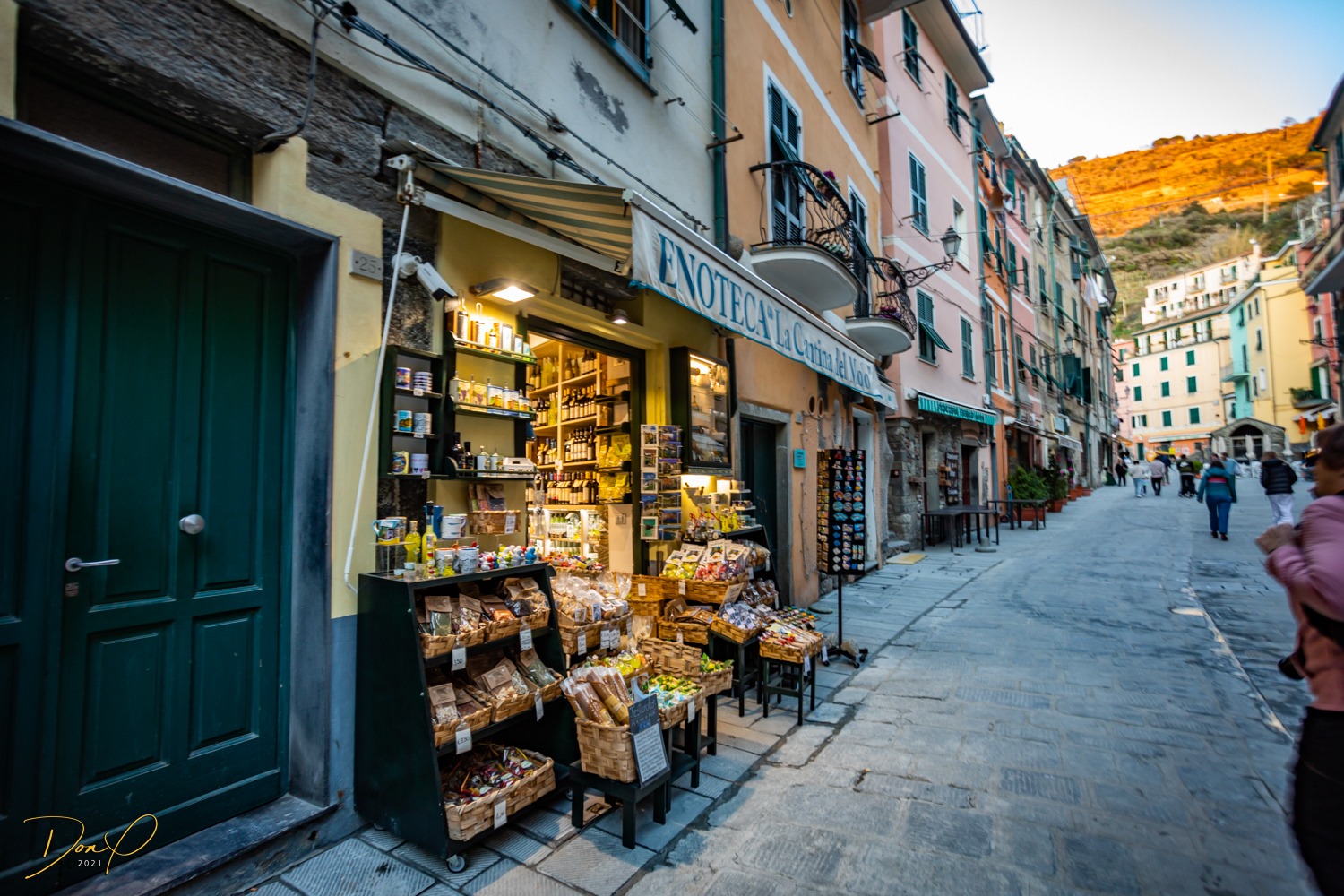 Riomaggiore is a much more picturesque village and we walk uphill through the steep town, taking photos along the way. But we see post card stands along the way with some iconic photos that everybody has seen of this place and wonder where they were taken. Elee take a post card into a store and asks where the picture is. She is told it is taken at the “Marina”. We spotted signs for the Marina at the train station and we head back that way. Sure enough, we see arrows pointing us to the Marina!