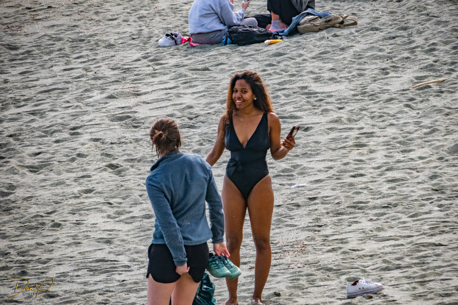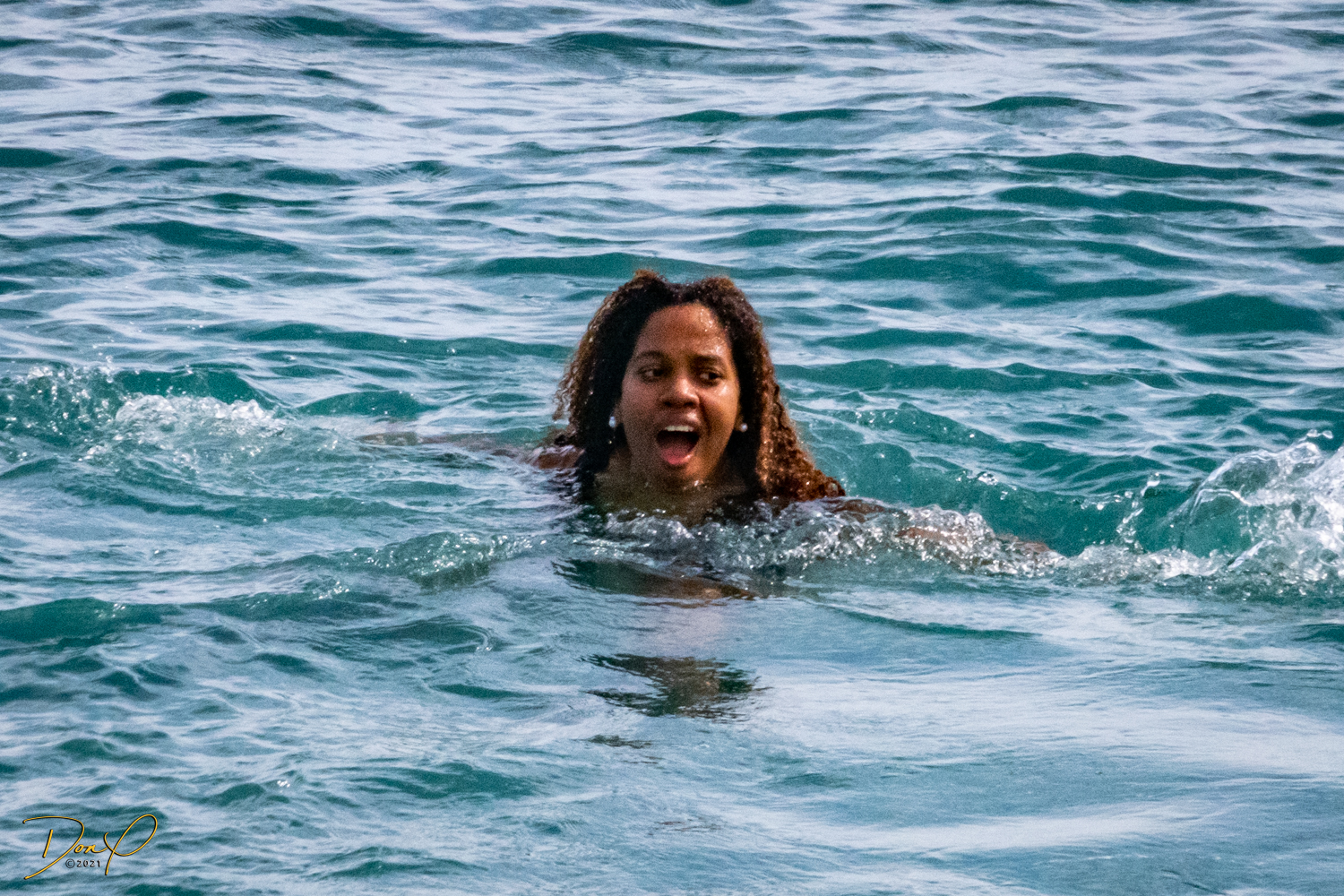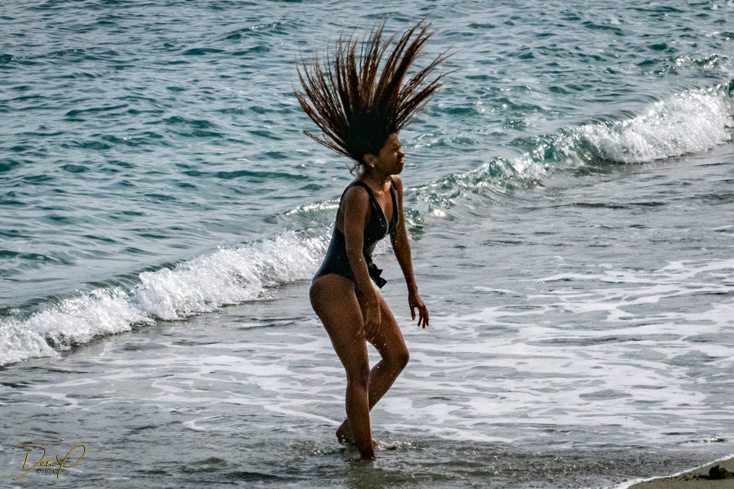 So here we are walking the boardwalks and street of the village and Elee looks over and says, “There’s our Brazilian friend about to go swimming!” So I quickly focus my fun zoom camera and there she is, setting up a camera at beach level and running into the surf. I don’t miss a shot and start shooting as she runs into the surf and back out, even doing the famous “Hair Flip”!