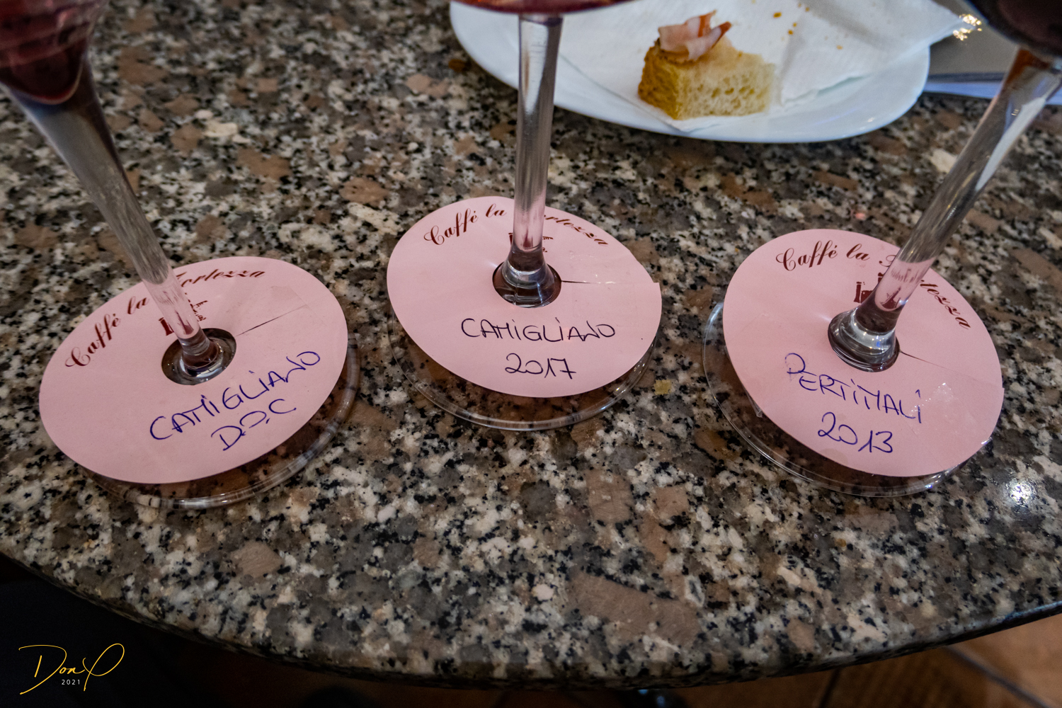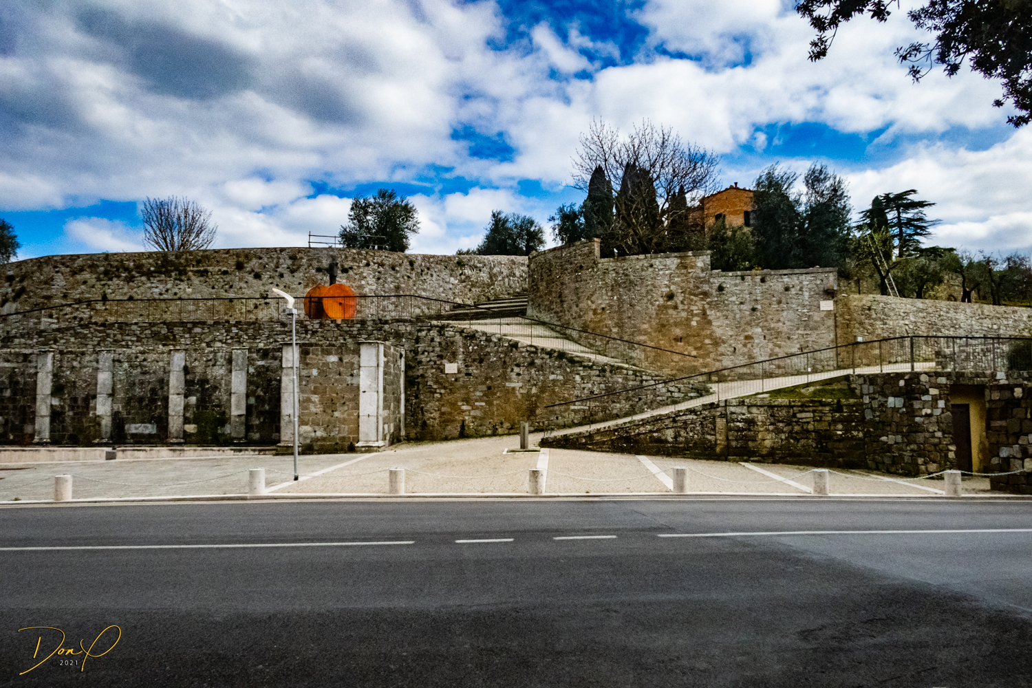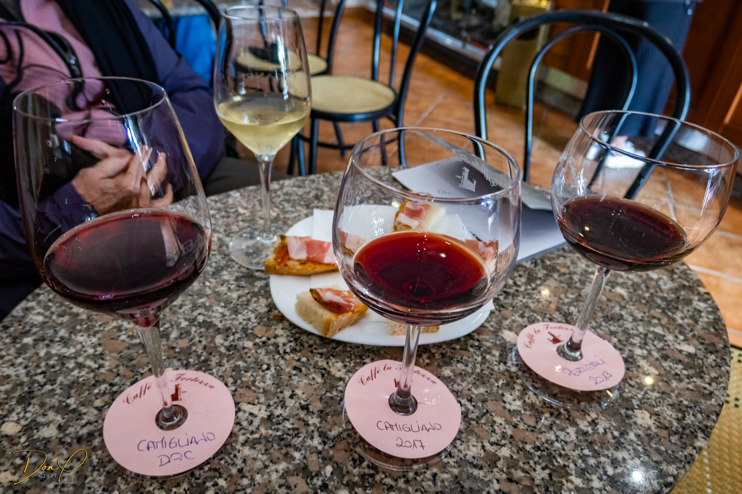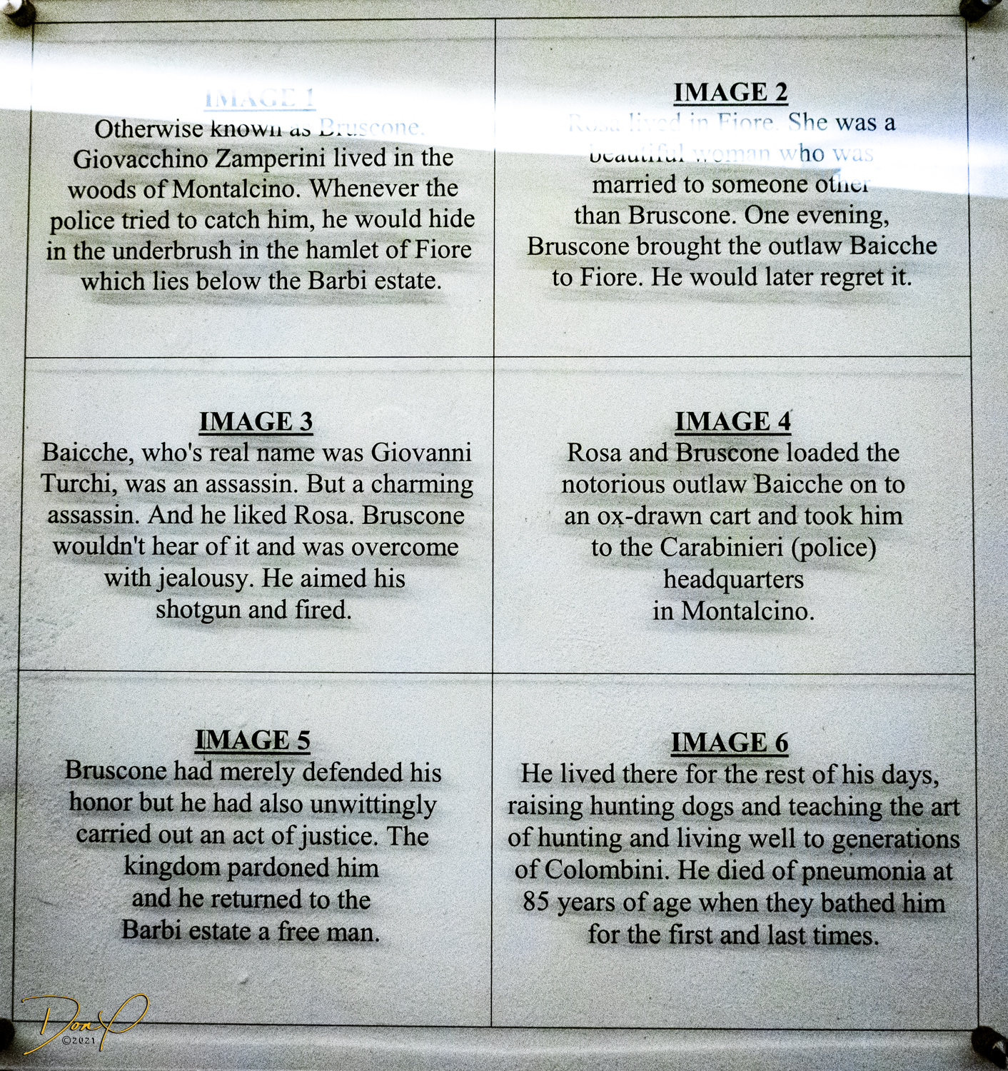 We drive on and find ourselves in the heart of town in Montalcino. we tour the Duomo we find there and acquire more ceiling photos, LOL. As we step out, we see a couple of people walking down a path from what looks like a castle and I ask them what is up there. “I don’t know, I am from Montelcino!” Hey wait, we are IN Montelcino! Oh well, shaking my head, we walk on. The Tramontana winds make it feel extremely cold here! We drive away again and soon find ourselves in Siena. Another interesting old little town! We find yet another place to have a wine tasting and we indulge again! Caffe di Fondesco!