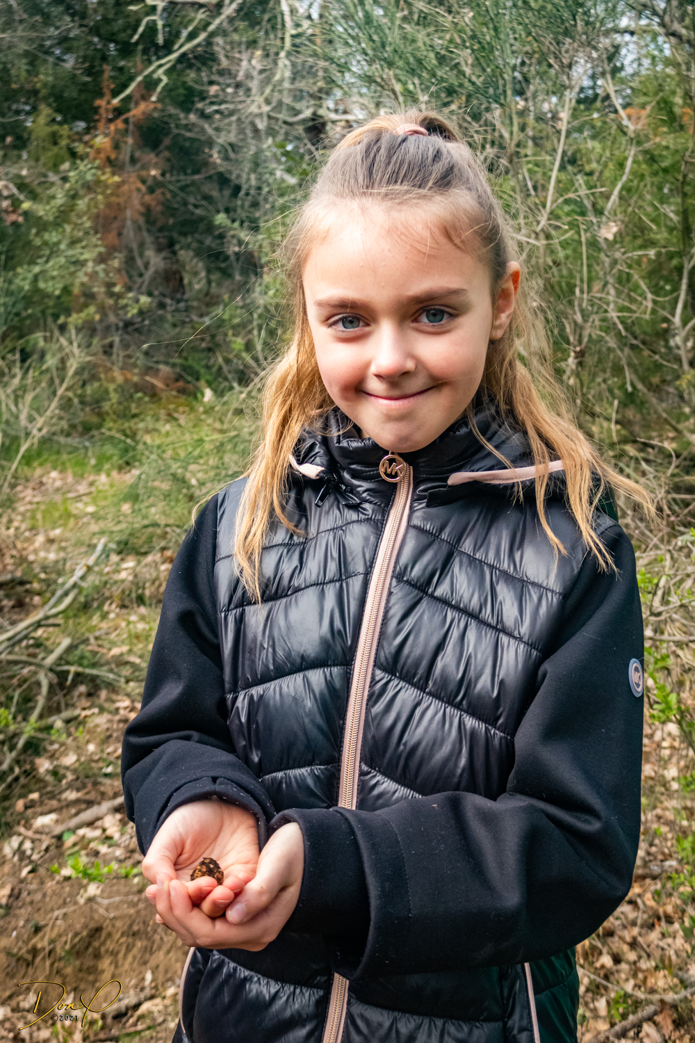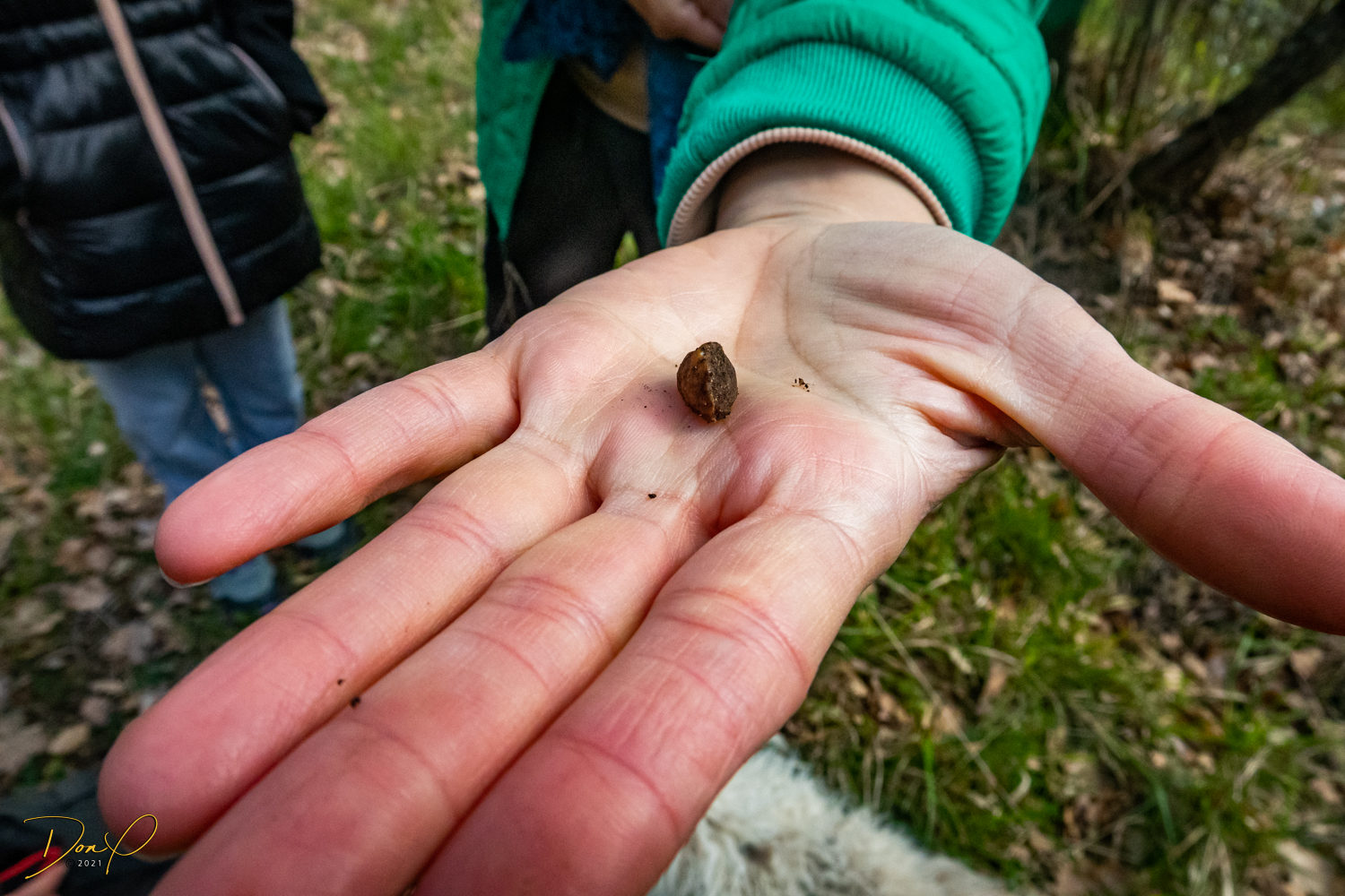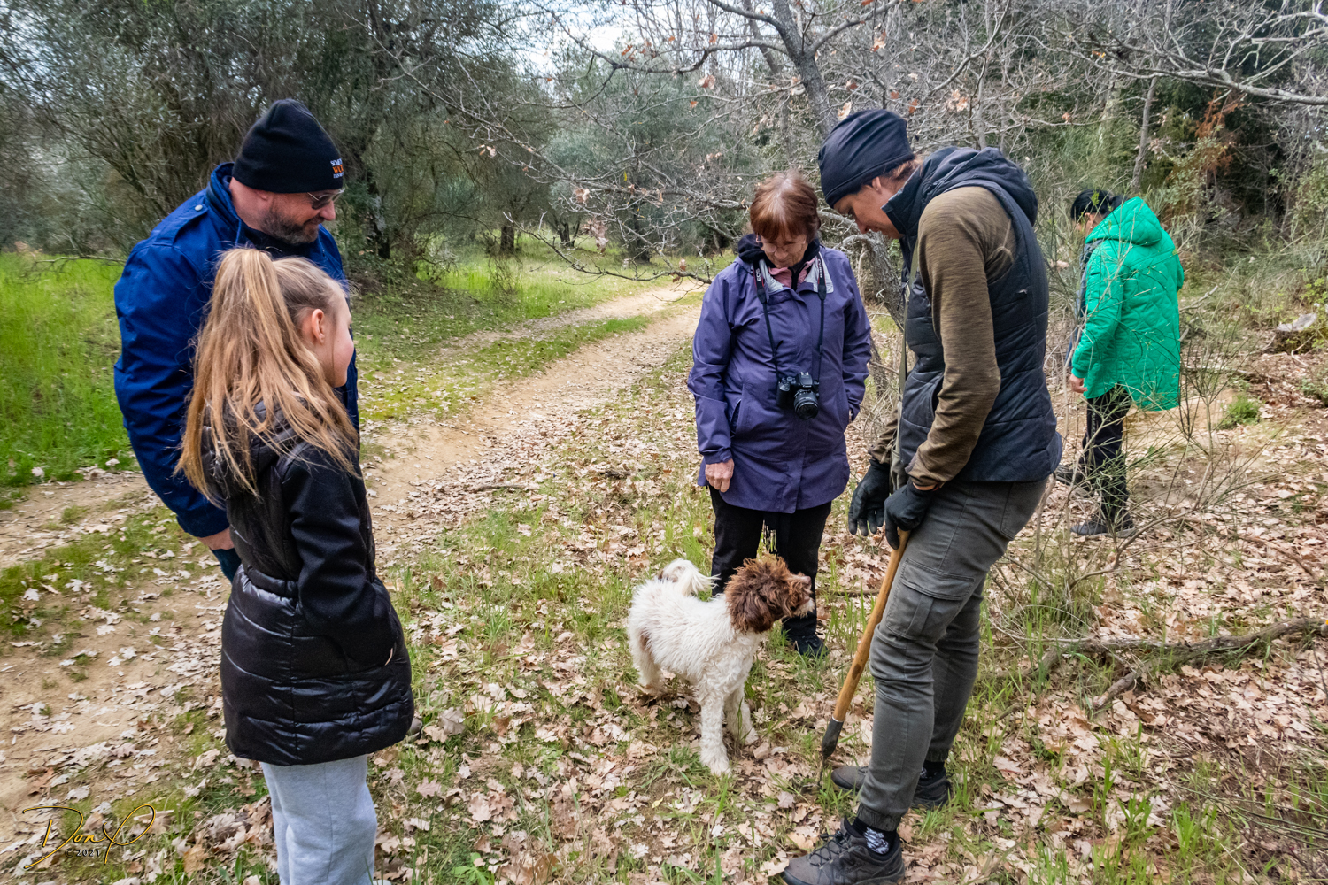 Promptly at 3PM, we meet Andrea, our Hunter, and only one other couple is with us with their 10 year old daughter. They are Leon, Vera and daughter Marie from Tarzana, CA, a mere hour drive from where we live! We’ll need to stay in touch! We follow Andrea down the road a kilometer or two and park. Andrea releases her truffle dog, Mia, but the dog answers to the name “Puppy” which is only a puppy but seems to know it’s stuff. We walk off into the woods following Puppy and soon enough, she is digging at the ground. Yes! A truffle! I will go into more depth on the kinds of truffles but for now, we have found truffles! All in all, the puppy finds 47 grams of truffles (as weighed later) which is about 23 Euros worth, plenty enough for dinner for 4! Our hunter throws in a black truffle she found this morning and we have 60 grams!