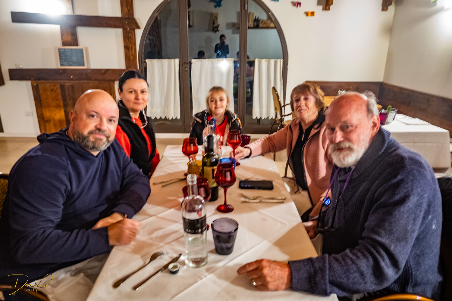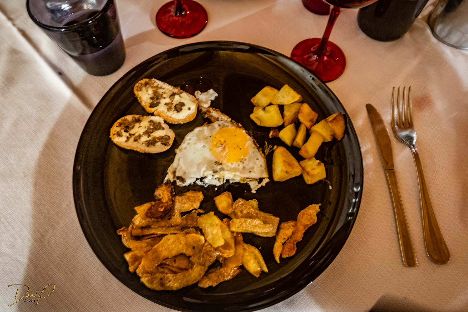 Andrea gives the truffles to our chef, Giovanna, for the evening, and we all agree to meet at 7:15PM for dinner. So we go back to our room and relax until then. We have a couple hours and I even get a nap in! We all meet at the agreed time and are ushered into the dining room and get seated at the table. Our truffle mates are a Russian couple, Leon, Vera and daughter Marie, that happen to live in Tarzana, CA and we get along famously! So much so that those of you that live local to us may even get to meet them one day as they are now on our invite list!