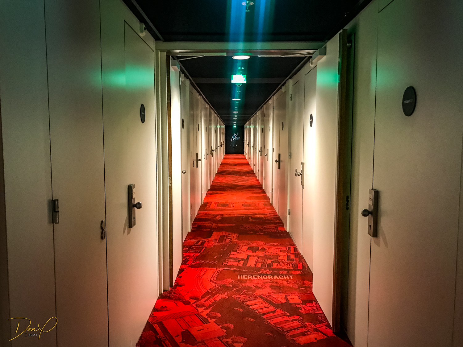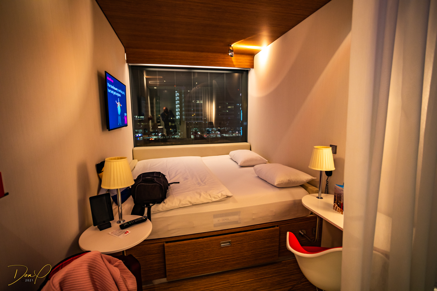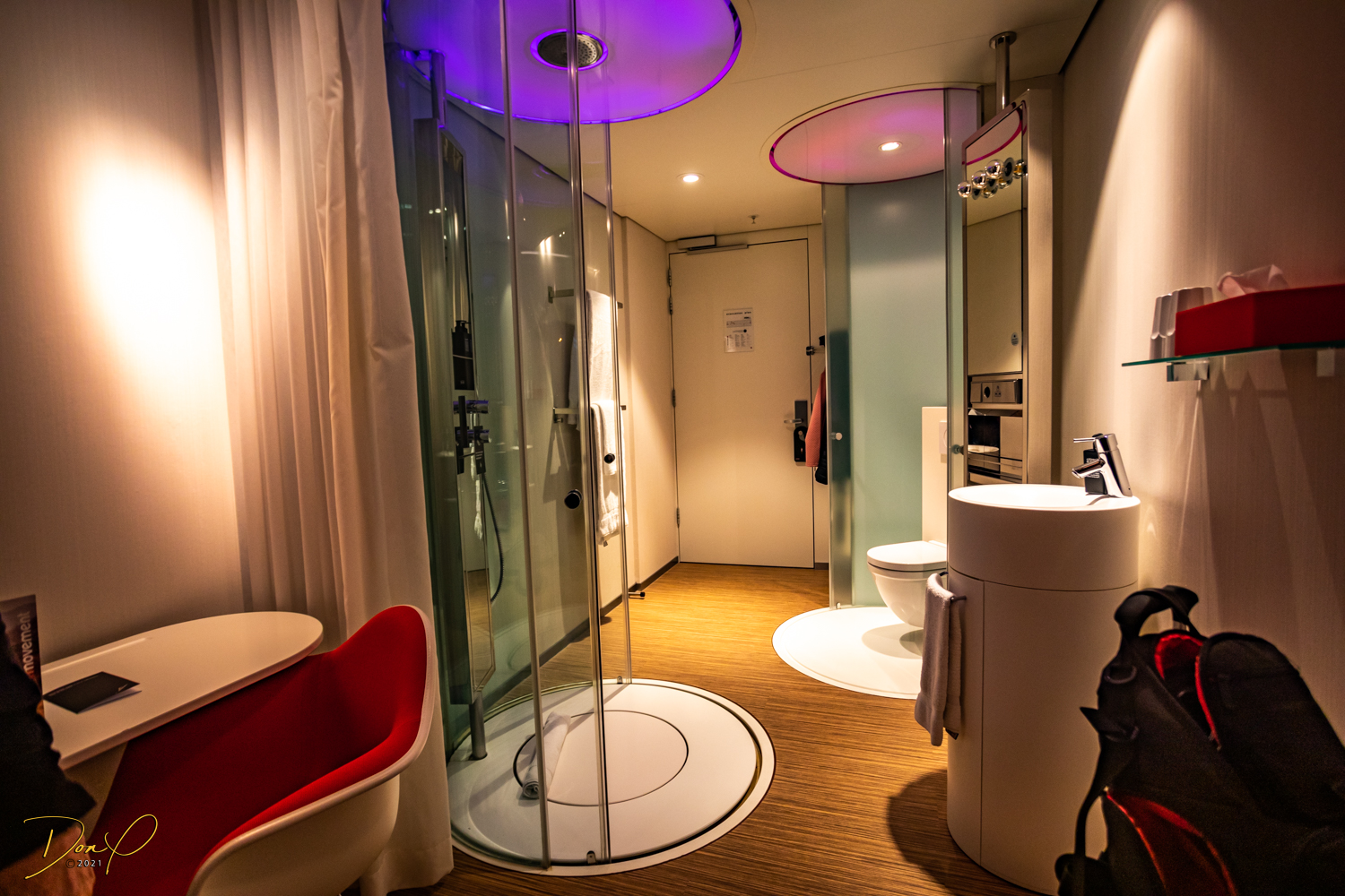 The flight is uneventful for all of 2 hours and we land in Amsterdam around 10 PM. We have a hotel at the airport that we have stayed at before. It is a bit pricey but we have 11 hours and will get to sleep 6 of them! It has a modern art designed lobby that entertains our cameras for a bit! We get a couple glasses of wine to take to our cubicle room in the Citizen M Hotel. And it IS a cubicle!