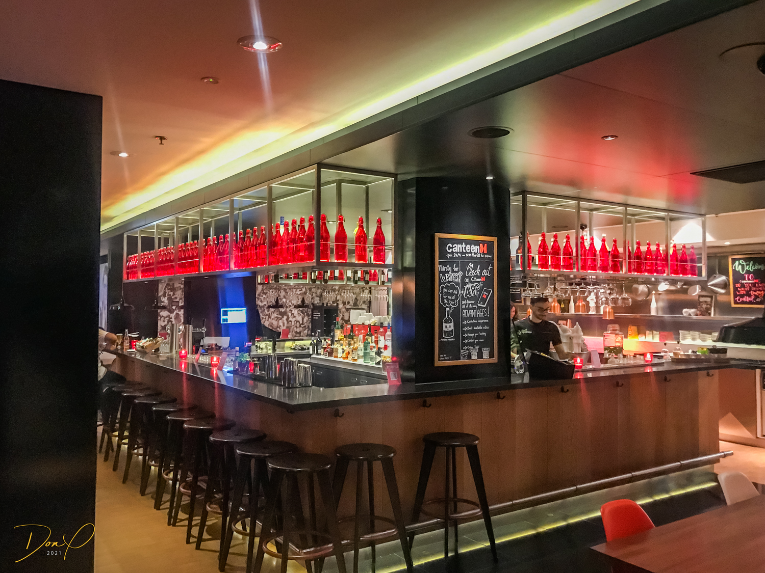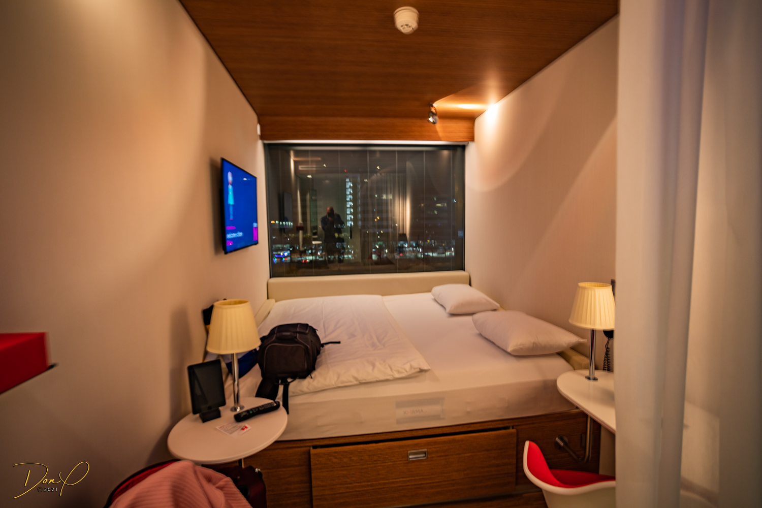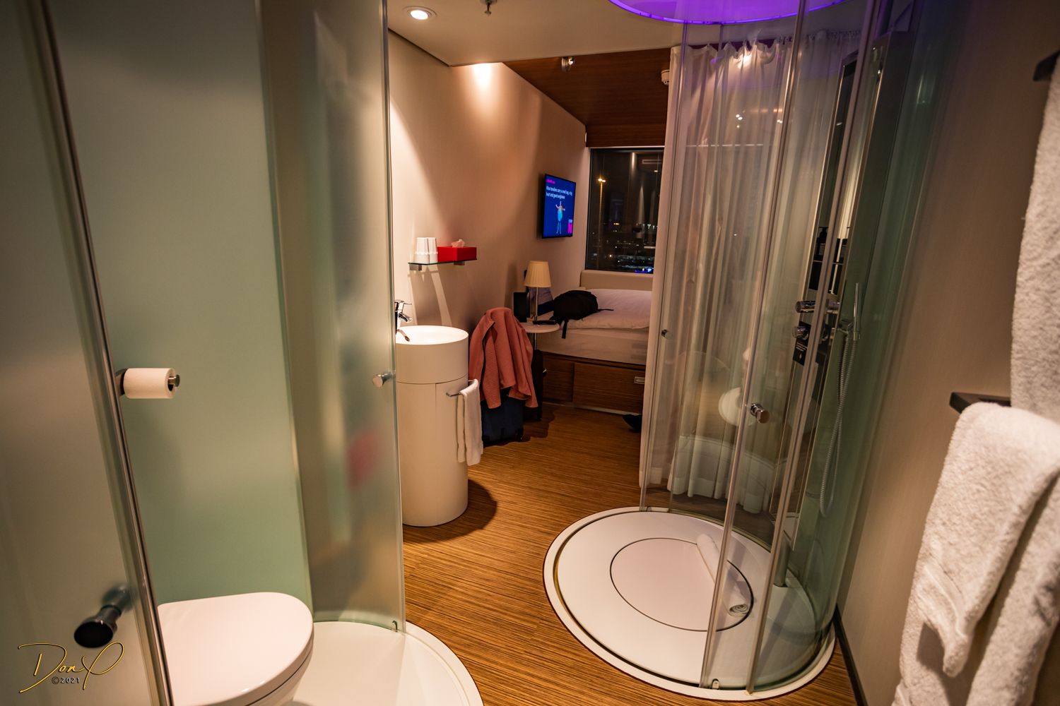 The flight is uneventful for all of 2 hours and we land in Amsterdam around 10 PM. We have a hotel at the airport that we have stayed at before. It is a bit pricey but we have 11 hours and will get to sleep 6 of them! It has a modern art designed lobby that entertains our cameras for a bit! We get a couple glasses of wine to take to our cubicle room in the Citizen M Hotel. And it IS a cubicle!