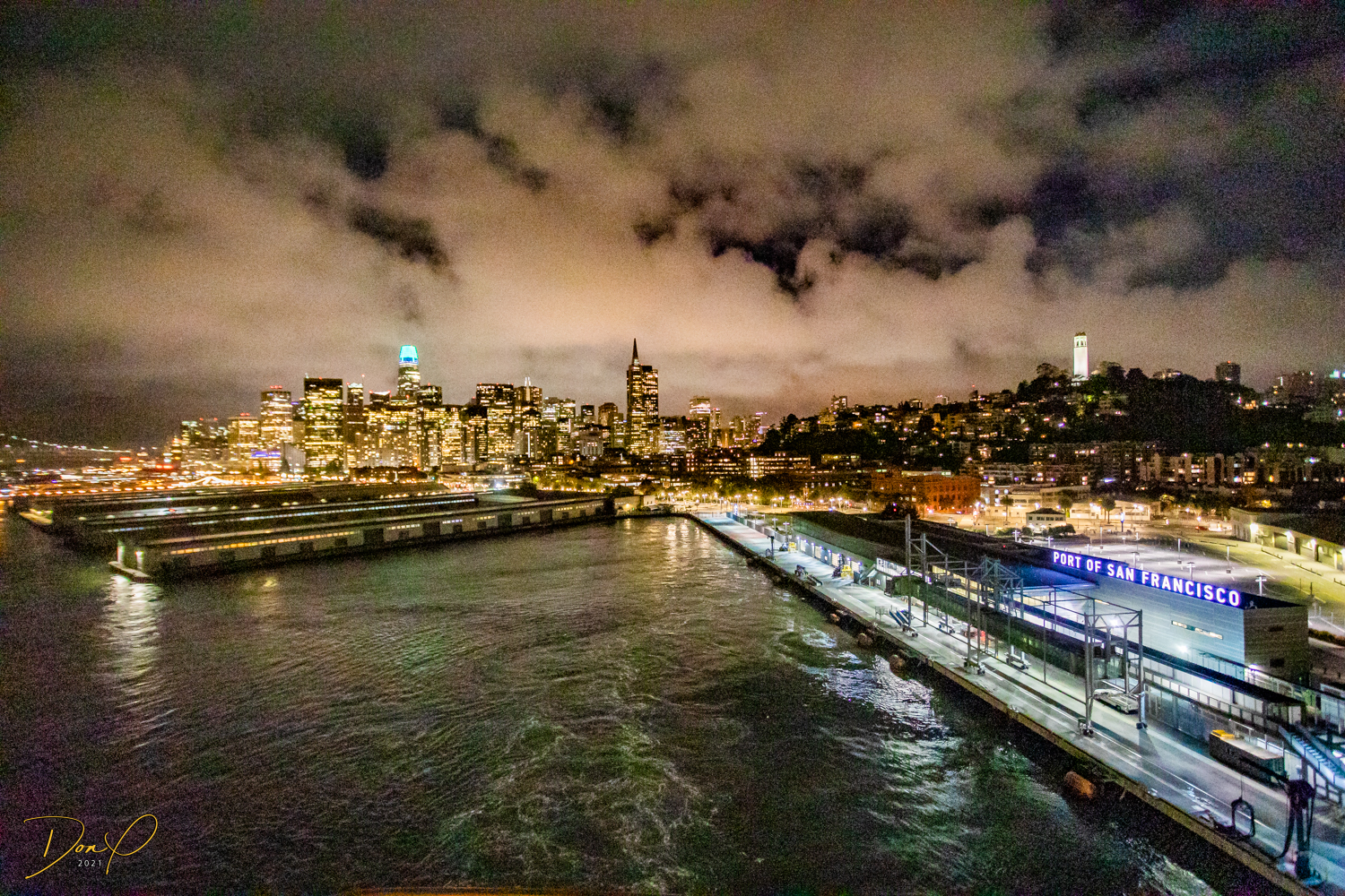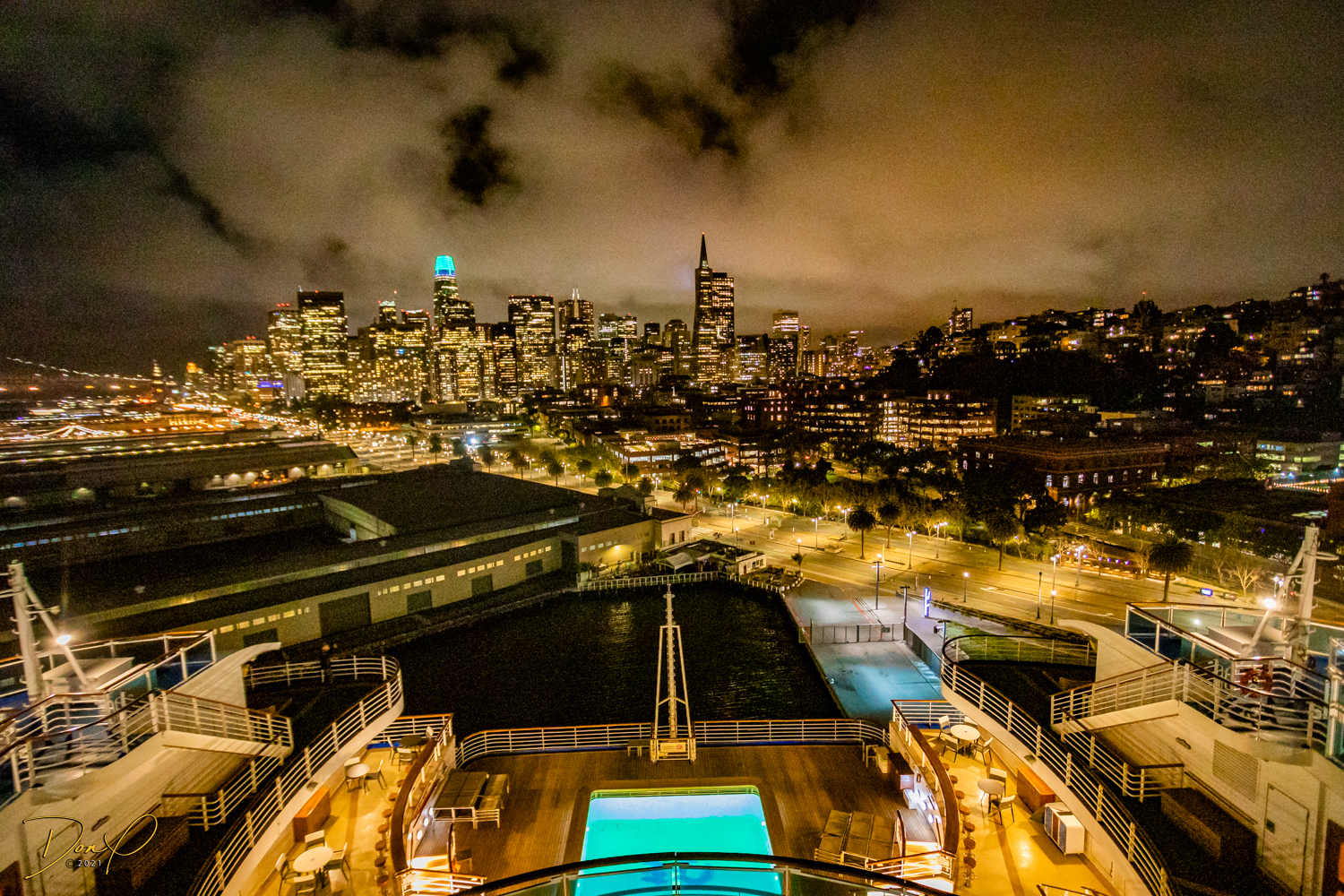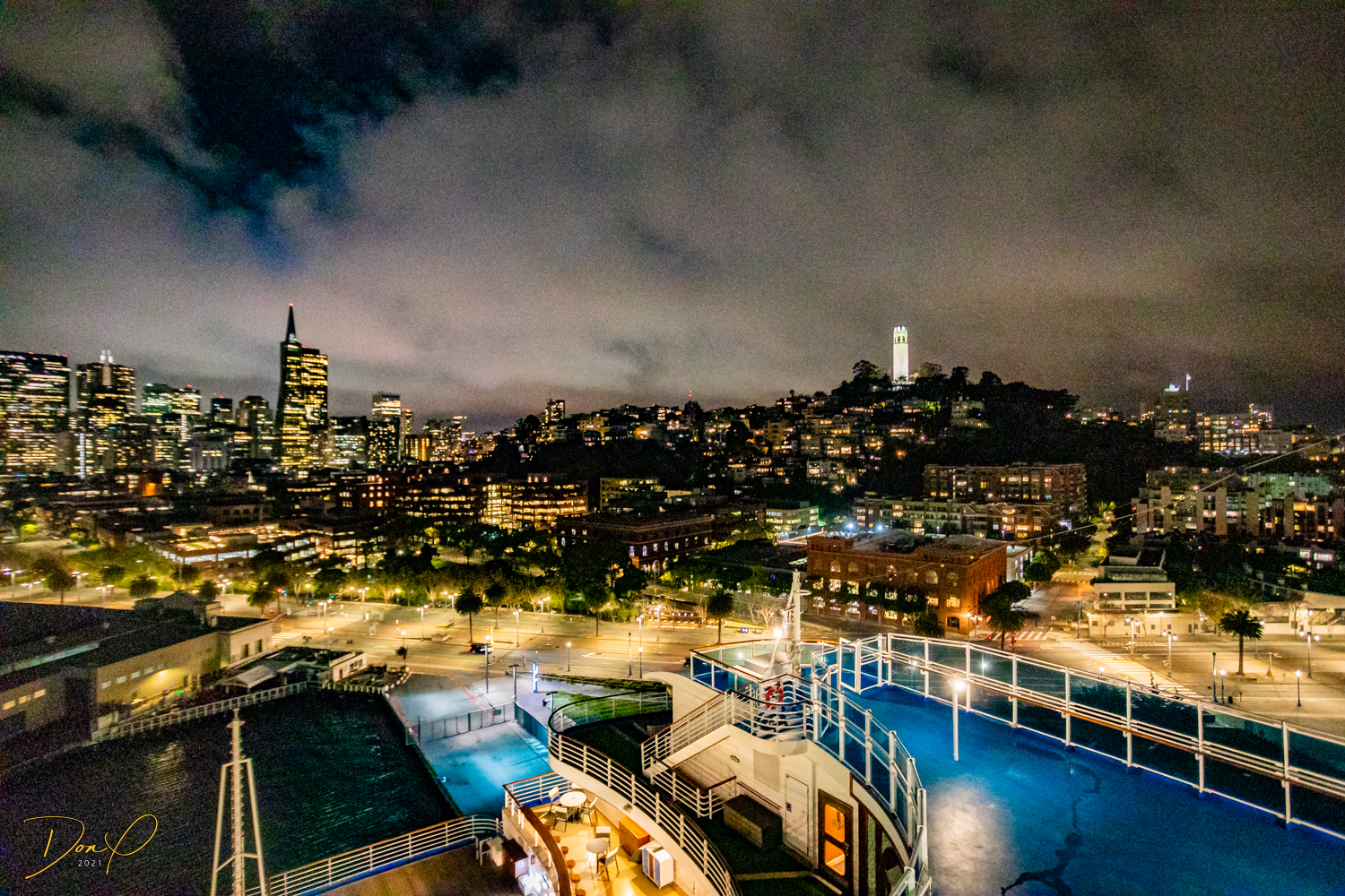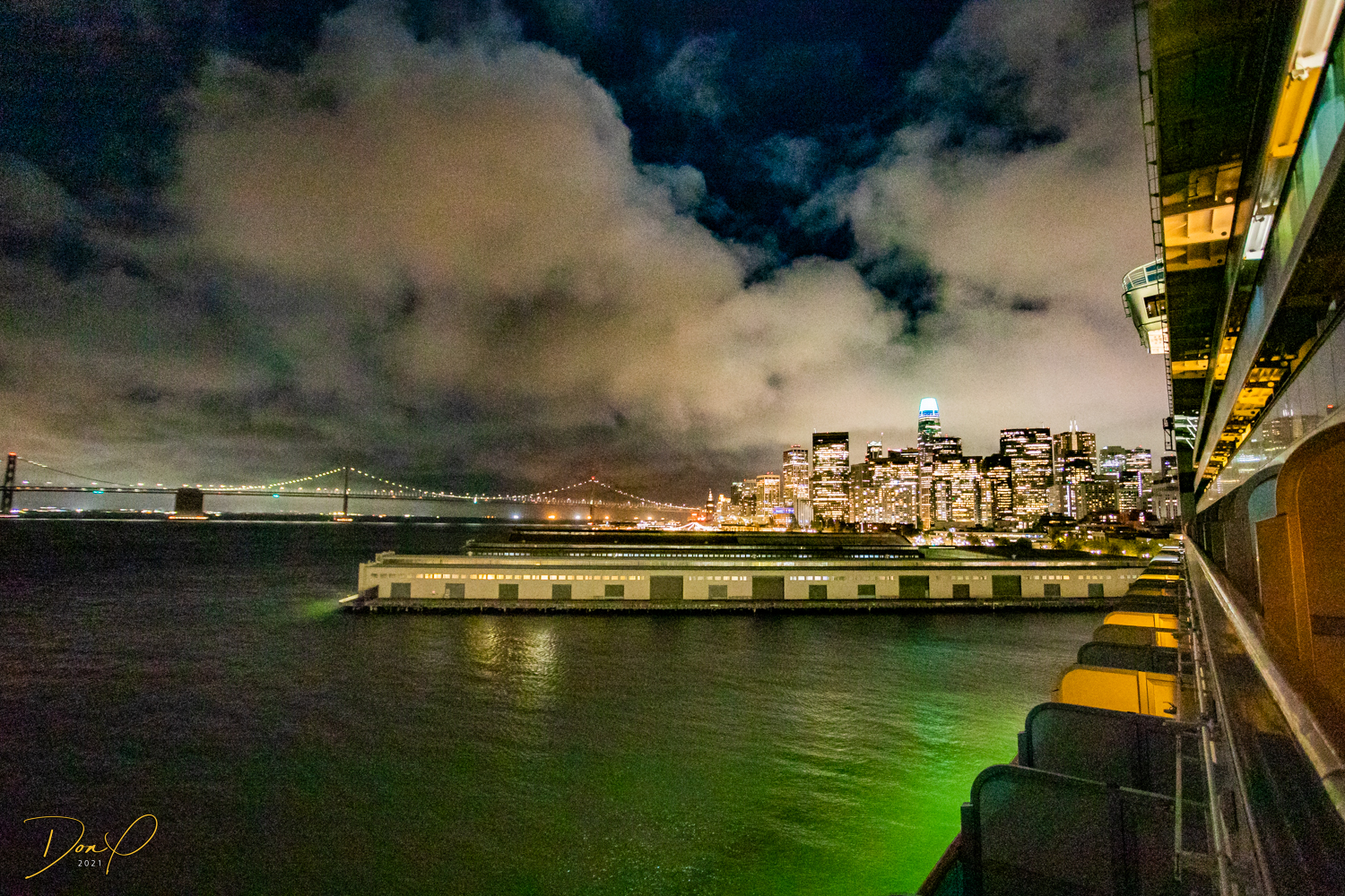 Back to the ship on shaky legs and we board. Dinner and a glass of wine and I can’t wait to lay my weary body down! But before I do, I go back up on deck for our departure from this famous City By The Bay! Of course I have to take photos of our departure at night!