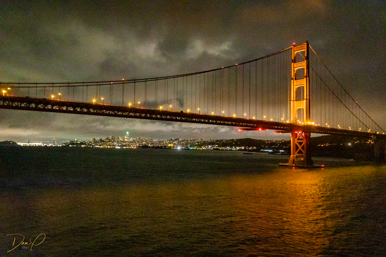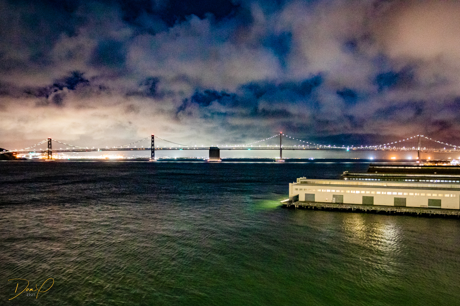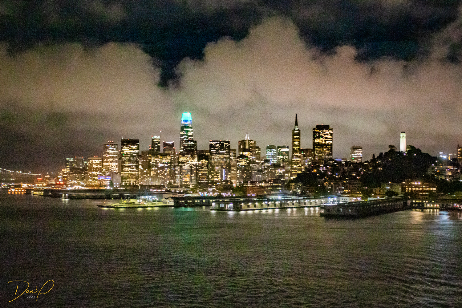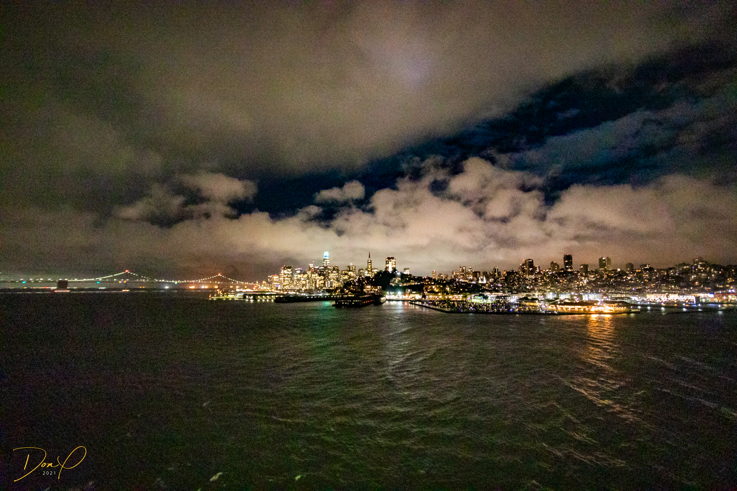 Back to the ship on shaky legs and we board. Dinner and a glass of wine and I can’t wait to lay my weary body down! But before I do, I go back up on deck for our departure from this famous City By The Bay! Of course I have to take photos of our departure at night!