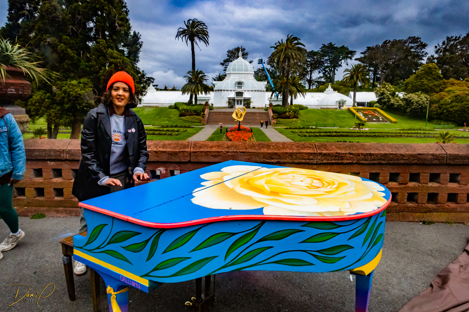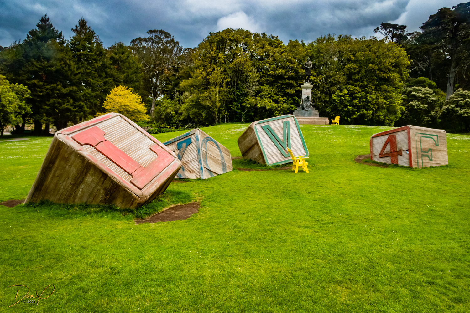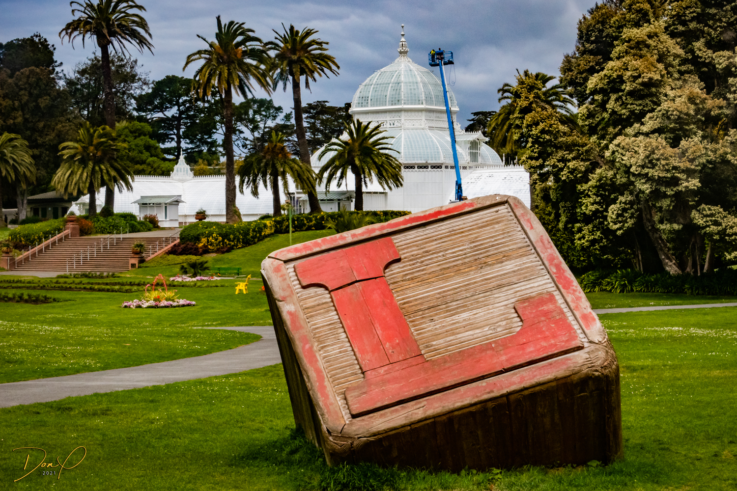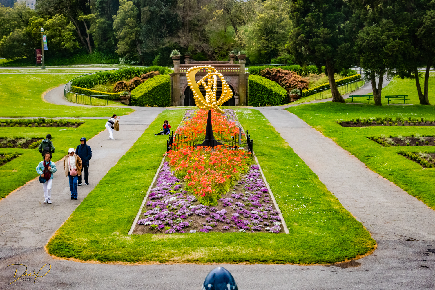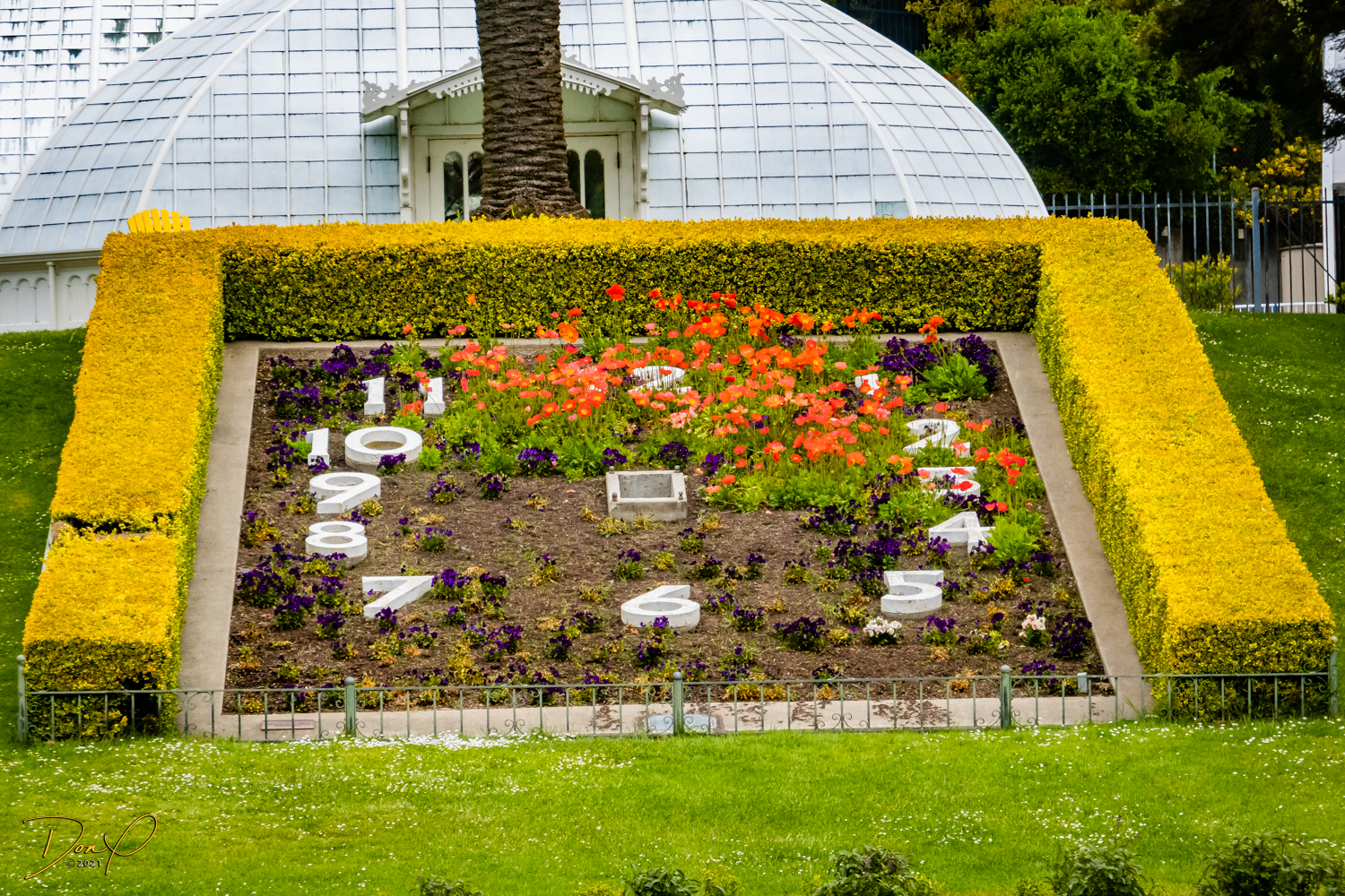 We cross back into the city on the bus and get off at Golden Gate Park. One place that is on our list. Eclectic artwork everywhere. Middle of the streets even! Chef Dog statues that we can’t explain. Walkways. Lawn displays everywhere. An enclosed Botanic Garden that is closed today. A florally painted piano that a local tourist played for me! A floral clock! And a message of love spelled out in large building blocks!