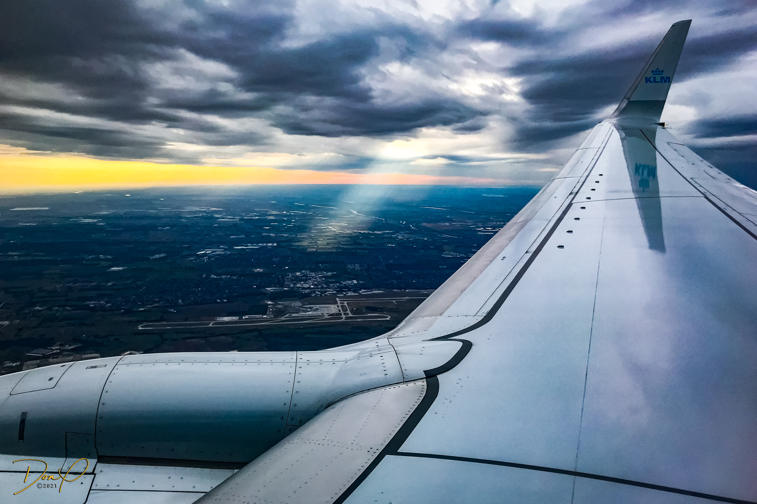Then Sunrise appears out the window! The angle from my window isn’t perfect but the deep blue sky dropping down the the glowing orange sunrise followed down by the deep blue sea is fun to watch. Pausing the movie to admire Mother Nature’s display over the Northern Oceans keeps my mind active and my senses full! So much for sleep! We have an uneventful landing in Schiphol (pronounced Shih-pole) Airport.