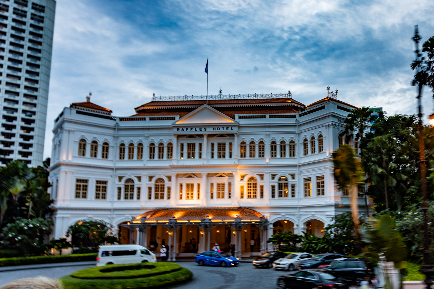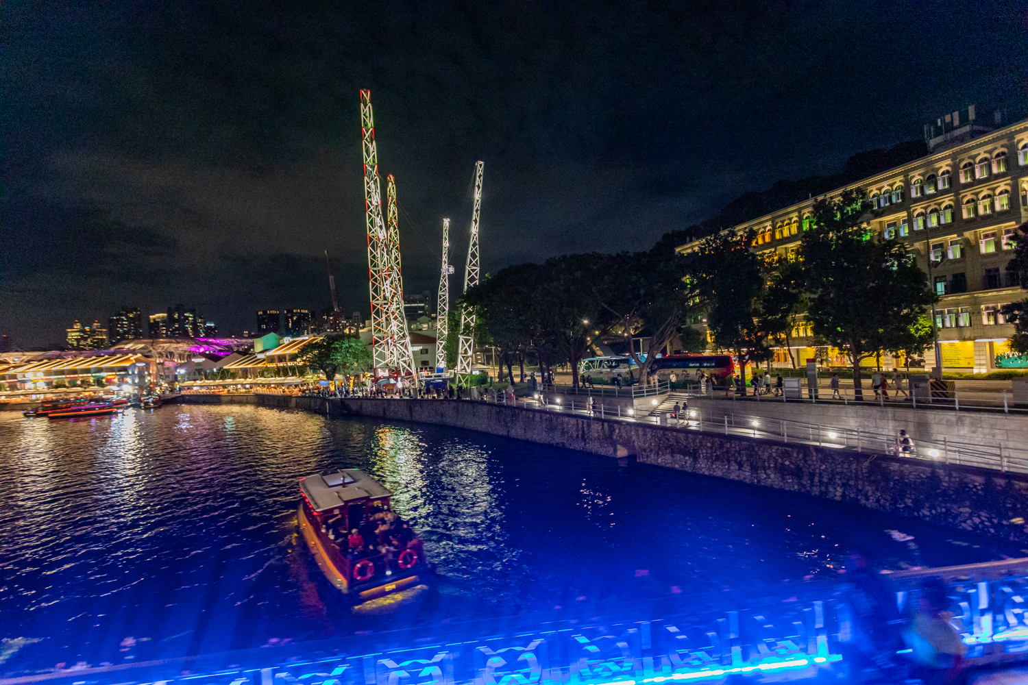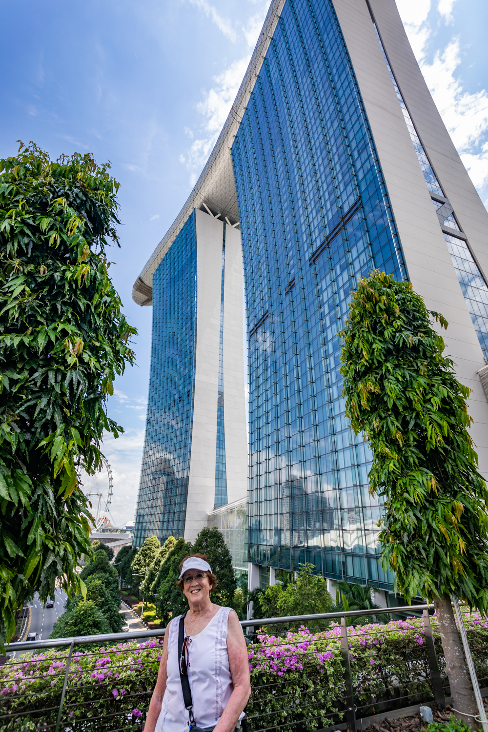First we get views around and near the hotel and from inside the hotel. The architecture is amazing! Then we pay the fee and ride the express elevator up and step out on the “boat” end of the top level and the views of the city are amazing! This place is all that it is rated to be! And while at the top, we find a drink vendor selling, wait for it… Singapore Slings! Invented here! Albeit invented at a place called the “Raffles Hotel”, nevertheless in Singapore! So, of course we imbibe!