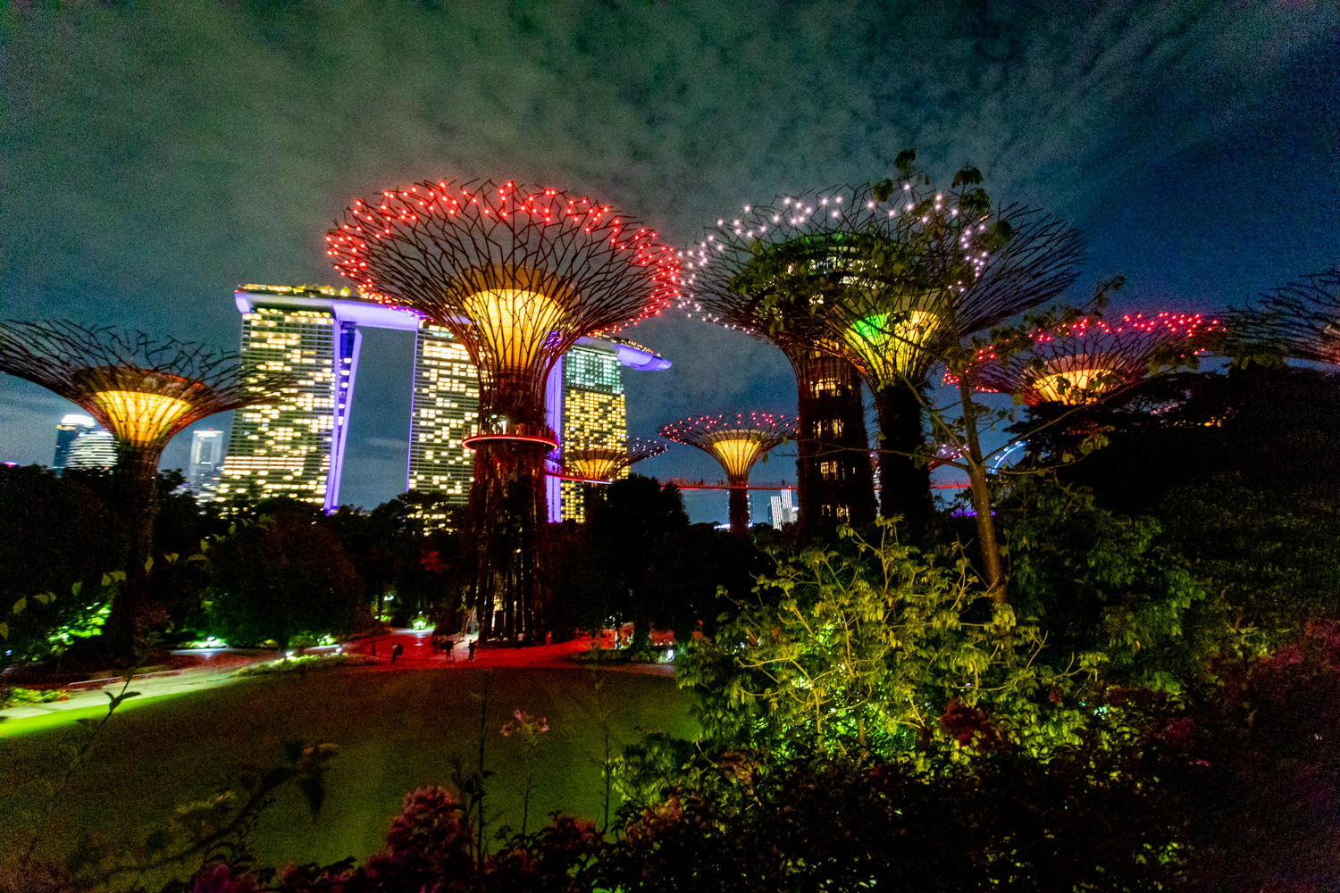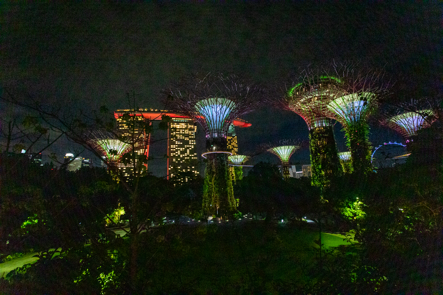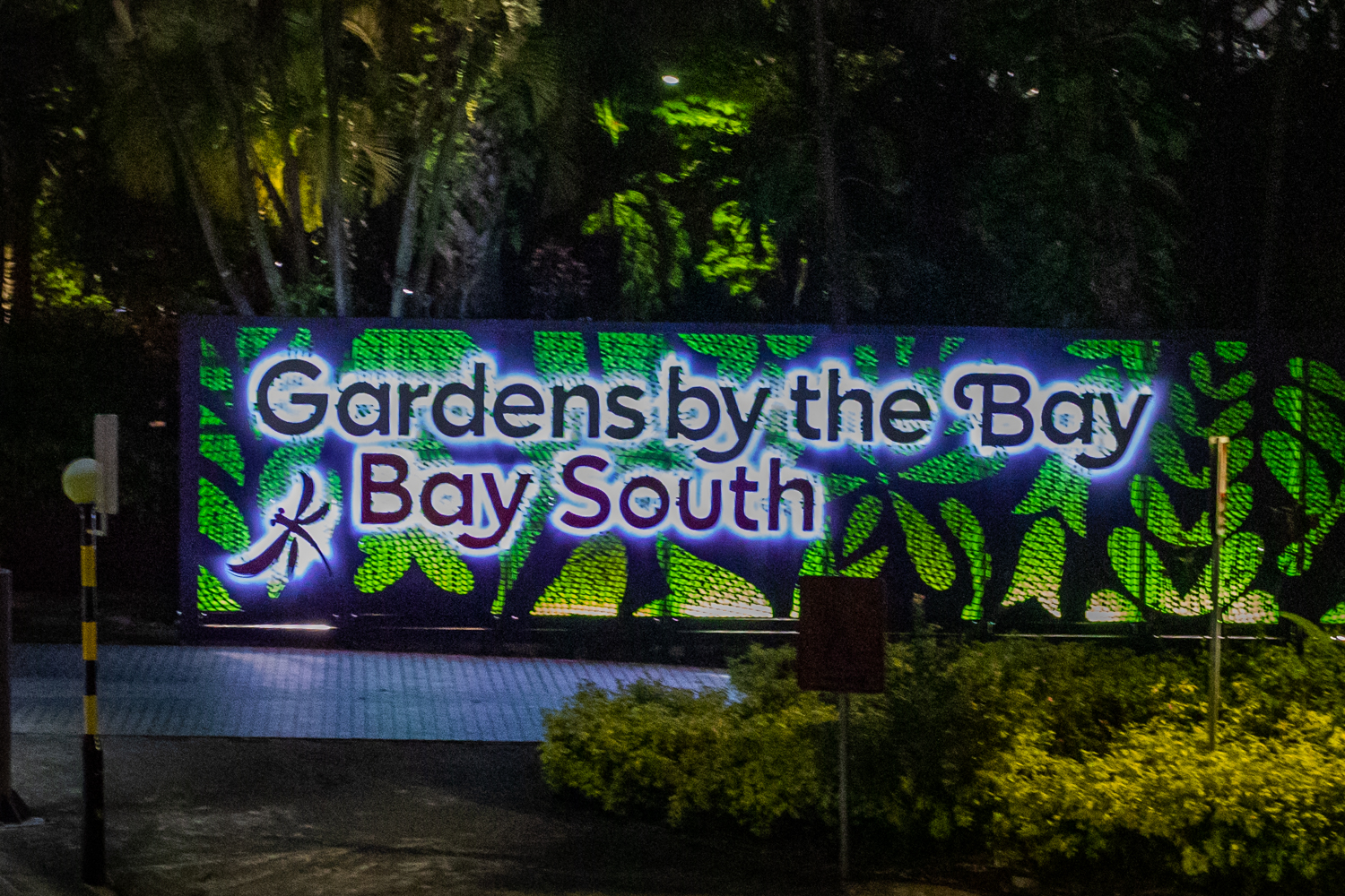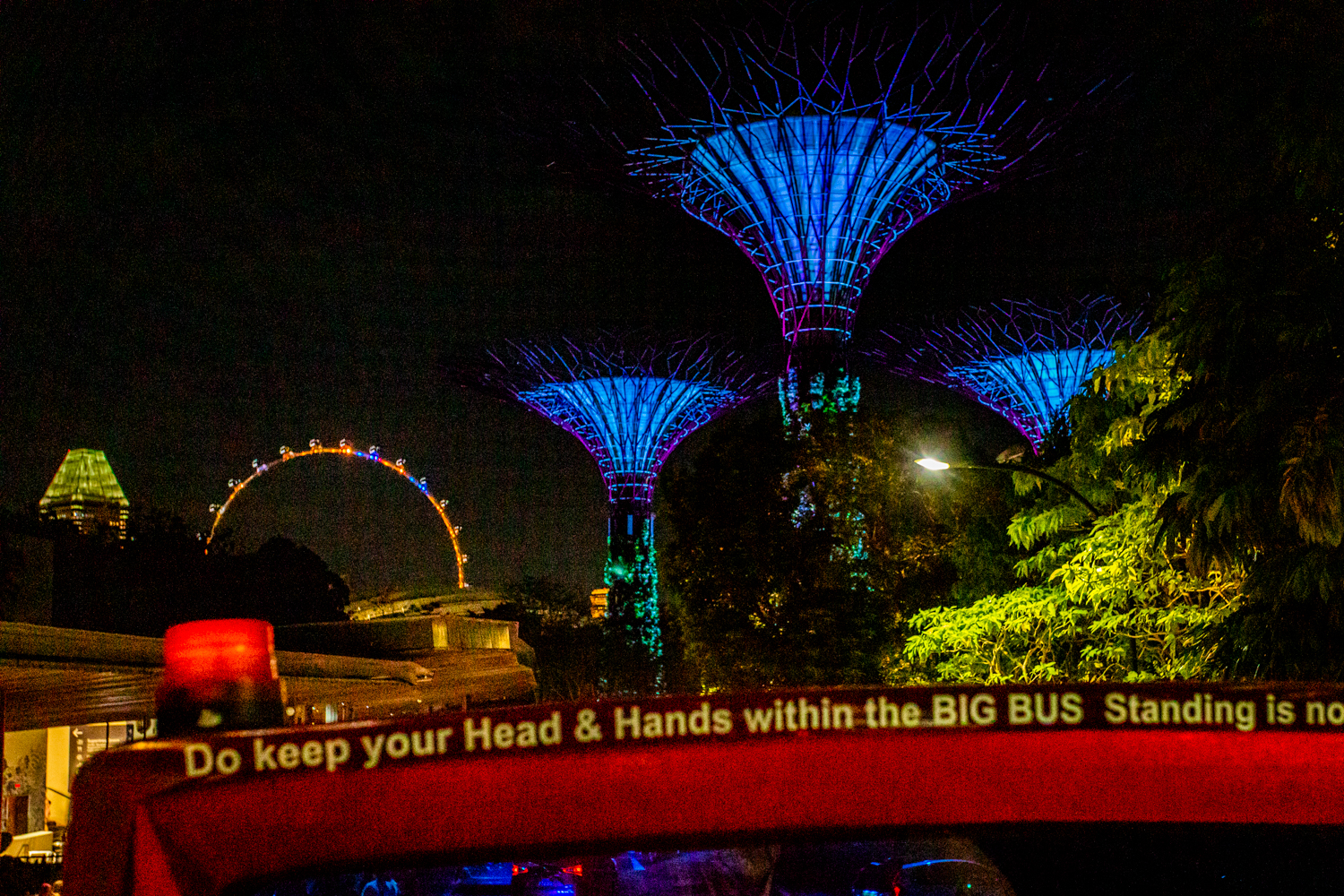 We head back to the HO HO Bus (Hop On, Hop Off Bus for those that have missed earlier blog posts) and arrive right as a bus arrives! Fantastic timing! We board and secure top row seats with a view and ride it for most of an hour which gives us more time to relax our feet and legs that, in turn is a good thing! We arrive at the bus hub and join the queue to have a night tour of the “Garden By The Sea” and the “Marina Bay Sands Hotel” and a promised “Light Show”! I am a bit disconcerted by the length of the queue as I wonder how we can get top row seats for the tour. And we are early to join the queue.
