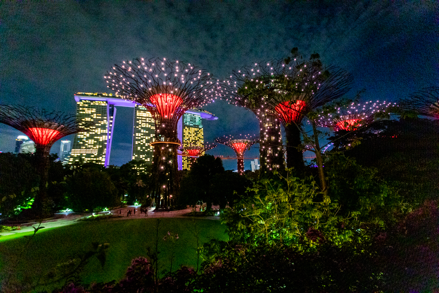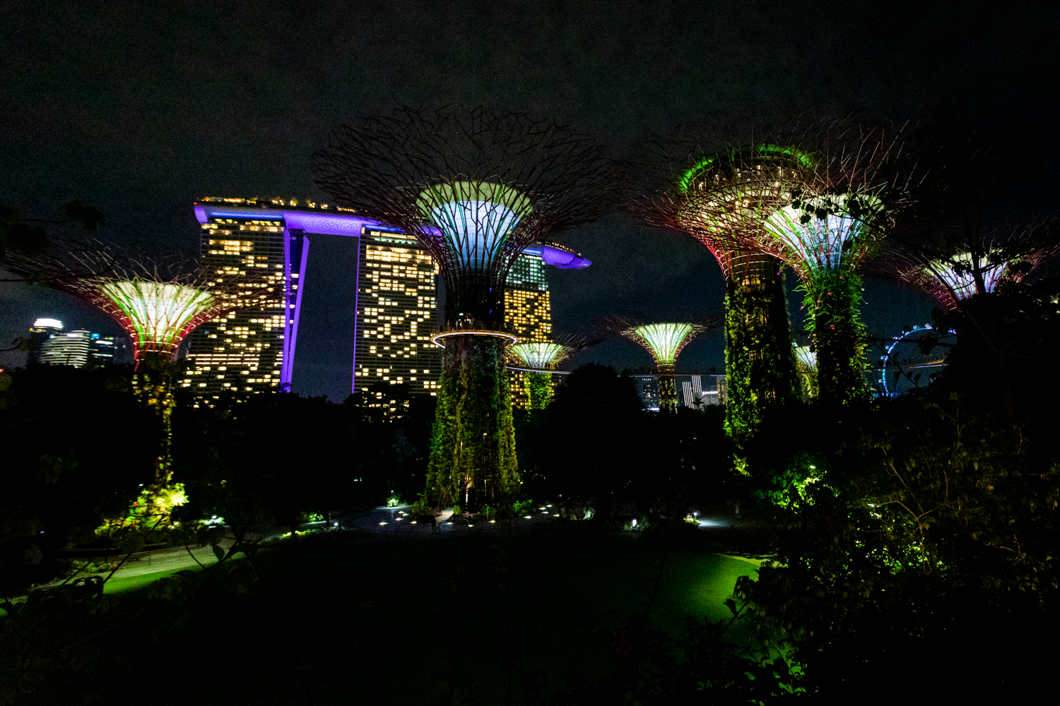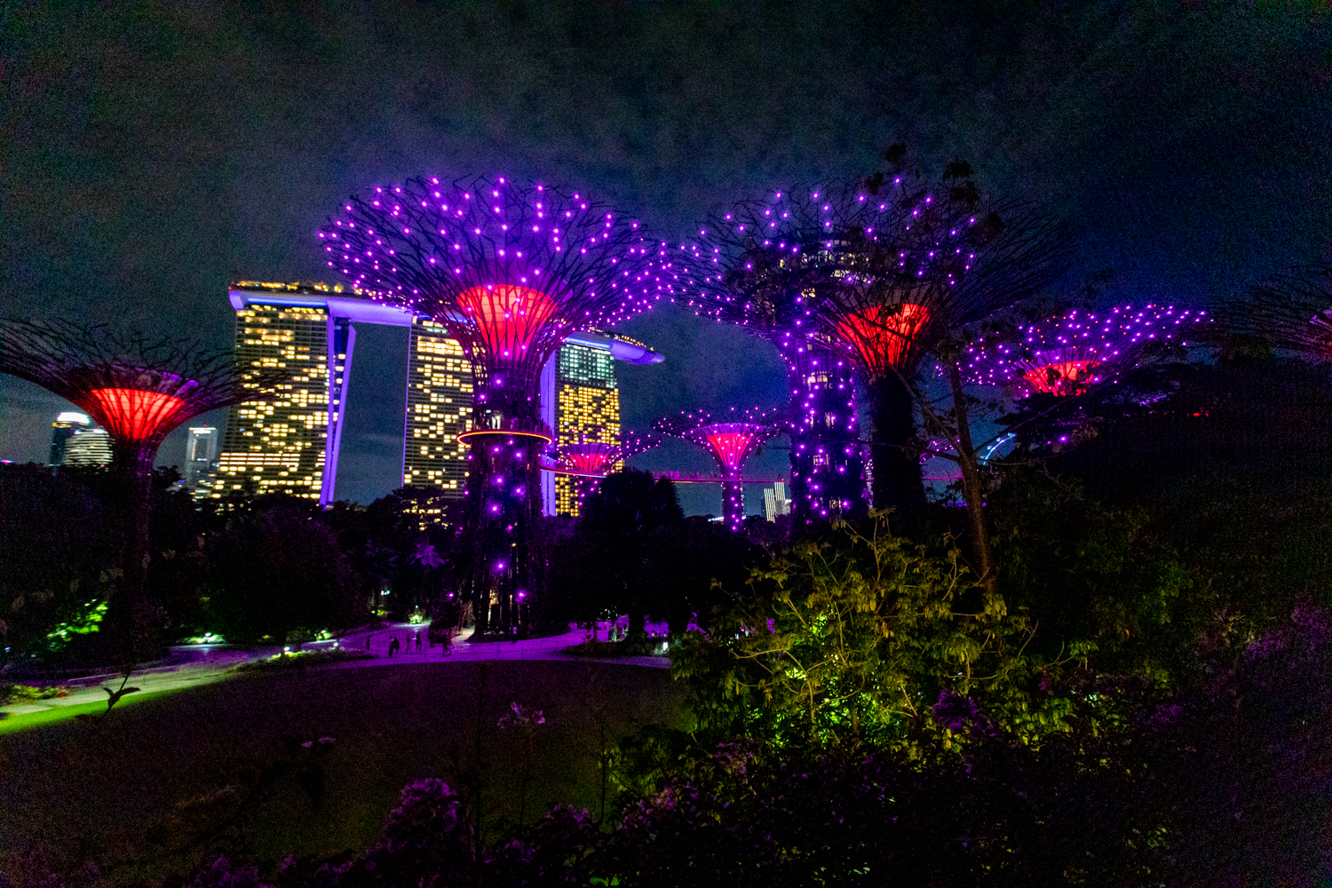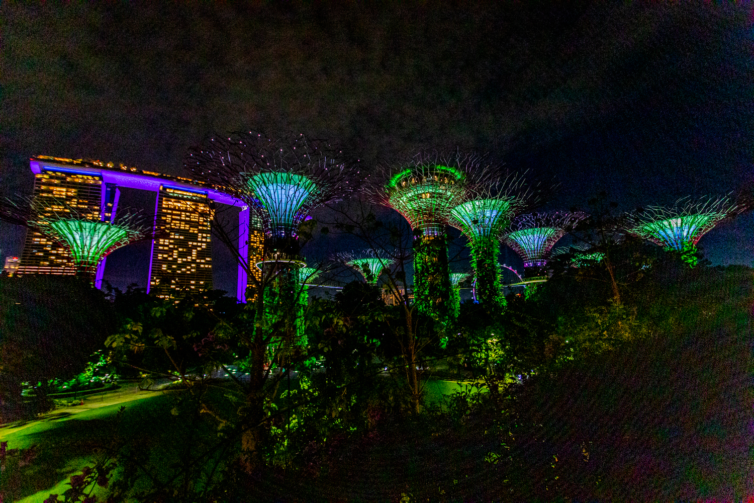 We head back to the HO HO Bus (Hop On, Hop Off Bus for those that have missed earlier blog posts) and arrive right as a bus arrives! Fantastic timing! We board and secure top row seats with a view and ride it for most of an hour which gives us more time to relax our feet and legs that, in turn is a good thing! We arrive at the bus hub and join the queue to have a night tour of the “Garden By The Sea” and the “Marina Bay Sands Hotel” and a promised “Light Show”! I am a bit disconcerted by the length of the queue as I wonder how we can get top row seats for the tour. And we are early to join the queue.