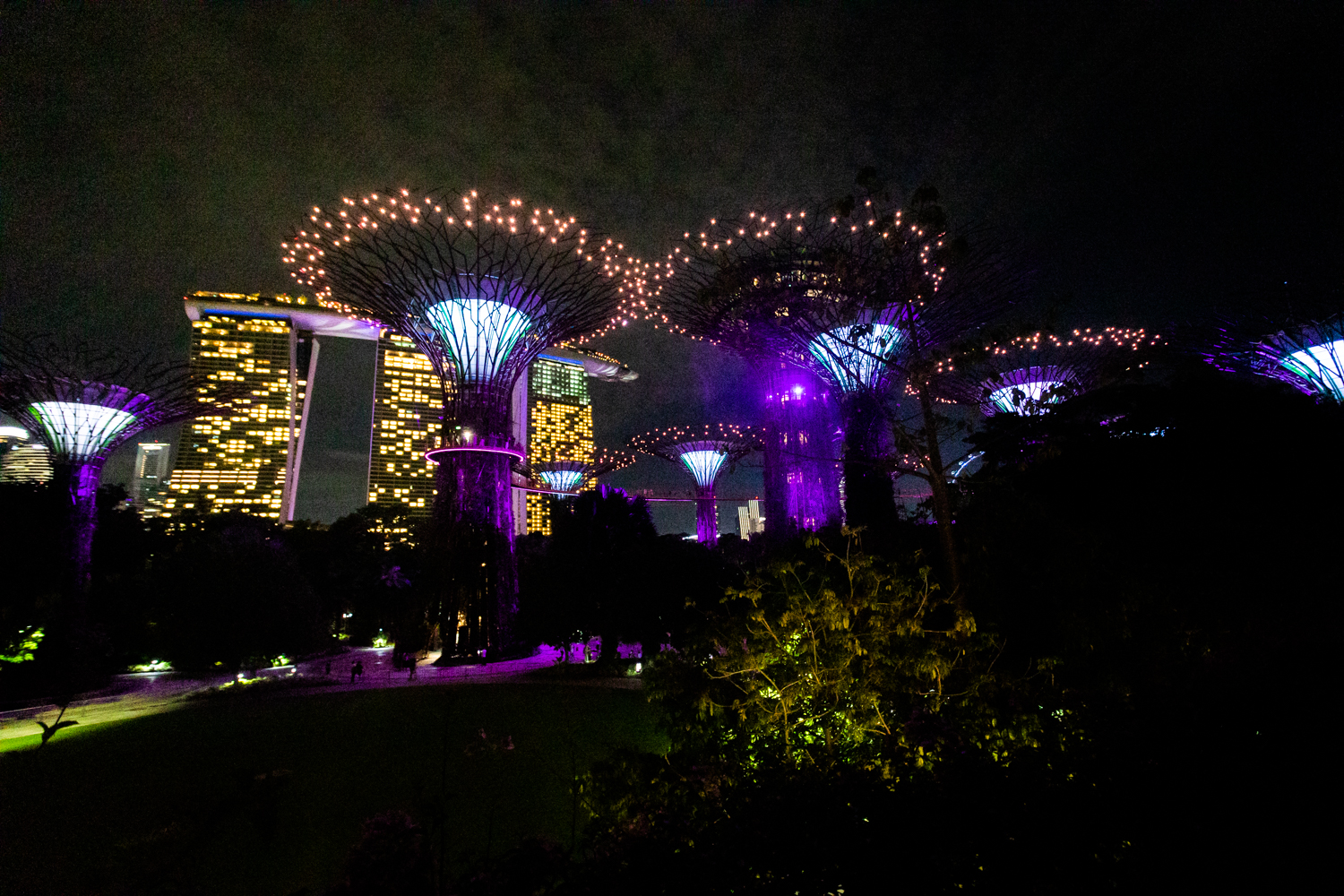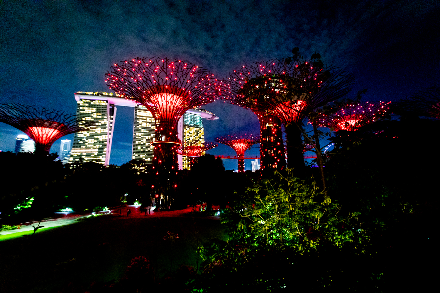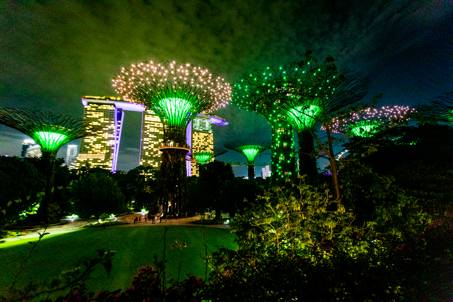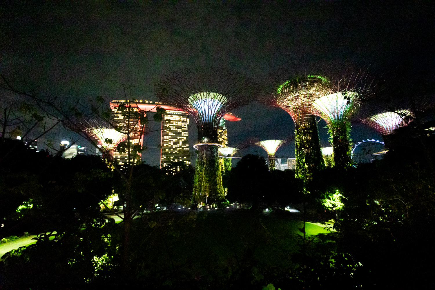 We head back to the HO HO Bus (Hop On, Hop Off Bus for those that have missed earlier blog posts) and arrive right as a bus arrives! Fantastic timing! We board and secure top row seats with a view and ride it for most of an hour which gives us more time to relax our feet and legs that, in turn is a good thing! We arrive at the bus hub and join the queue to have a night tour of the “Garden By The Sea” and the “Marina Bay Sands Hotel” and a promised “Light Show”! I am a bit disconcerted by the length of the queue as I wonder how we can get top row seats for the tour. And we are early to join the queue.