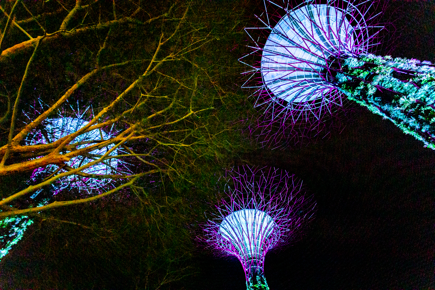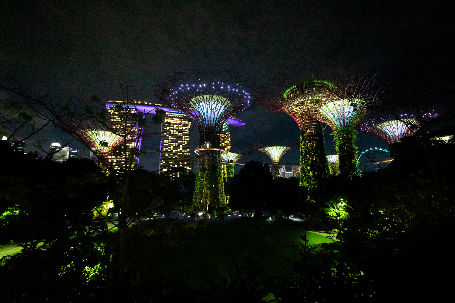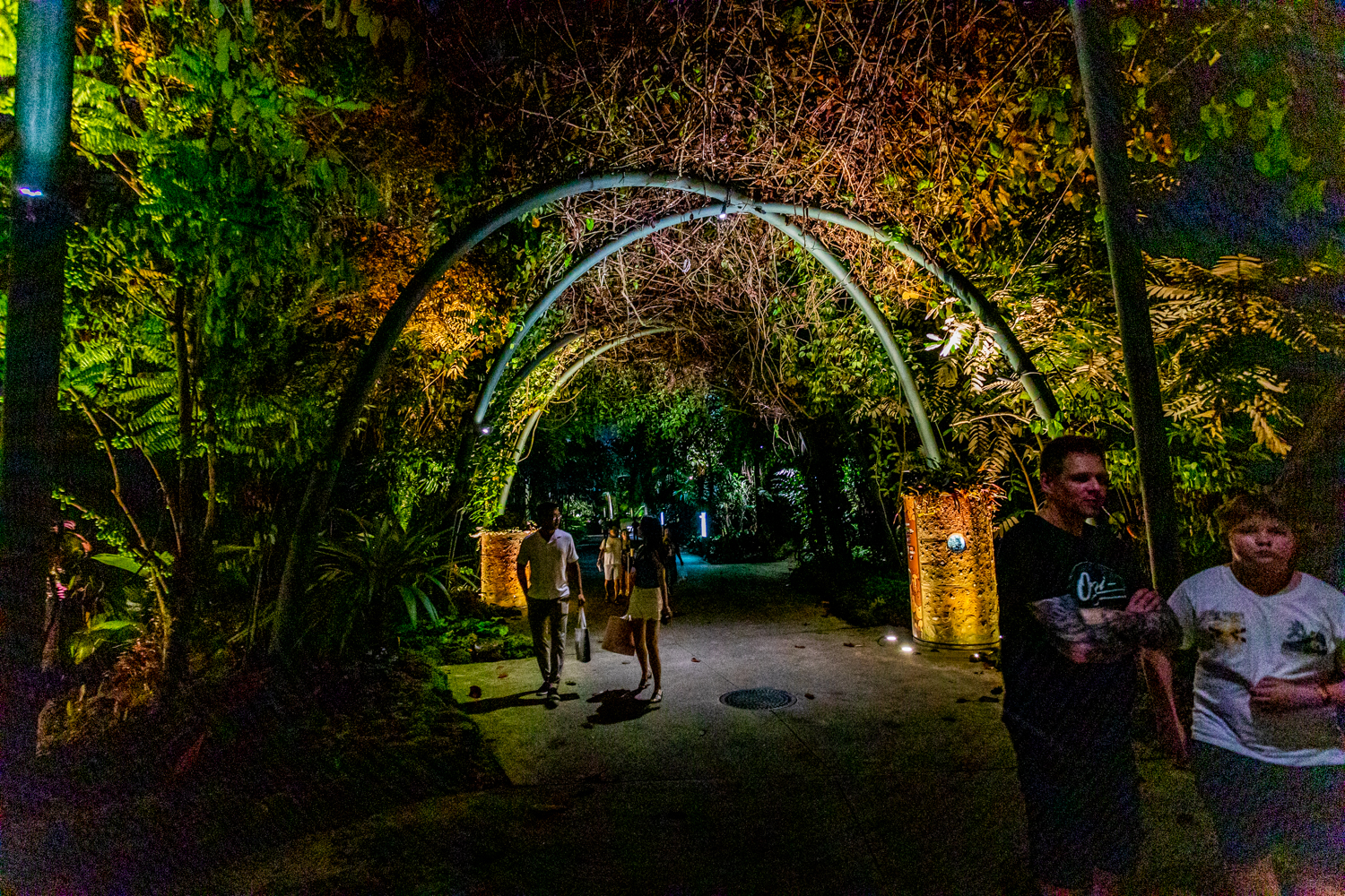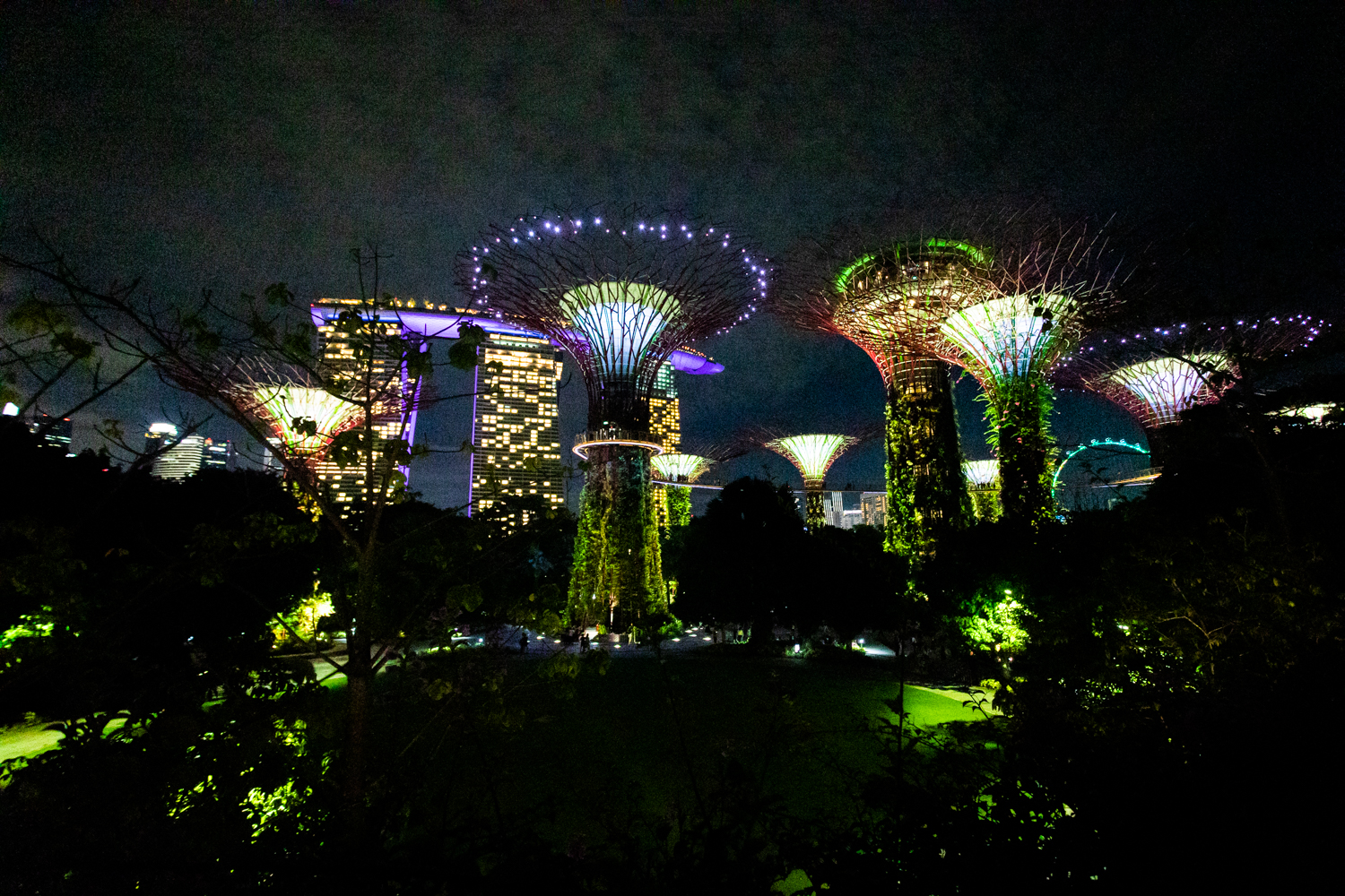 We head back to the HO HO Bus (Hop On, Hop Off Bus for those that have missed earlier blog posts) and arrive right as a bus arrives! Fantastic timing! We board and secure top row seats with a view and ride it for most of an hour which gives us more time to relax our feet and legs that, in turn is a good thing! We arrive at the bus hub and join the queue to have a night tour of the “Garden By The Sea” and the “Marina Bay Sands Hotel” and a promised “Light Show”! I am a bit disconcerted by the length of the queue as I wonder how we can get top row seats for the tour. And we are early to join the queue.