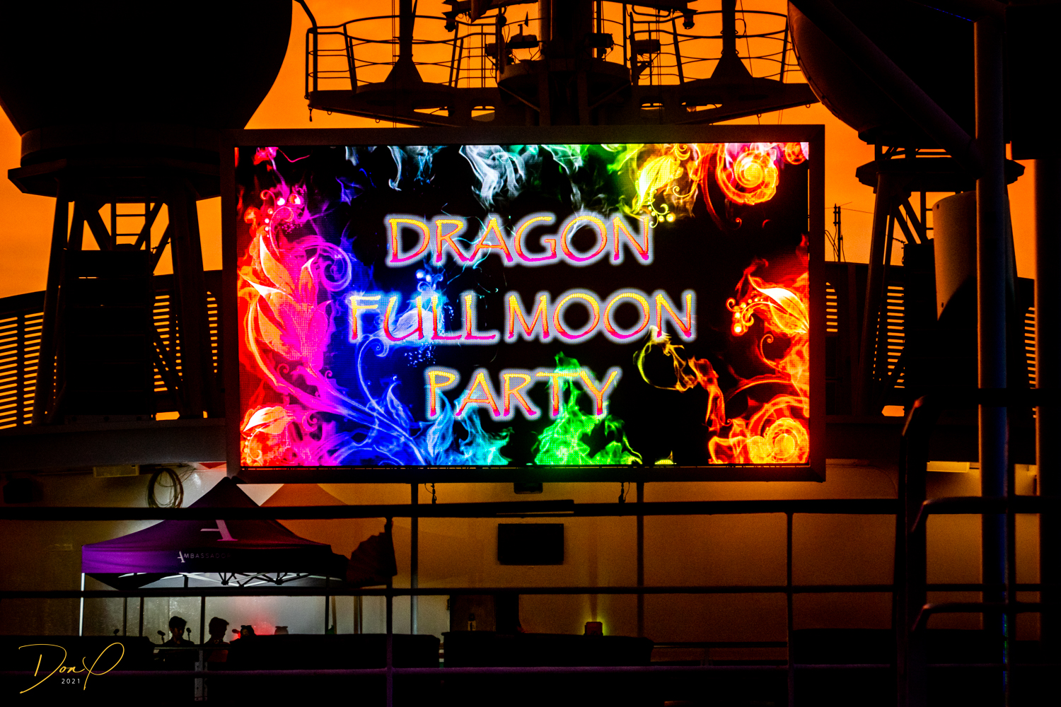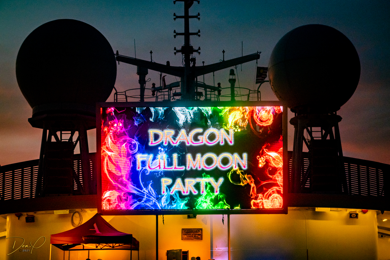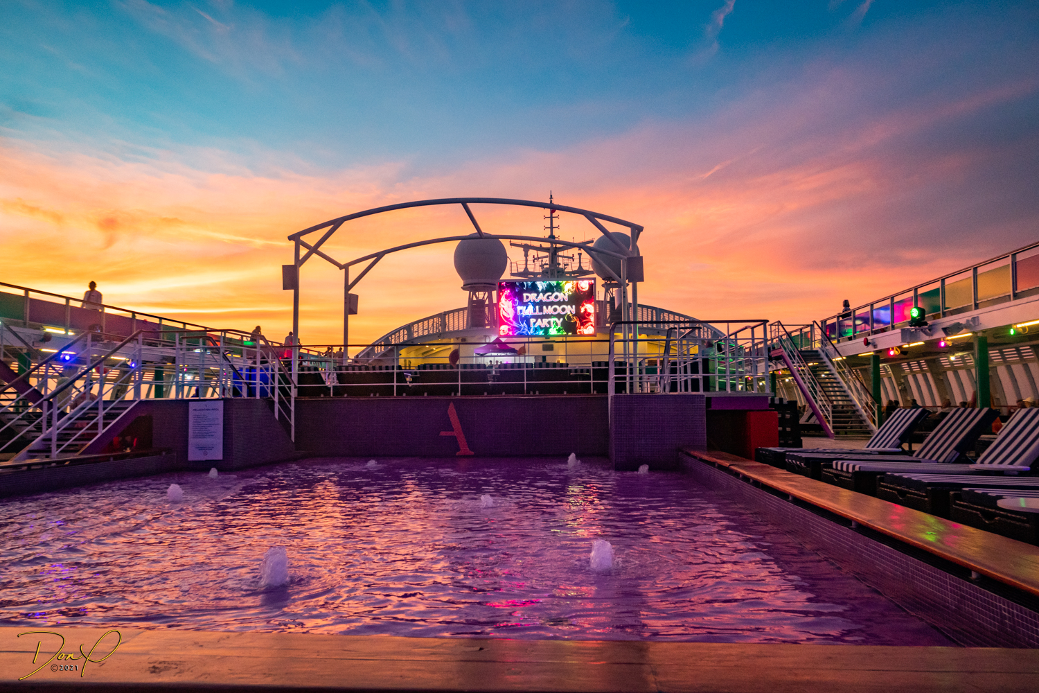 After dinner, where we get to know our table mates better, we make our way up on deck to a deck party, the “Dragon Full Moon Party”, glow in the dark party. We stay for a couple hours, relaxing in deck chairs near the pool. Not a very well attended deck party as cruise ship deck parties go. The moon was not full, there were no black lights to illuminate clothing and the party was scheduled on a port night with a port day tomorrow. Poor scheduling.
