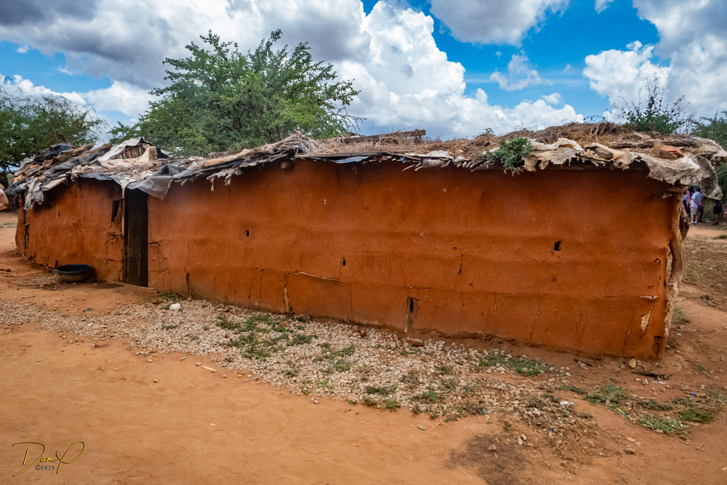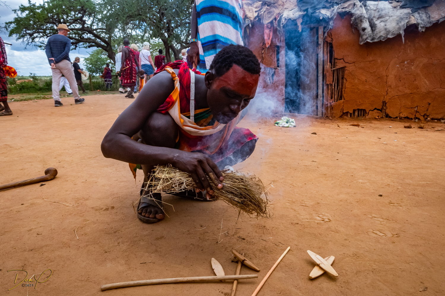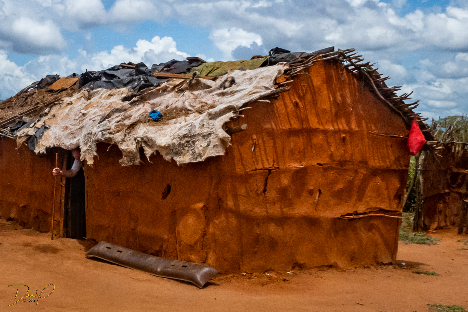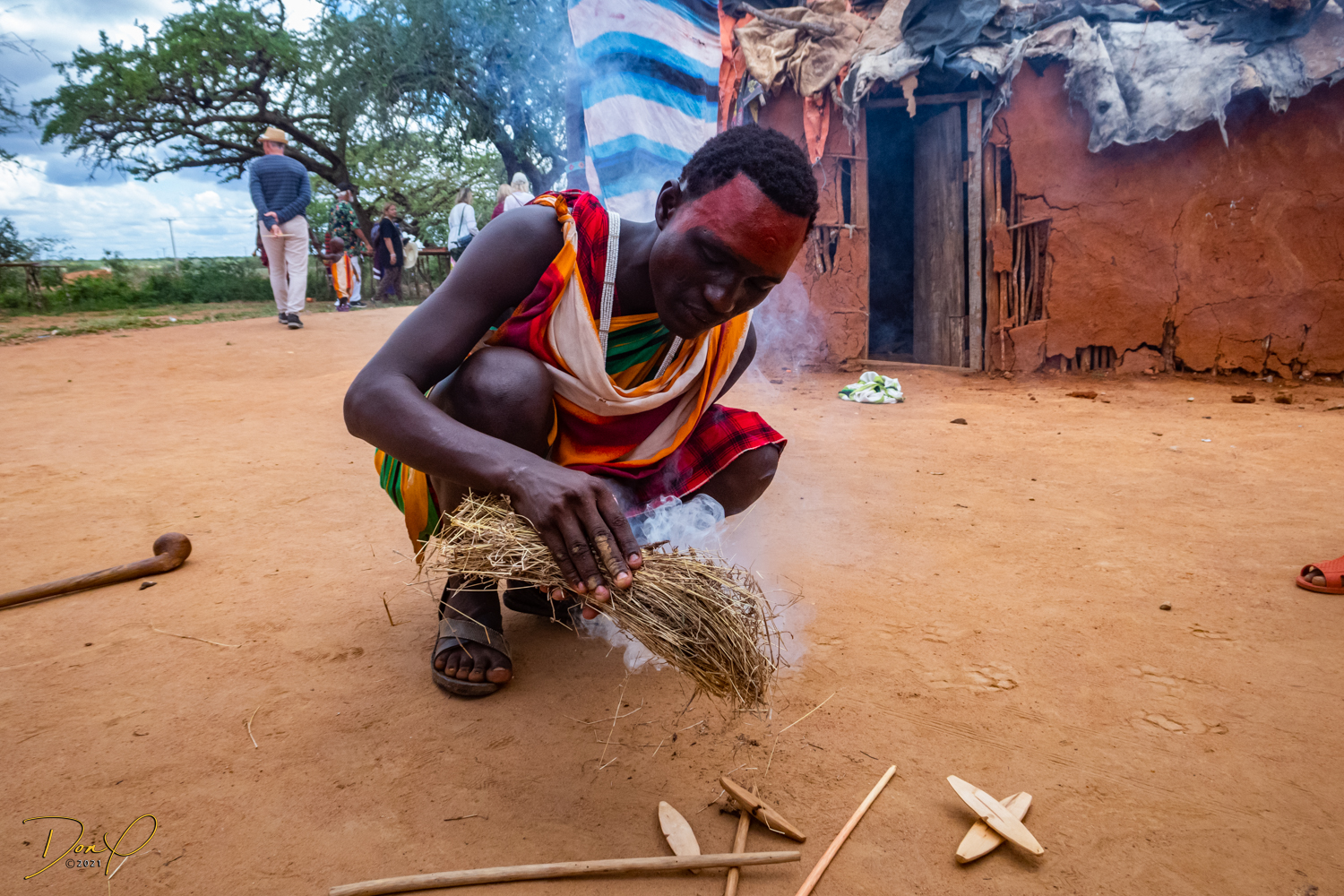 After they dance and jump for us, we are invited into their village to see their houses and how they live. It is fascinating to see more of their culture. Their houses are constructed of elephant and other animal dung. No, that is not a typo. Animal dung! The ground here is bright red, reminding me of red Georgia Clay. And that color is carried through the walls of their homes! Small scraps of fabric are used to make decoration for the walls! Inside the houses, the sleeping areas are very rustic and covered with animal skins. Likewise, the roofs are made of animal skins also, stretched over frames of sticks. There are no real forests in Kenya so wood is not a common commodity. They also show us how they start a fire using just a stick that they spin in their hands. Brings me back to my Boy Scout days! They effortlessly start their fires in minutes! Their children seem no different than all children (which we are always fascinated with) around the world. Their cooking utensils are hammered out of steel, probably supplied by the large steel mill we passed on the road. The tribe is very welcoming of our cameras, which I thought would be more of an issue!