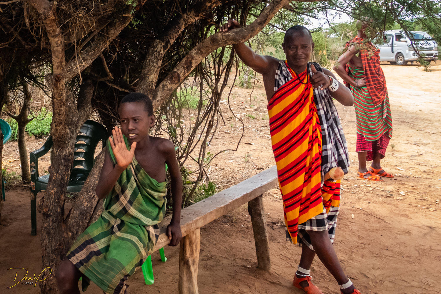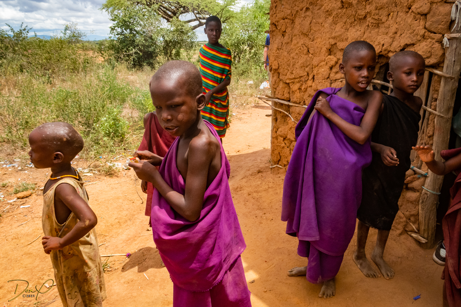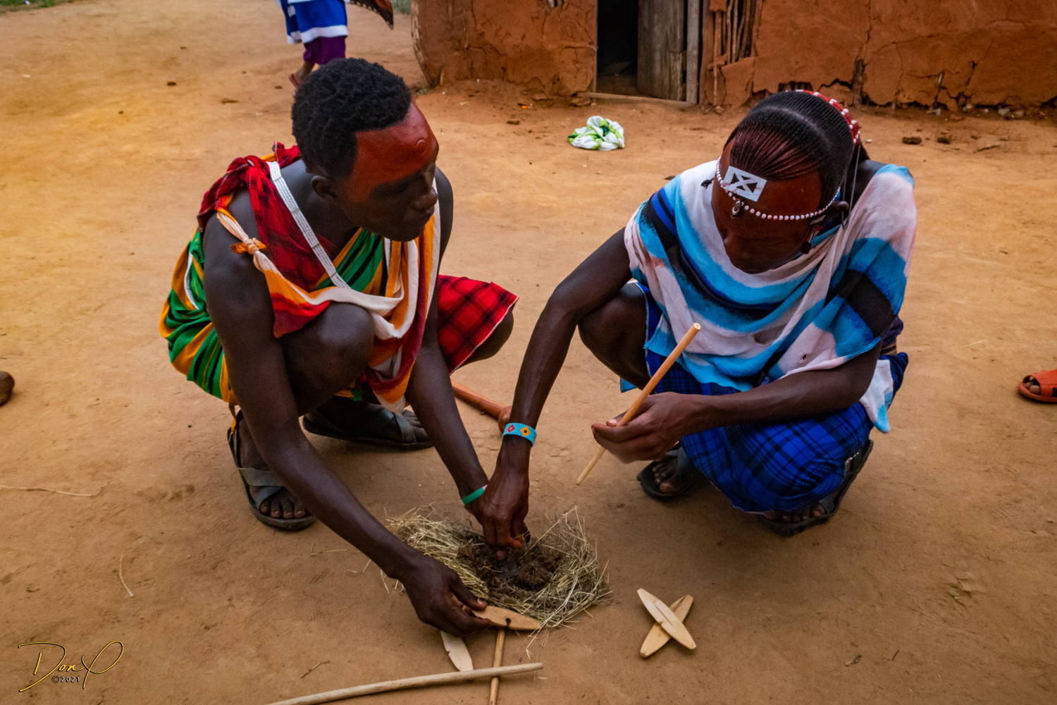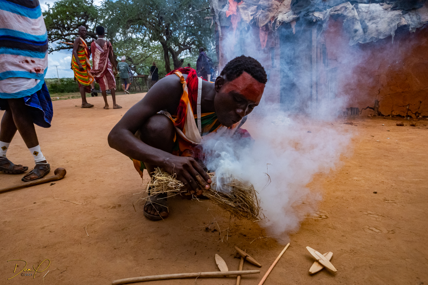 After they dance and jump for us, we are invited into their village to see their houses and how they live. It is fascinating to see more of their culture. Their houses are constructed of elephant and other animal dung. No, that is not a typo. Animal dung! The ground here is bright red, reminding me of red Georgia Clay. And that color is carried through the walls of their homes! Small scraps of fabric are used to make decoration for the walls! Inside the houses, the sleeping areas are very rustic and covered with animal skins. Likewise, the roofs are made of animal skins also, stretched over frames of sticks. There are no real forests in Kenya so wood is not a common commodity. They also show us how they start a fire using just a stick that they spin in their hands. Brings me back to my Boy Scout days! They effortlessly start their fires in minutes! Their children seem no different than all children (which we are always fascinated with) around the world. Their cooking utensils are hammered out of steel, probably supplied by the large steel mill we passed on the road. The tribe is very welcoming of our cameras, which I thought would be more of an issue!