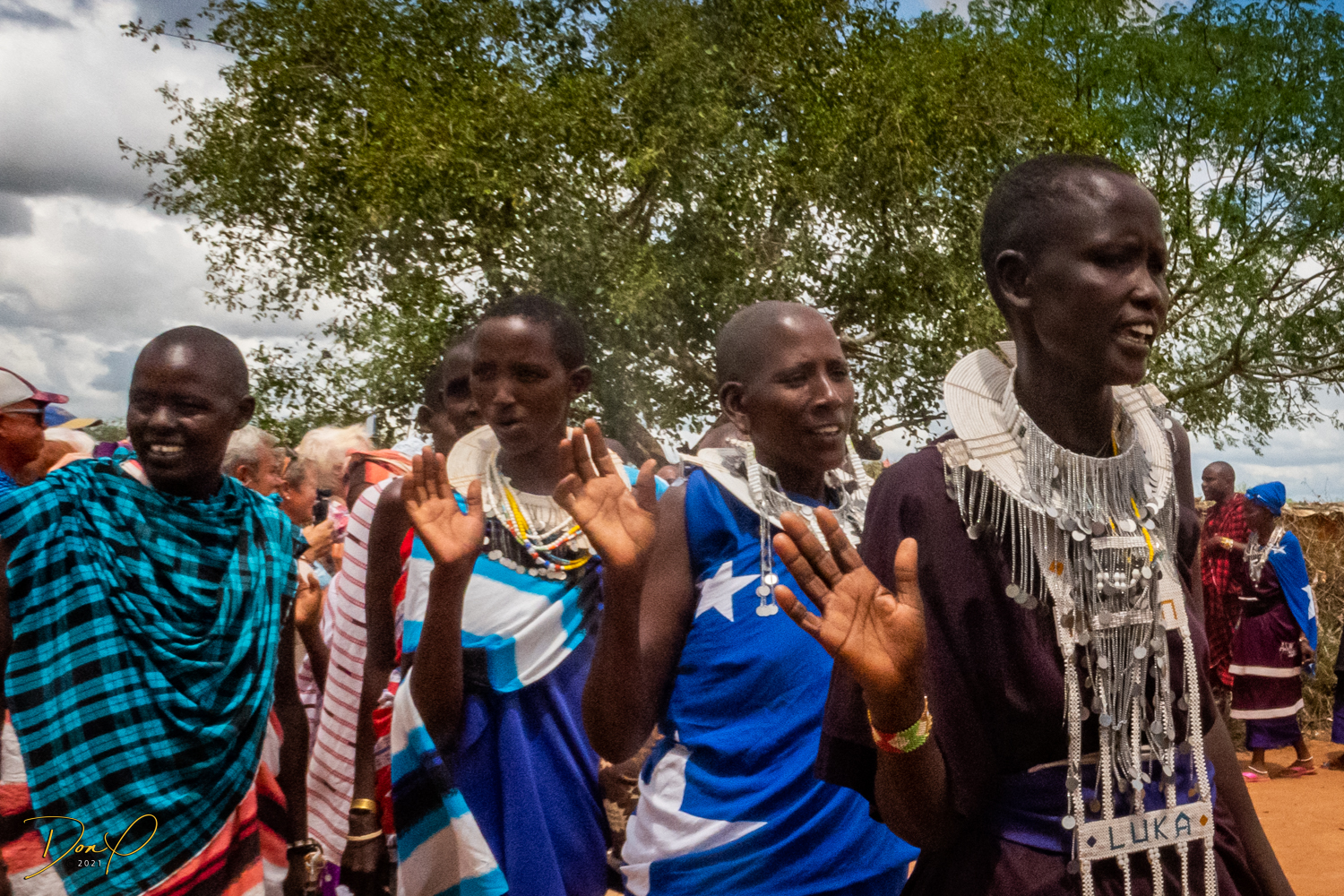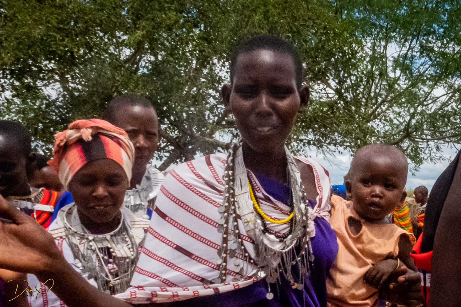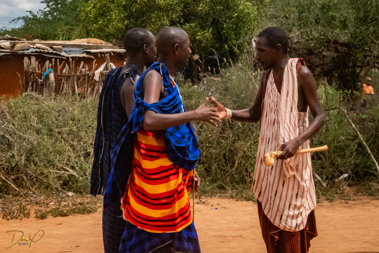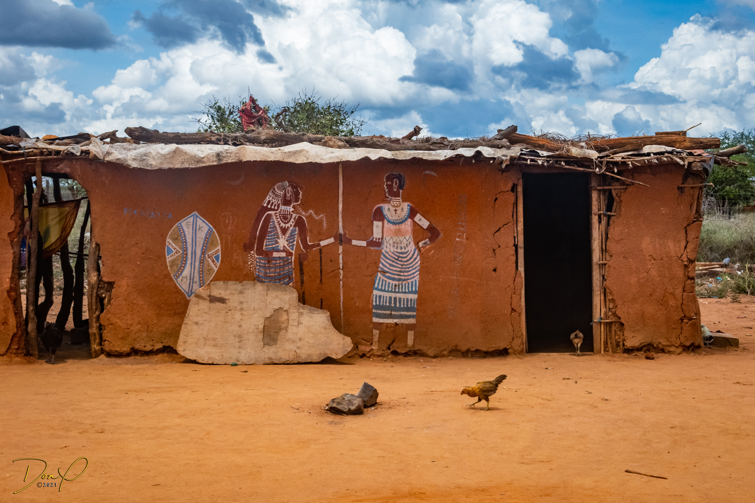 After they dance and jump for us, we are invited into their village to see their houses and how they live. It is fascinating to see more of their culture. Their houses are constructed of elephant and other animal dung. No, that is not a typo. Animal dung! The ground here is bright red, reminding me of red Georgia Clay. And that color is carried through the walls of their homes! Small scraps of fabric are used to make decoration for the walls! Inside the houses, the sleeping areas are very rustic and covered with animal skins. Likewise, the roofs are made of animal skins also, stretched over frames of sticks. There are no real forests in Kenya so wood is not a common commodity. They also show us how they start a fire using just a stick that they spin in their hands. Brings me back to my Boy Scout days! They effortlessly start their fires in minutes! Their children seem no different than all children (which we are always fascinated with) around the world. Their cooking utensils are hammered out of steel, probably supplied by the large steel mill we passed on the road. The tribe is very welcoming of our cameras, which I thought would be more of an issue!
