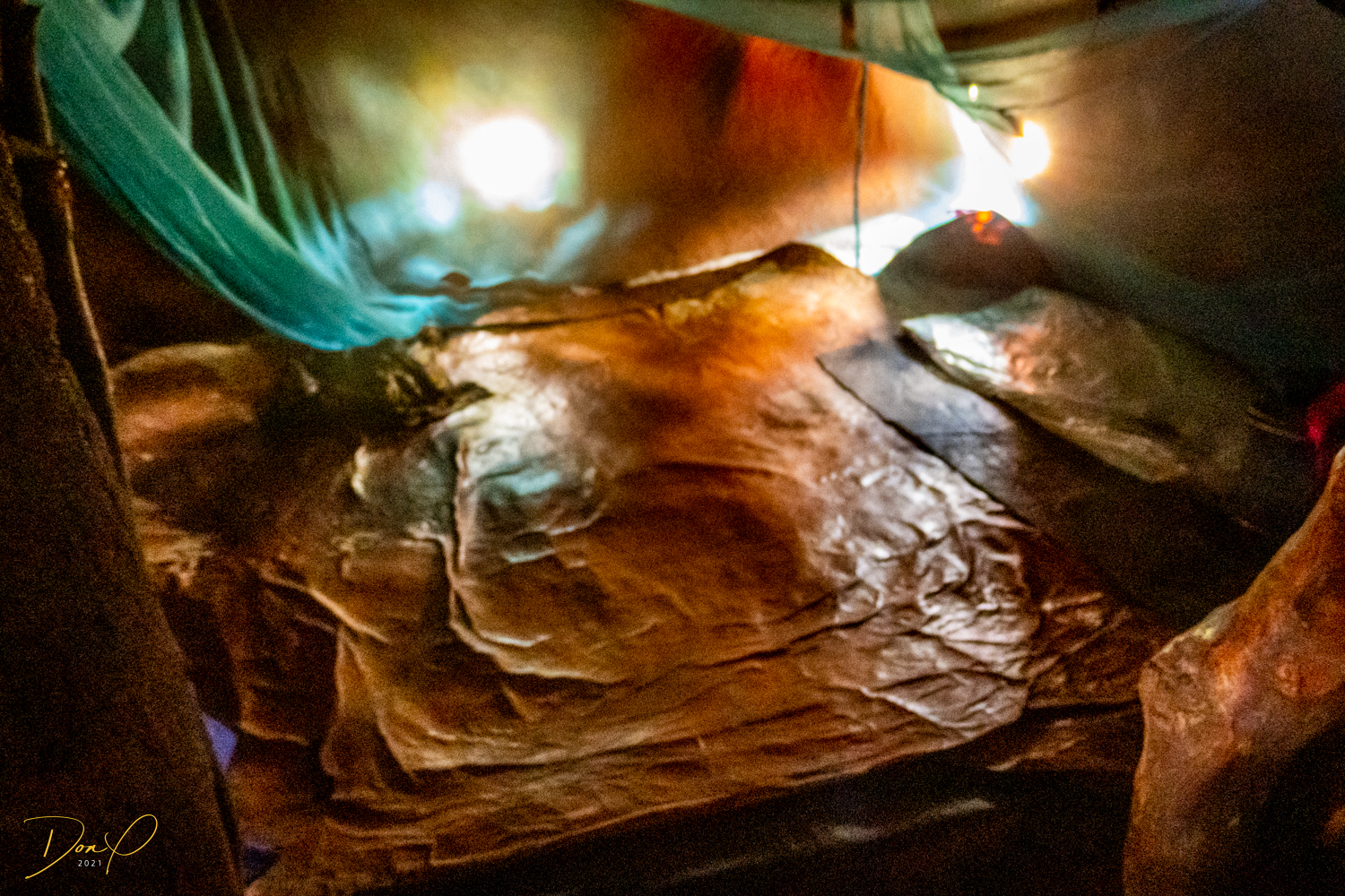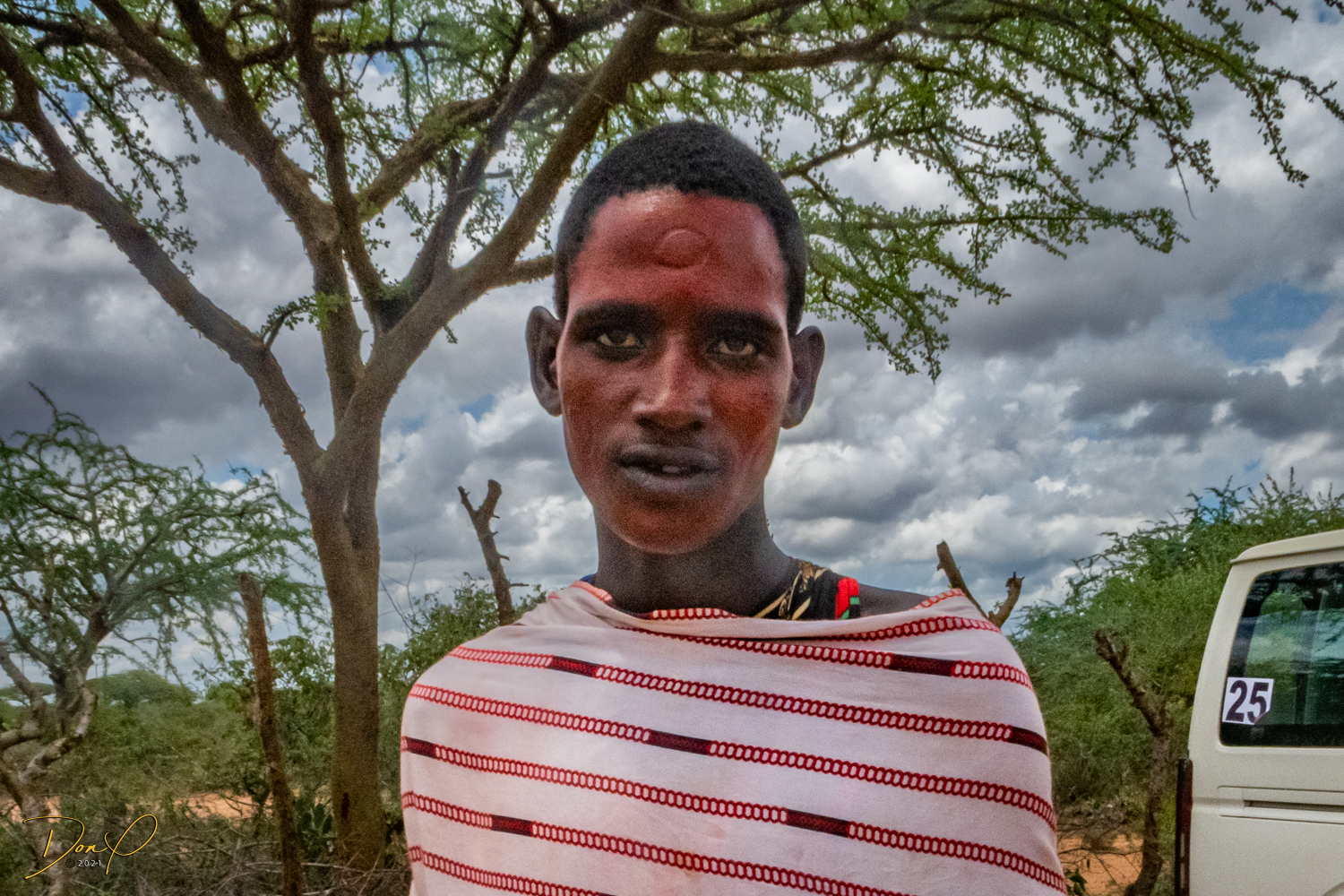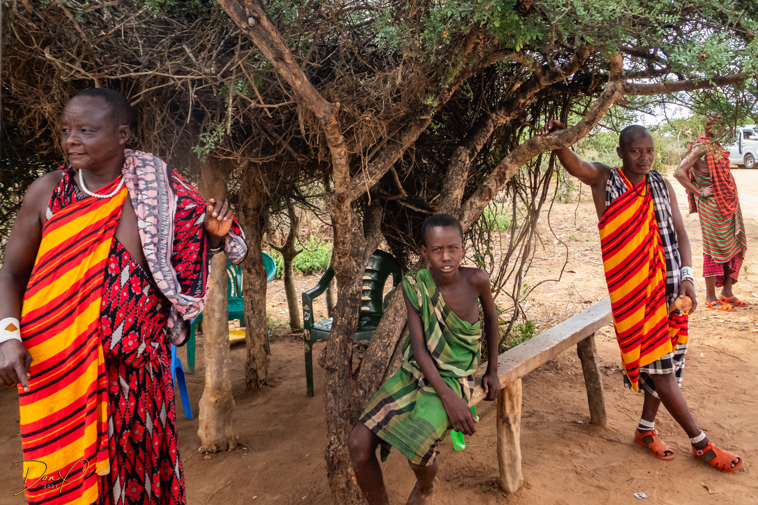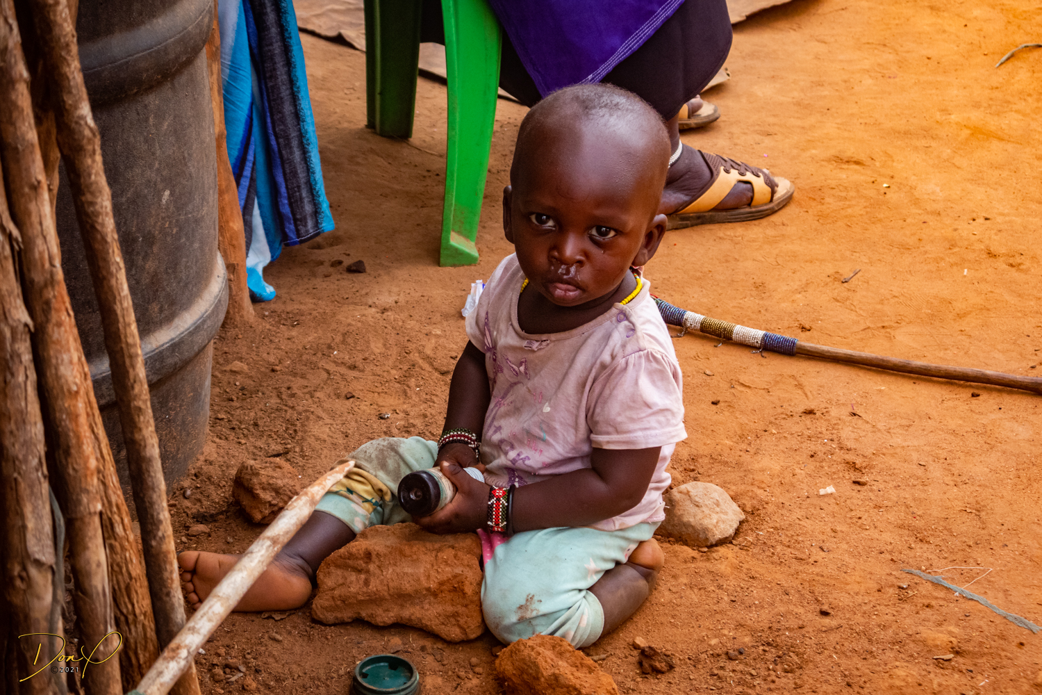 After they dance and jump for us, we are invited into their village to see their houses and how they live. It is fascinating to see more of their culture. Their houses are constructed of elephant and other animal dung. No, that is not a typo. Animal dung! The ground here is bright red, reminding me of red Georgia Clay. And that color is carried through the walls of their homes! Small scraps of fabric are used to make decoration for the walls! Inside the houses, the sleeping areas are very rustic and covered with animal skins. Likewise, the roofs are made of animal skins also, stretched over frames of sticks. There are no real forests in Kenya so wood is not a common commodity. They also show us how they start a fire using just a stick that they spin in their hands. Brings me back to my Boy Scout days! They effortlessly start their fires in minutes! Their children seem no different than all children (which we are always fascinated with) around the world. Their cooking utensils are hammered out of steel, probably supplied by the large steel mill we passed on the road. The tribe is very welcoming of our cameras, which I thought would be more of an issue!