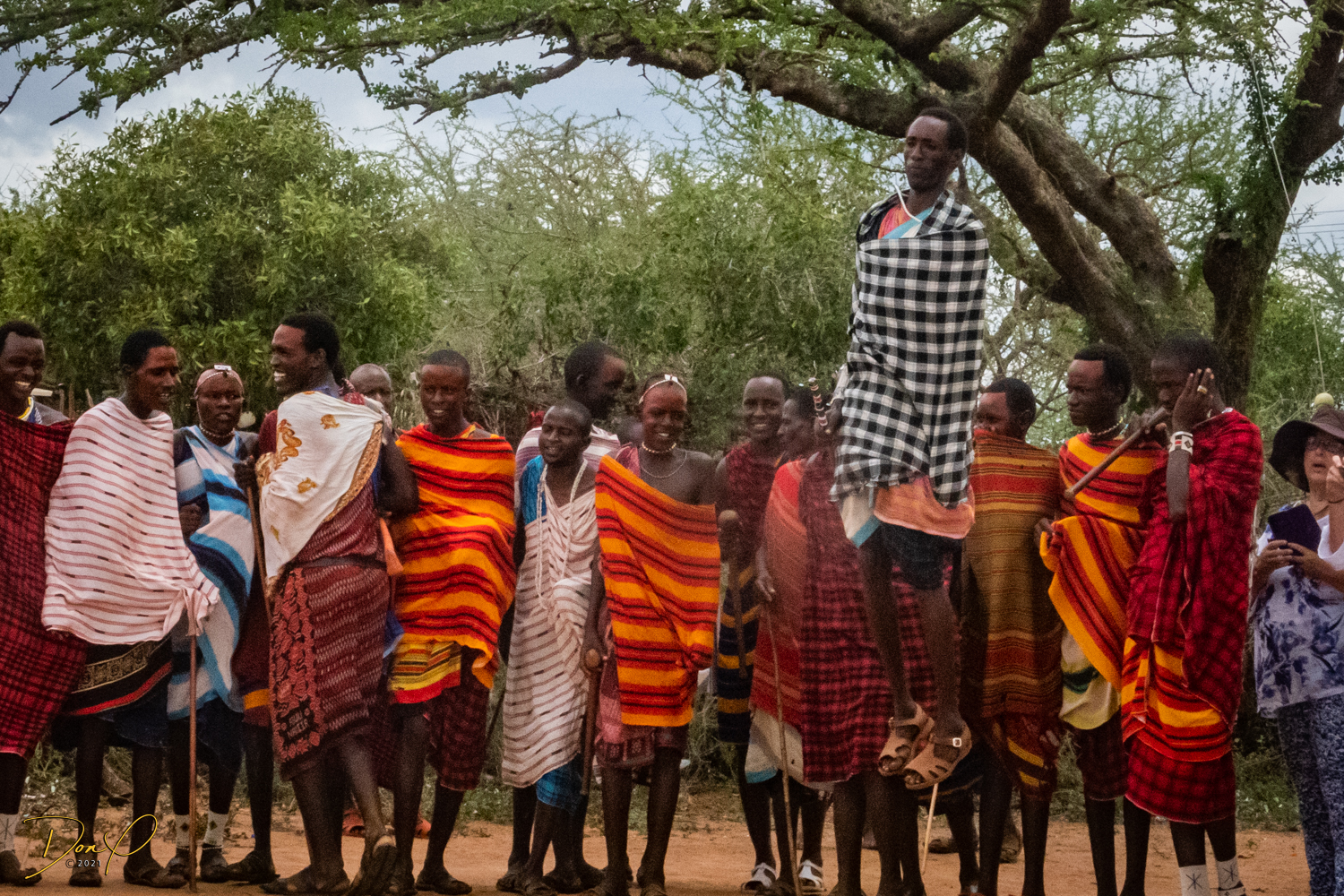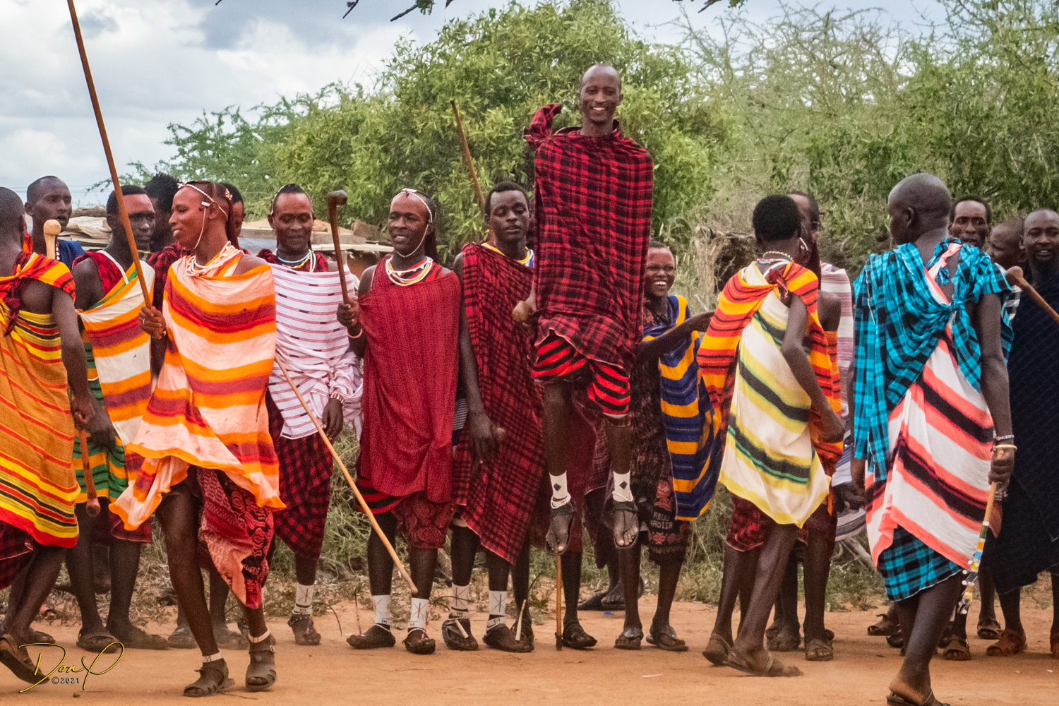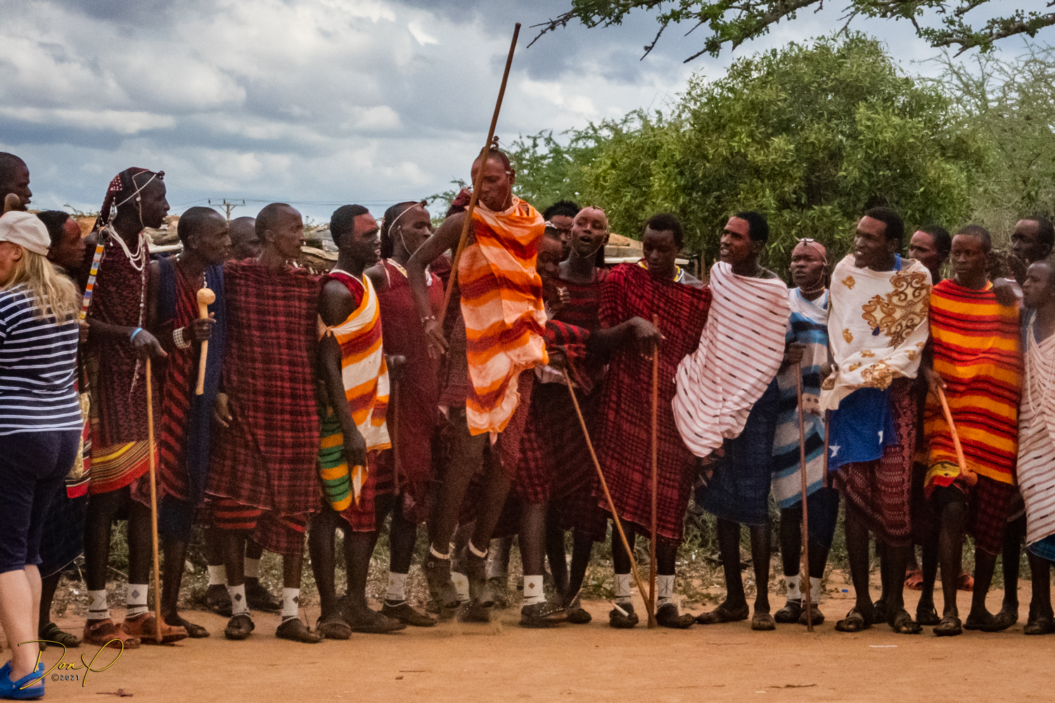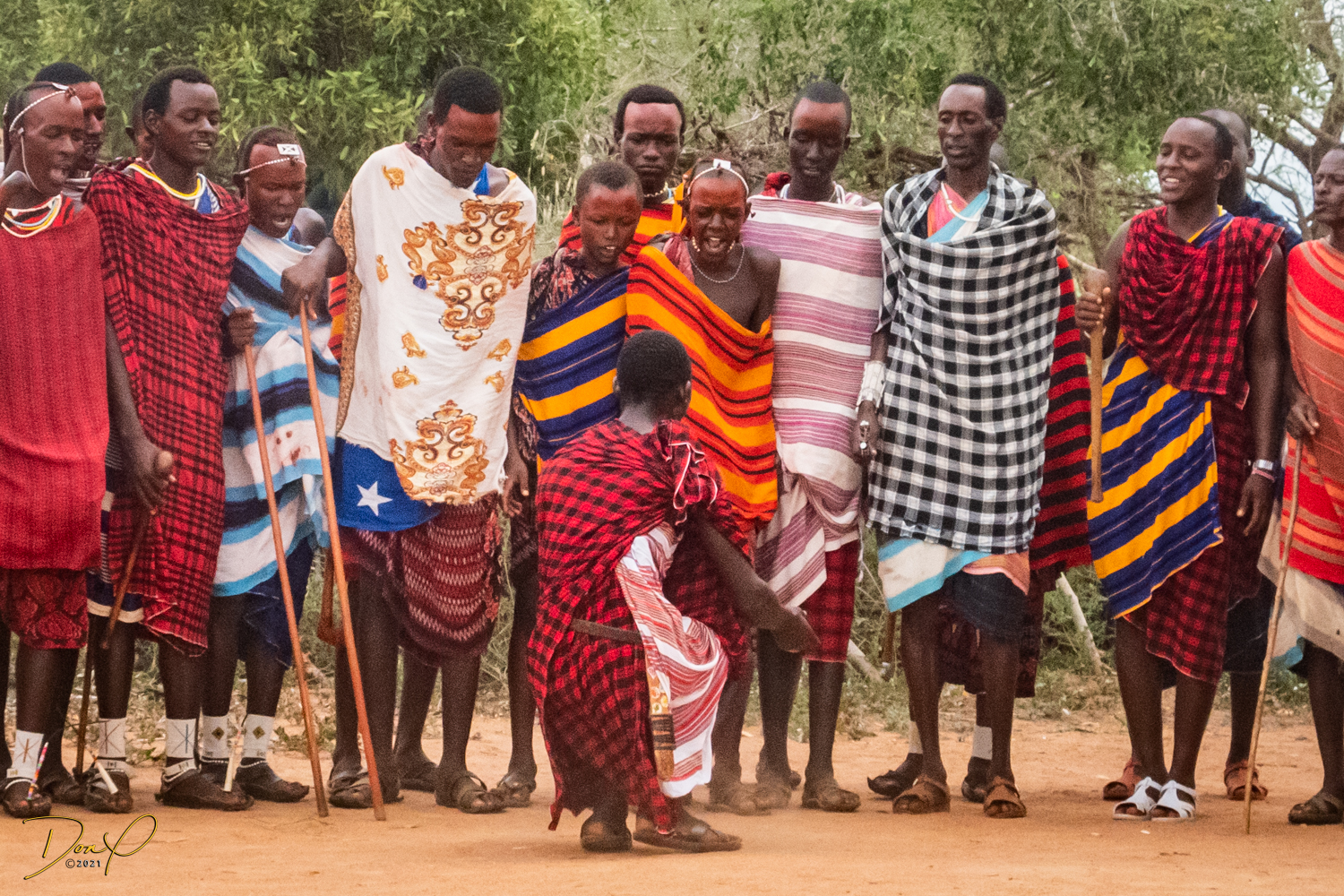 We drive on and arrive at a ‘Masai’ village. Who has heard of the ‘Masai’? What a fun treat! They come out and dance for us. Soon they start ‘jumping’! If you’ve never witnessed Masai Warriors jump, you’re missing out! They dance and jump for 30 minutes or more! I’m tired just watching them!