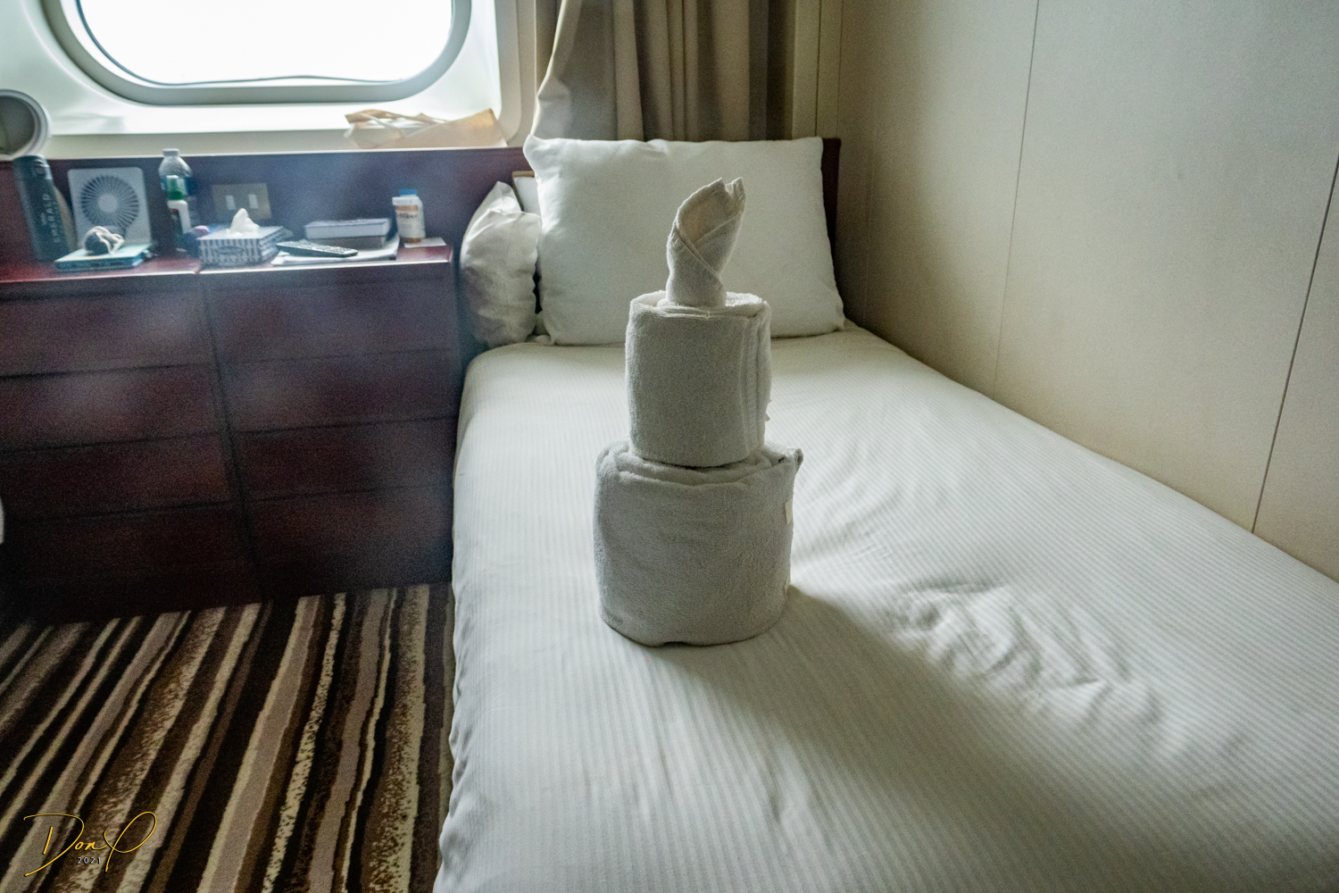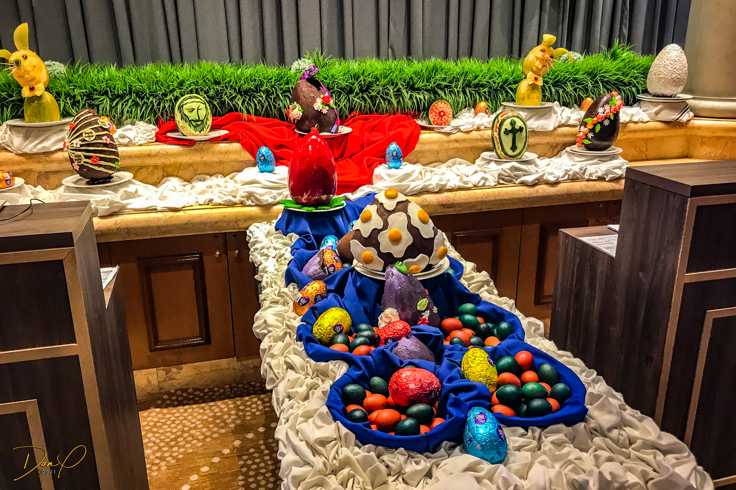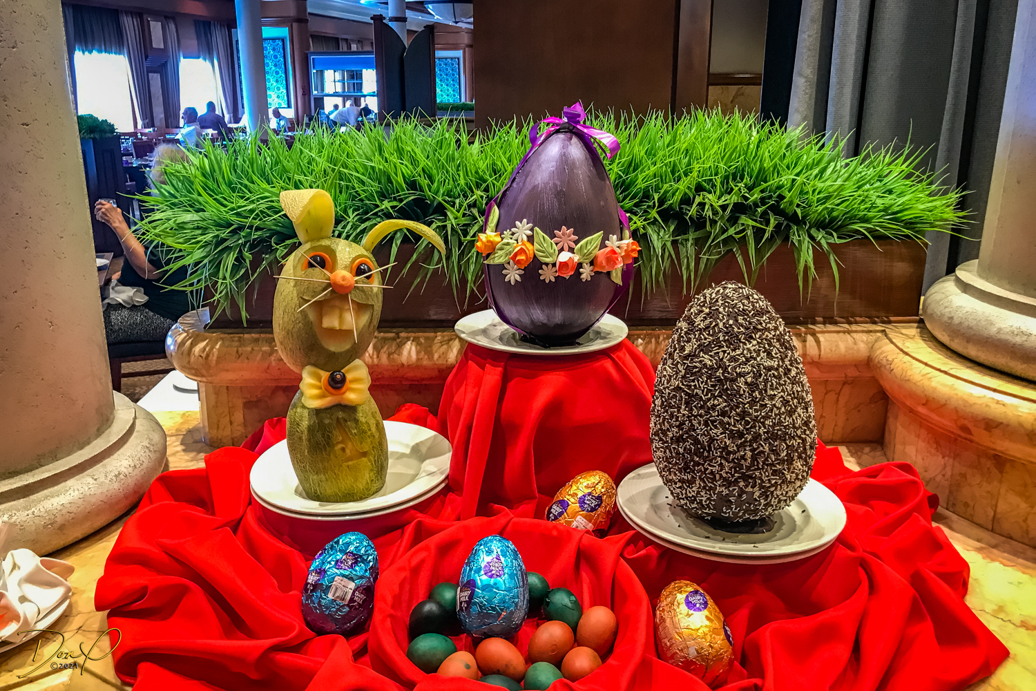 Sunday is Easter! Decorations abound all over the ship! Our room steward speaks English well but apparently doesn’t read it so well. Elee put a “Happy Easter” sign on our door and the steward thought it said “Happy Birthday”! We found this in our room!