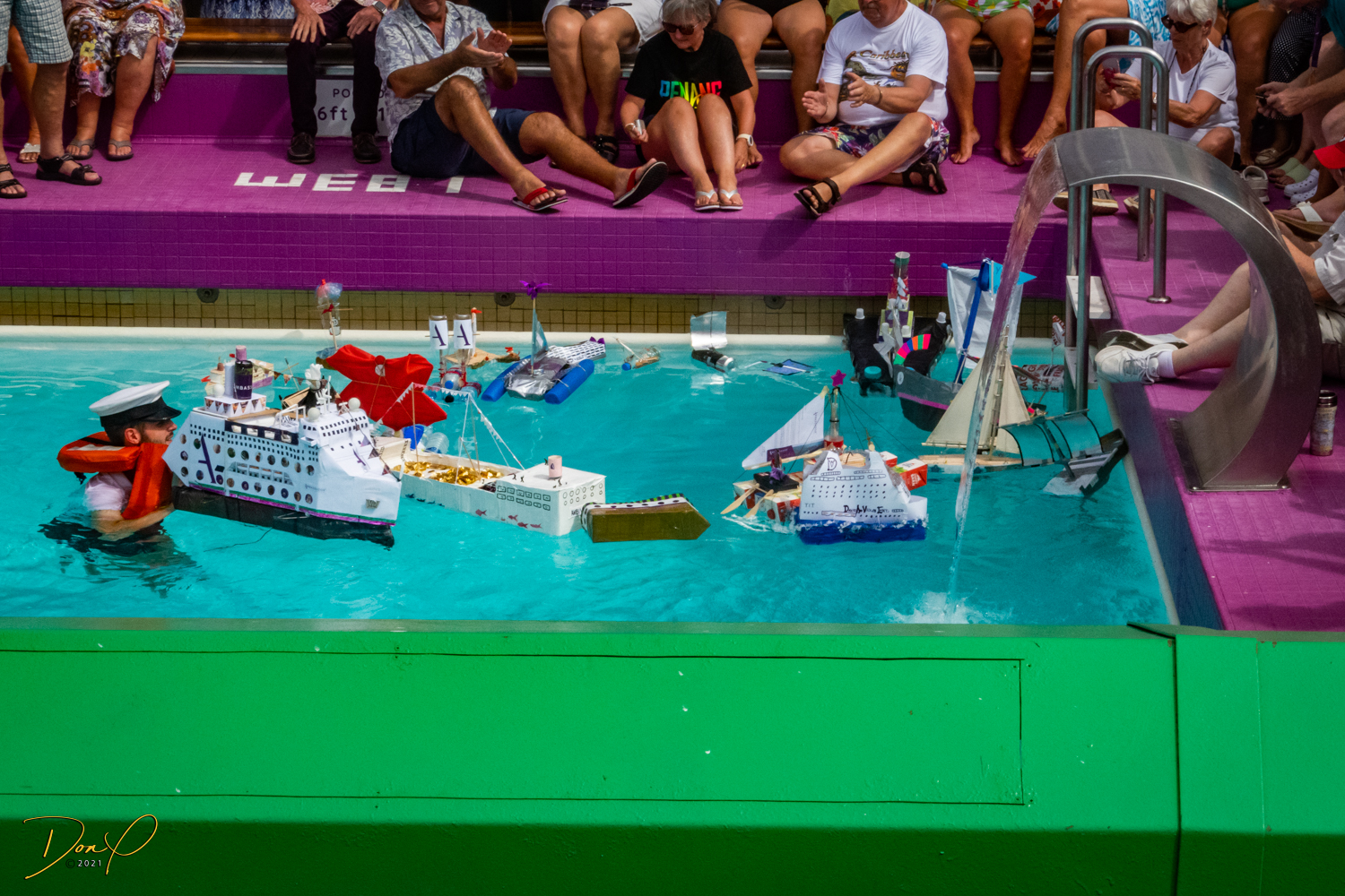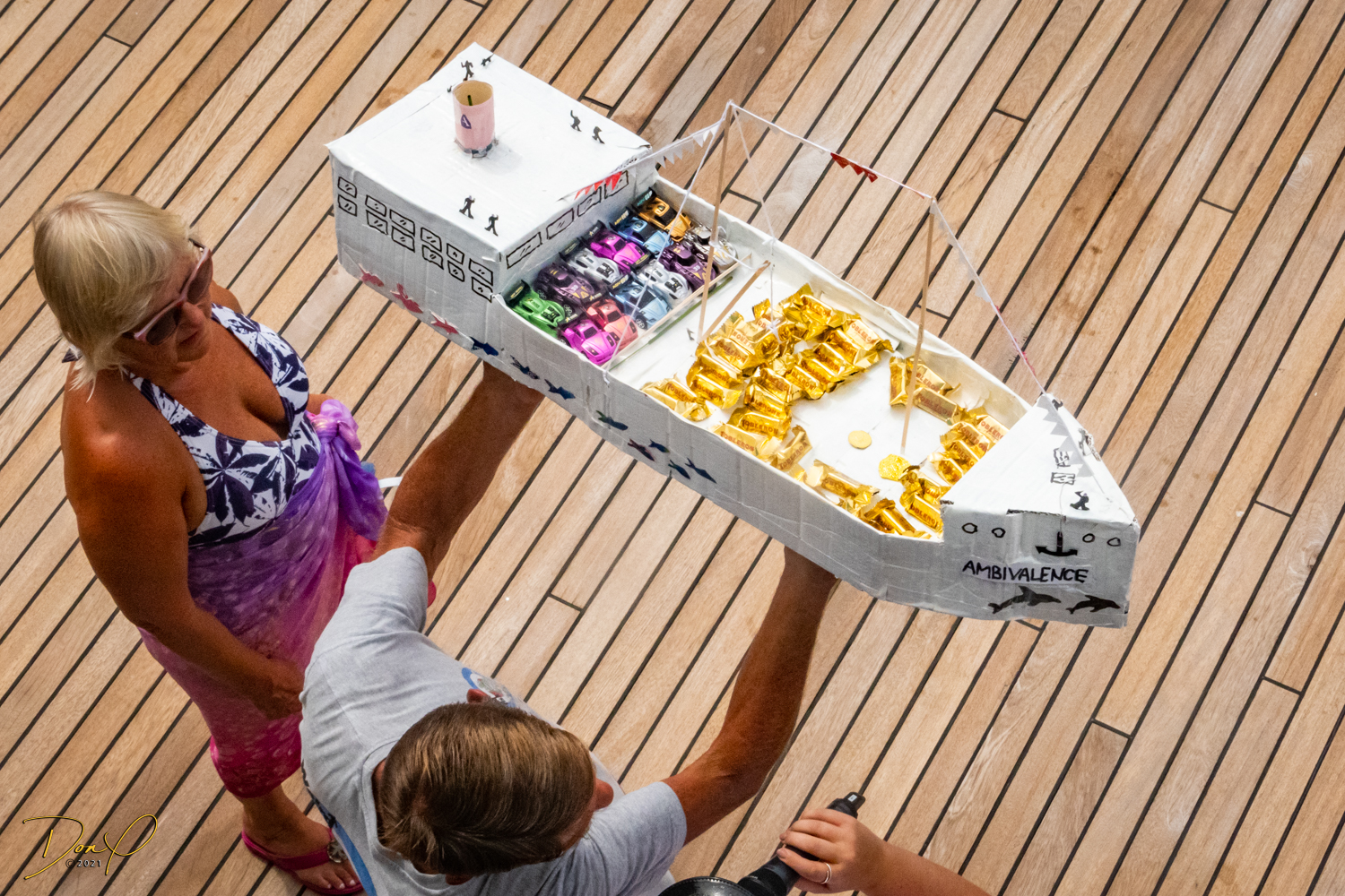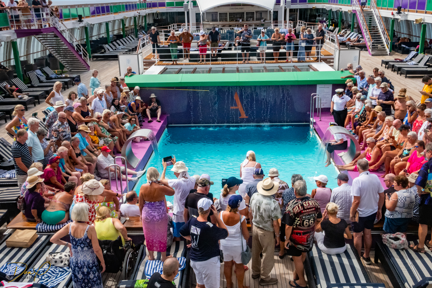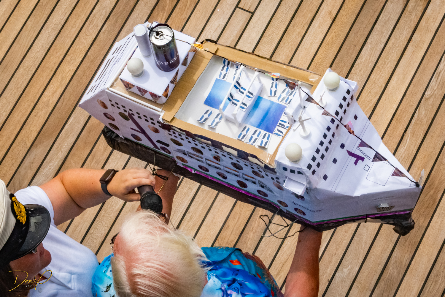 At two o’clock on Friday afternoon, the entertainment crew hosts the “World Cruise Boat Regatta”, a silly entertainment where passengers that wanted to, built some kind of floatable boat out of recycled materials on the ship (so that’s where all the coffee stirrer sticks disappeared to!). Then they were put to the test in the pool where a crew member would put a full bottle of water (the ‘Captain’) somewhere on the boat and if it stood up gor 3 whole seconds, the boat would pass! The final winner was voted by rounds of applause from the spectators. All good fun, lots of laughs and it kept the cocktail waitresses busy!
