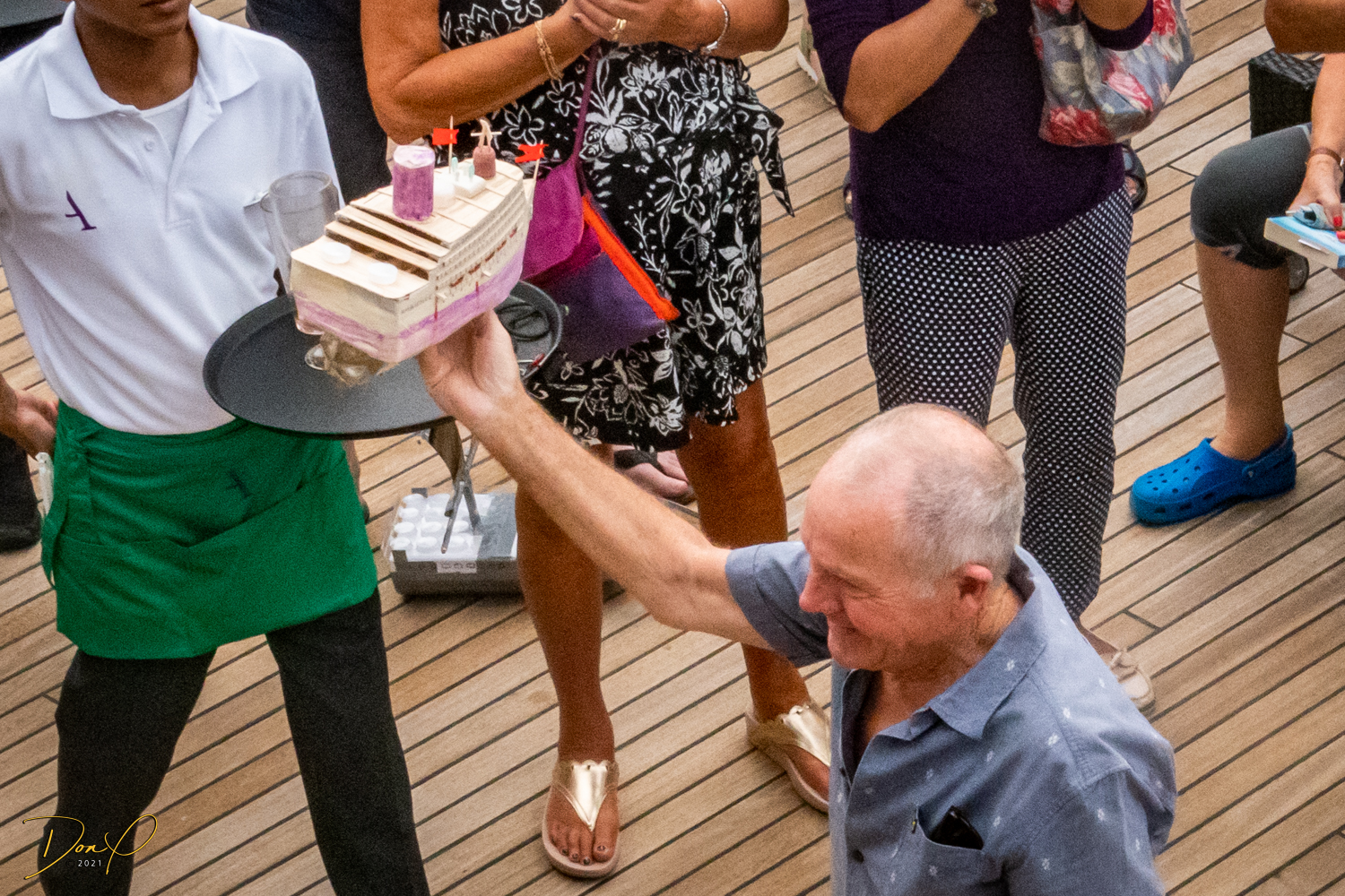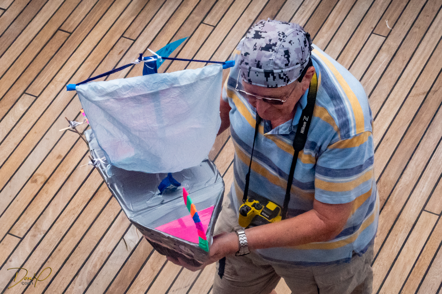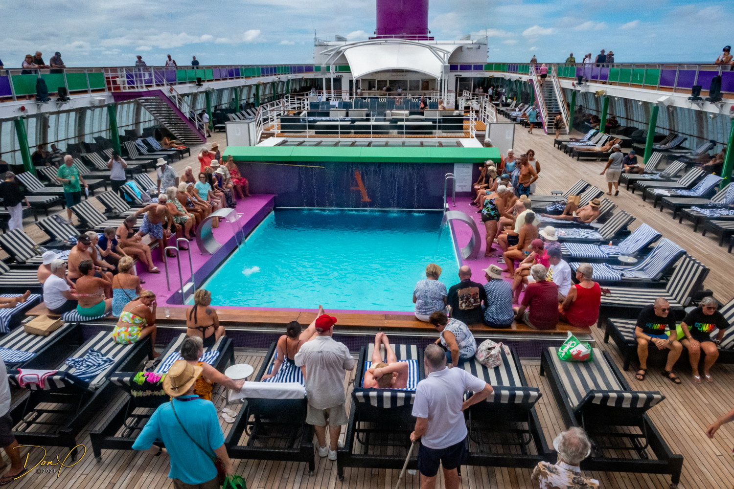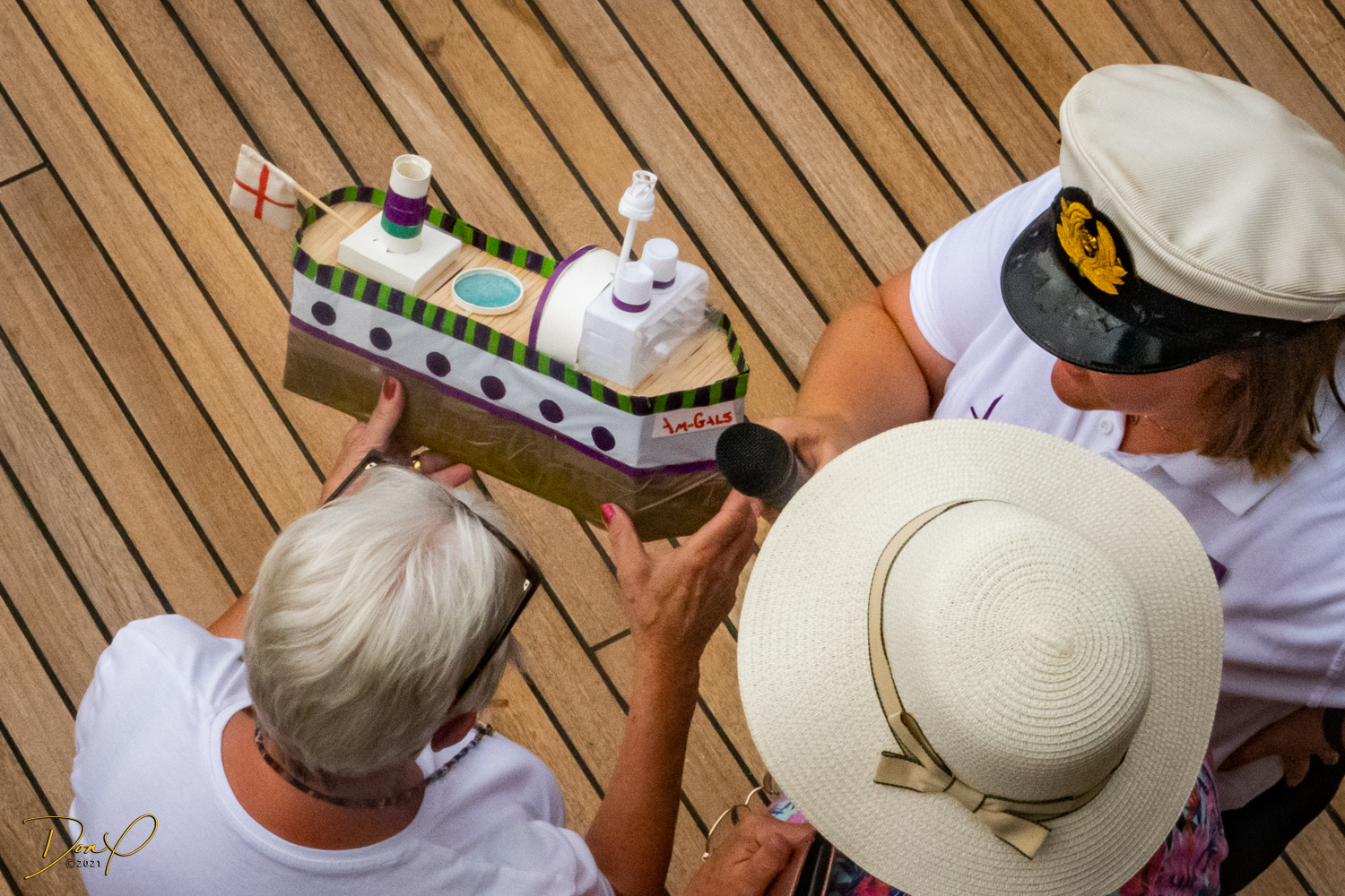 At two o’clock on Friday afternoon, the entertainment crew hosts the “World Cruise Boat Regatta”, a silly entertainment where passengers that wanted to, built some kind of floatable boat out of recycled materials on the ship (so that’s where all the coffee stirrer sticks disappeared to!). Then they were put to the test in the pool where a crew member would put a full bottle of water (the ‘Captain’) somewhere on the boat and if it stood up gor 3 whole seconds, the boat would pass! The final winner was voted by rounds of applause from the spectators. All good fun, lots of laughs and it kept the cocktail waitresses busy!