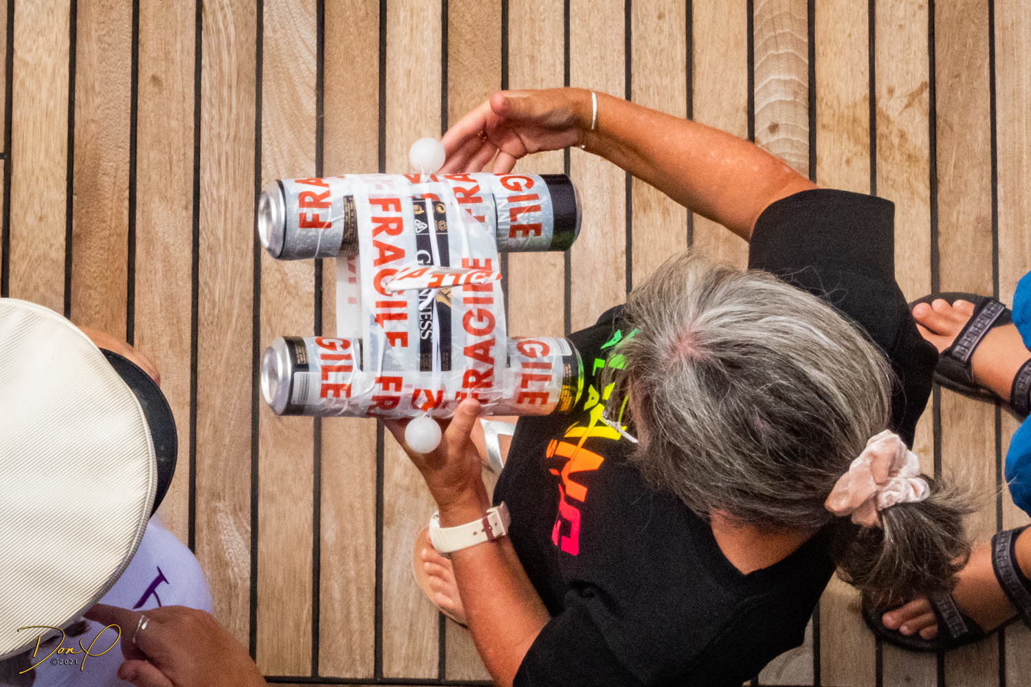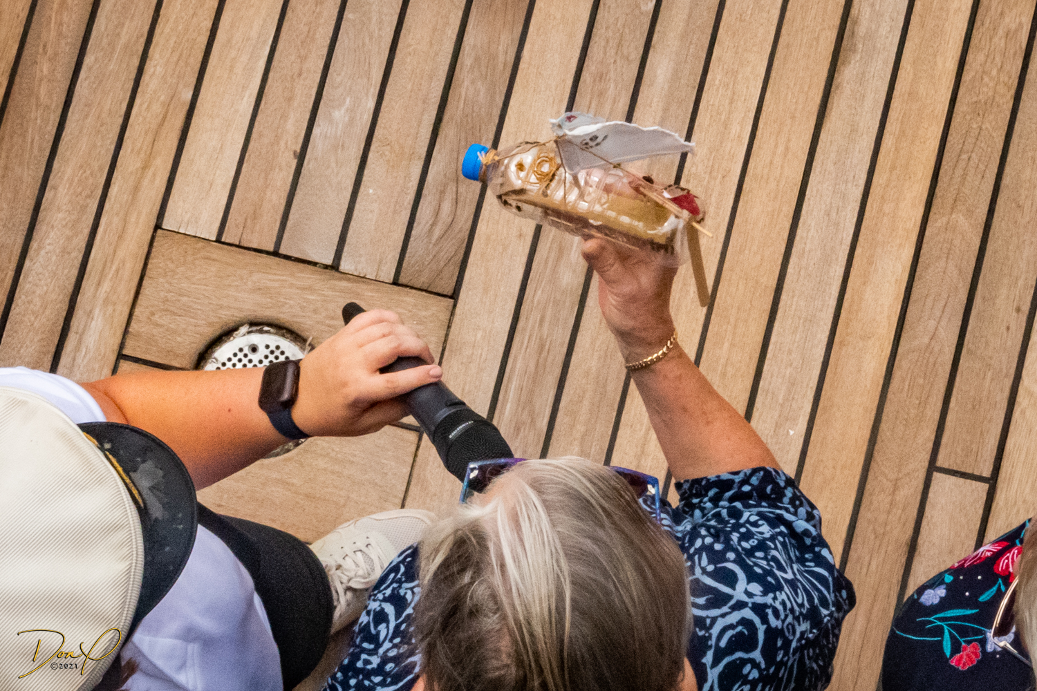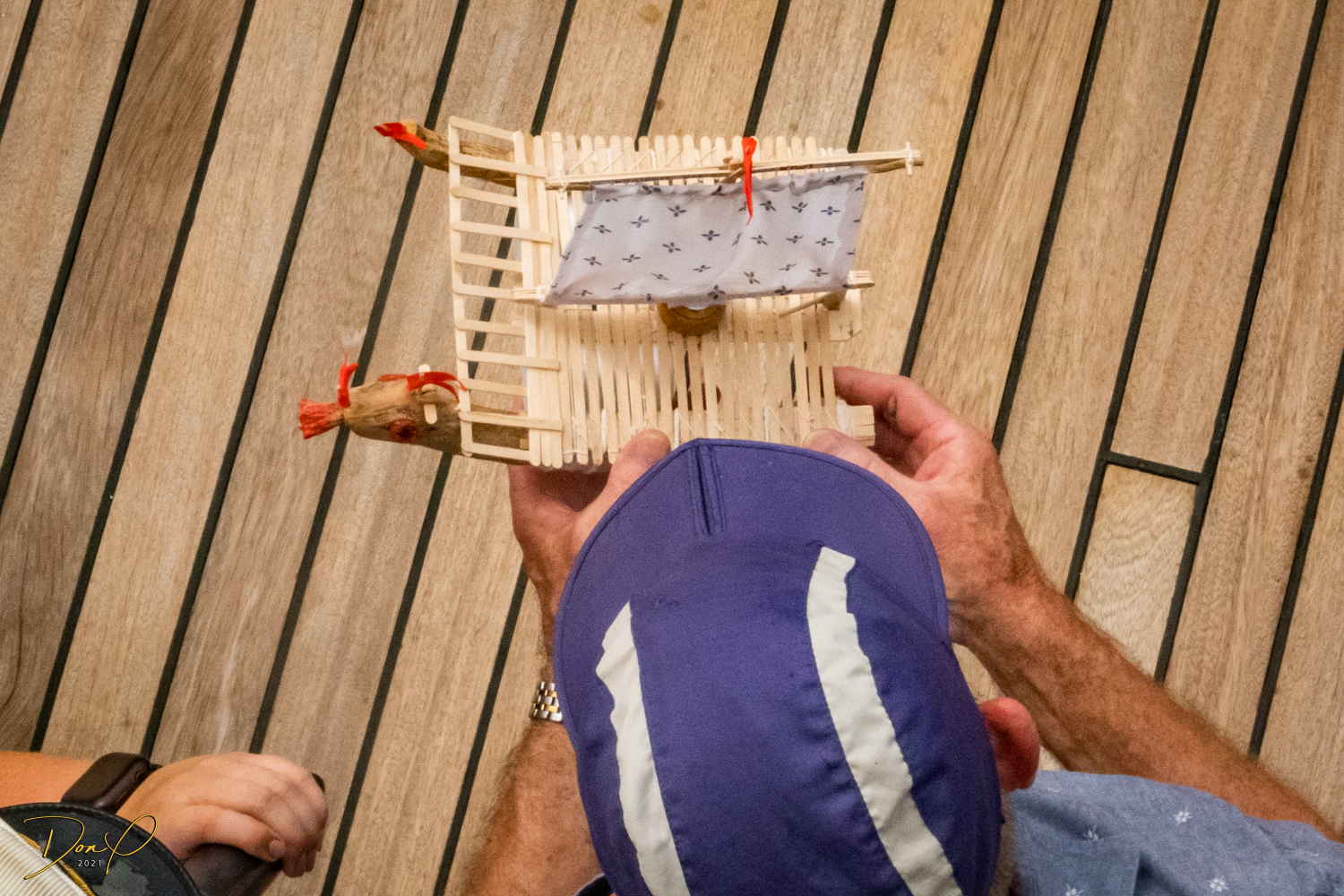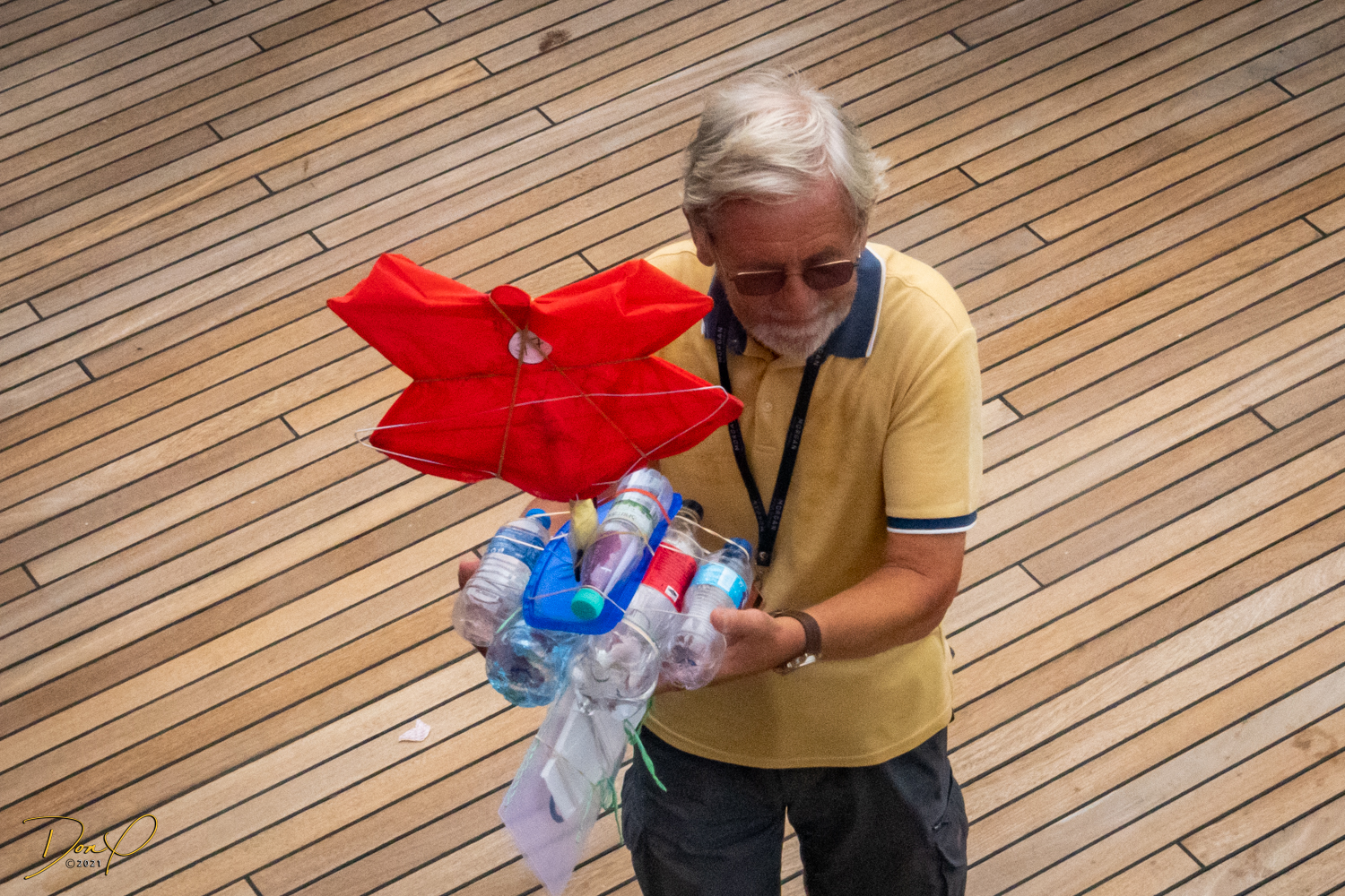 At two o’clock on Friday afternoon, the entertainment crew hosts the “World Cruise Boat Regatta”, a silly entertainment where passengers that wanted to, built some kind of floatable boat out of recycled materials on the ship (so that’s where all the coffee stirrer sticks disappeared to!). Then they were put to the test in the pool where a crew member would put a full bottle of water (the ‘Captain’) somewhere on the boat and if it stood up gor 3 whole seconds, the boat would pass! The final winner was voted by rounds of applause from the spectators. All good fun, lots of laughs and it kept the cocktail waitresses busy!