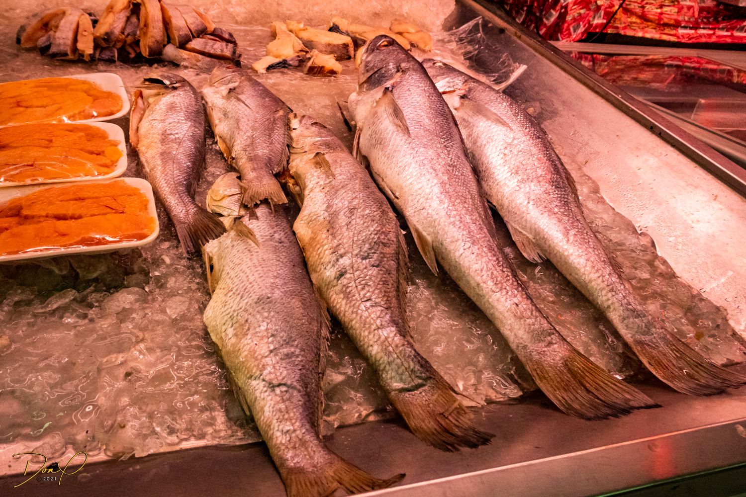 Fish delicacies galore also! We find fabrics and products as far as the eye can see! We even find a fun magnet for our wall map in our stateroom! One of the fun things we do on a long cruise is buy a location magnet for each port and put it on our wall, making a map of our journey! This is easy to do because ships stateroom walls are metal! The fish market sections are interesting!