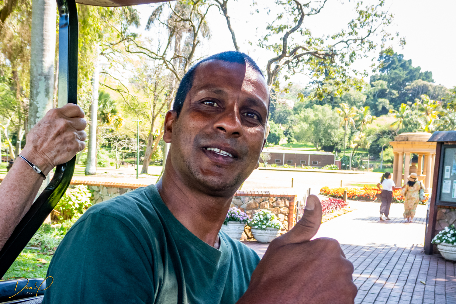 Thadwyn next takes us to the Botanical Gardens and finds a friend of his, Vishnu, a golf cart tour operator in the Gardens and we pay Vishnu $10 USD each for a private tour, replete with extensive knowledge of all the plants and trees in the Gardens! Well worth the 45 minute tour! We even see a tree that has been alive since the dinosaurs and is called the loneliest tree! It has been determined that the tree is male. There is no surviving female tree of its species and it cannot reproduce! We are told that somewhere in the UK, they are working on trying to clone a tree and turn it female. As I don’t understand the science, I will accept it is a lonely tree!