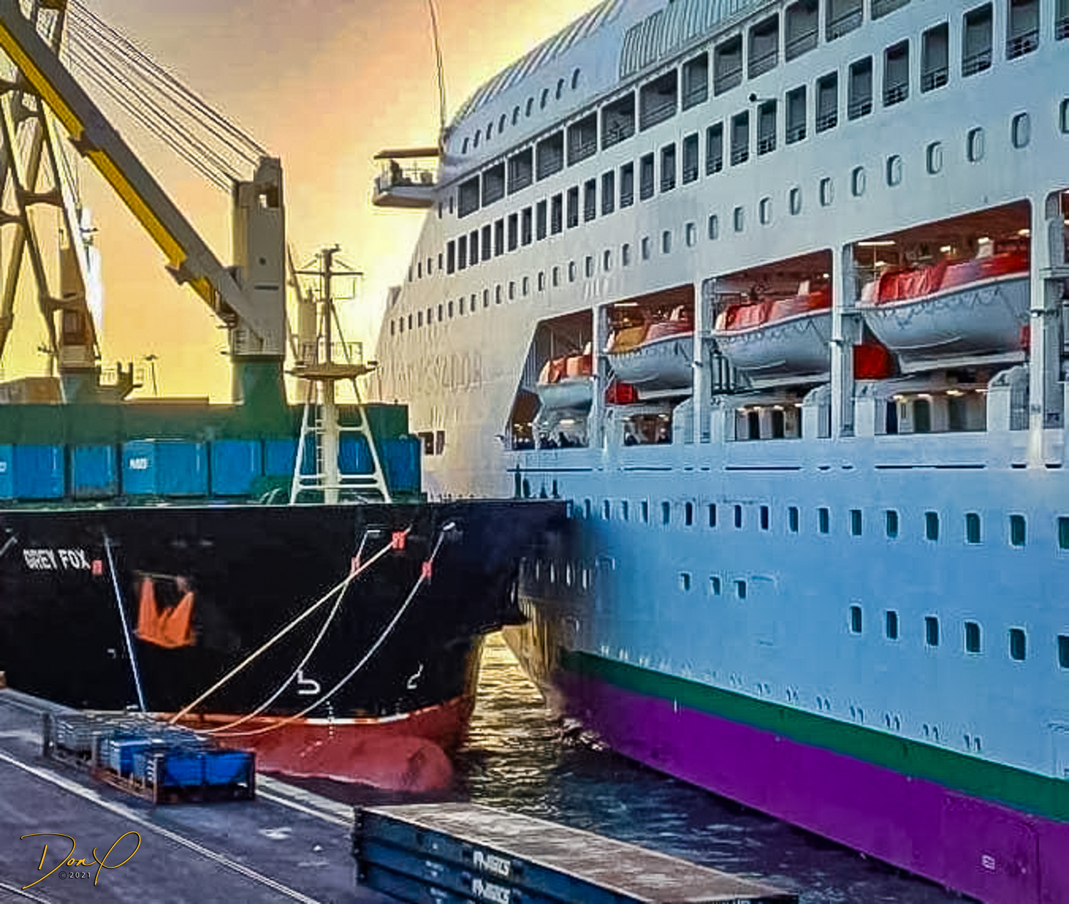 Today we awaken at 6:30AM to a message from the bridge that winds have caused us to bump into a freighter while attempting to dock. The captain says we have no damage but we will be docked in a different place than originally planned. Turns out is is only a ships length from the original plan.