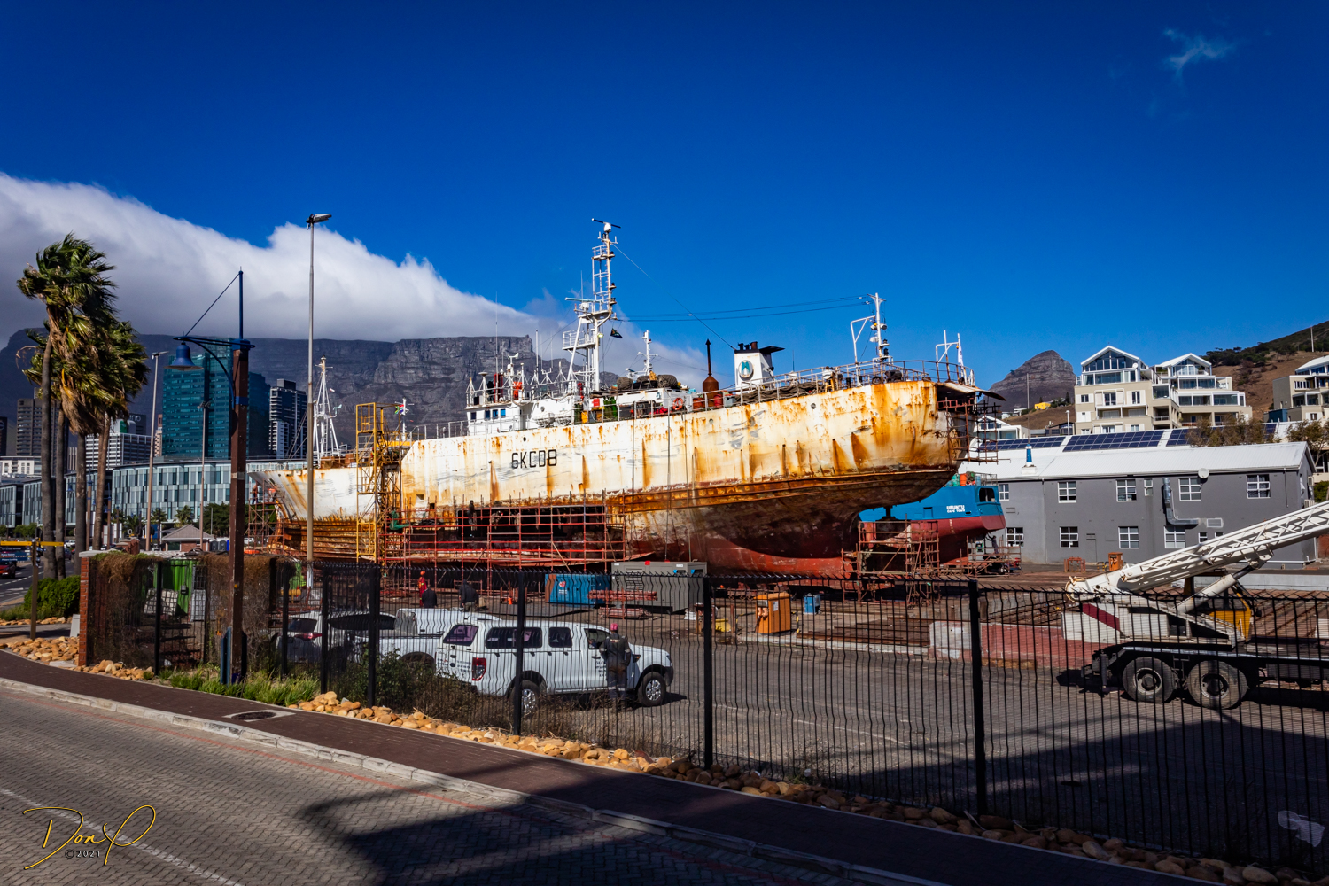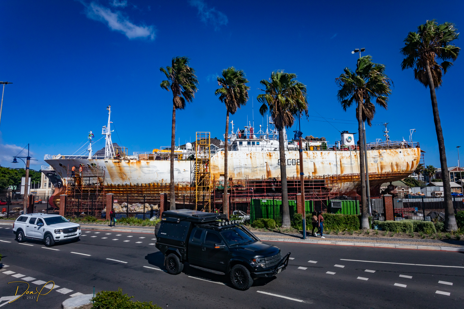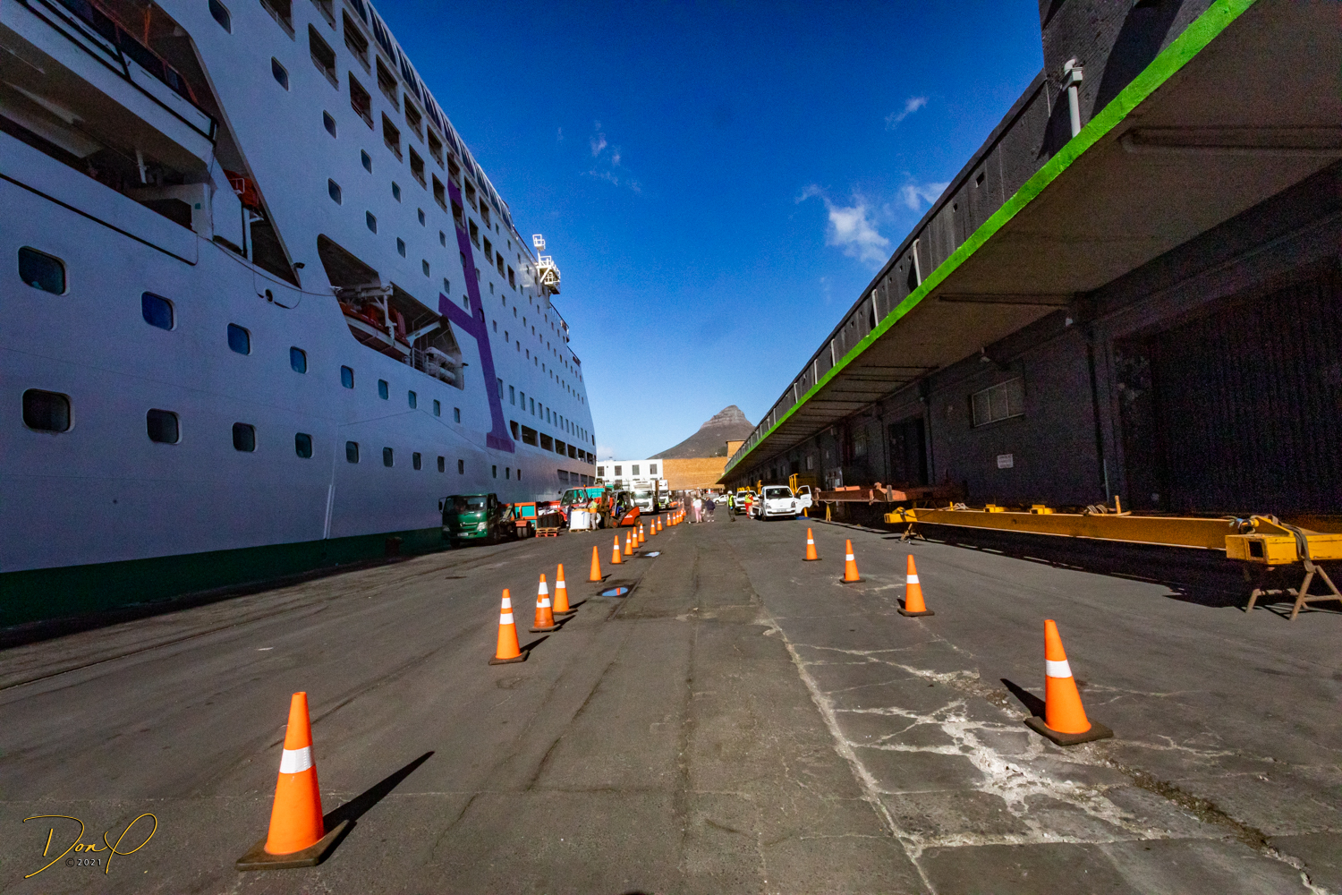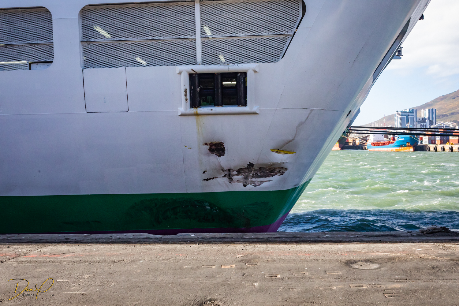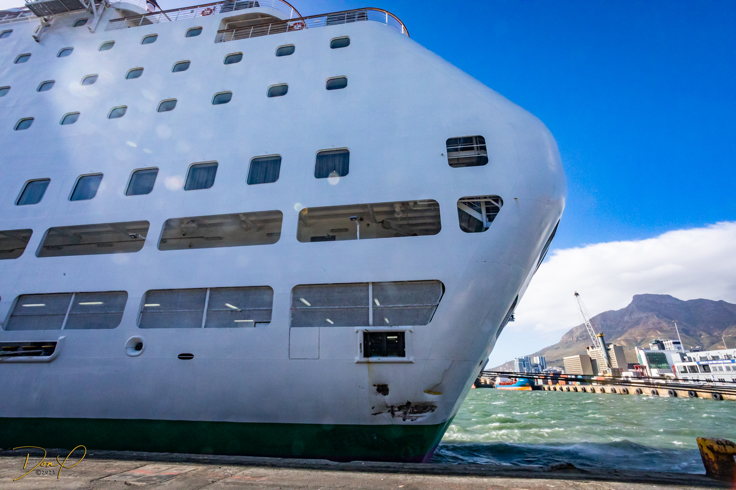 By the time the bus gets back to the start of the route, we are tired and still need to do some shopping. There is a Mall a short 10 minute walk from the bus stop and we pick up some sundries that we need. We also find the magnet for our stateroom wall. Armed with the items we need, we hire a taxi back to the ship and it costs 185 Rand, approximately $9 USD. The taxi driver comments that one of the ships had an “Oopsie” this morning. I tell him, “That’s the ship! Take us there!” The ship’s crew has painted over the dent in the back of the ship!