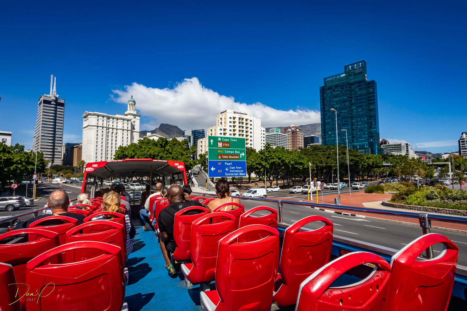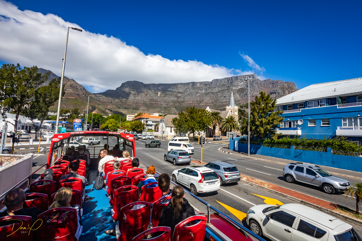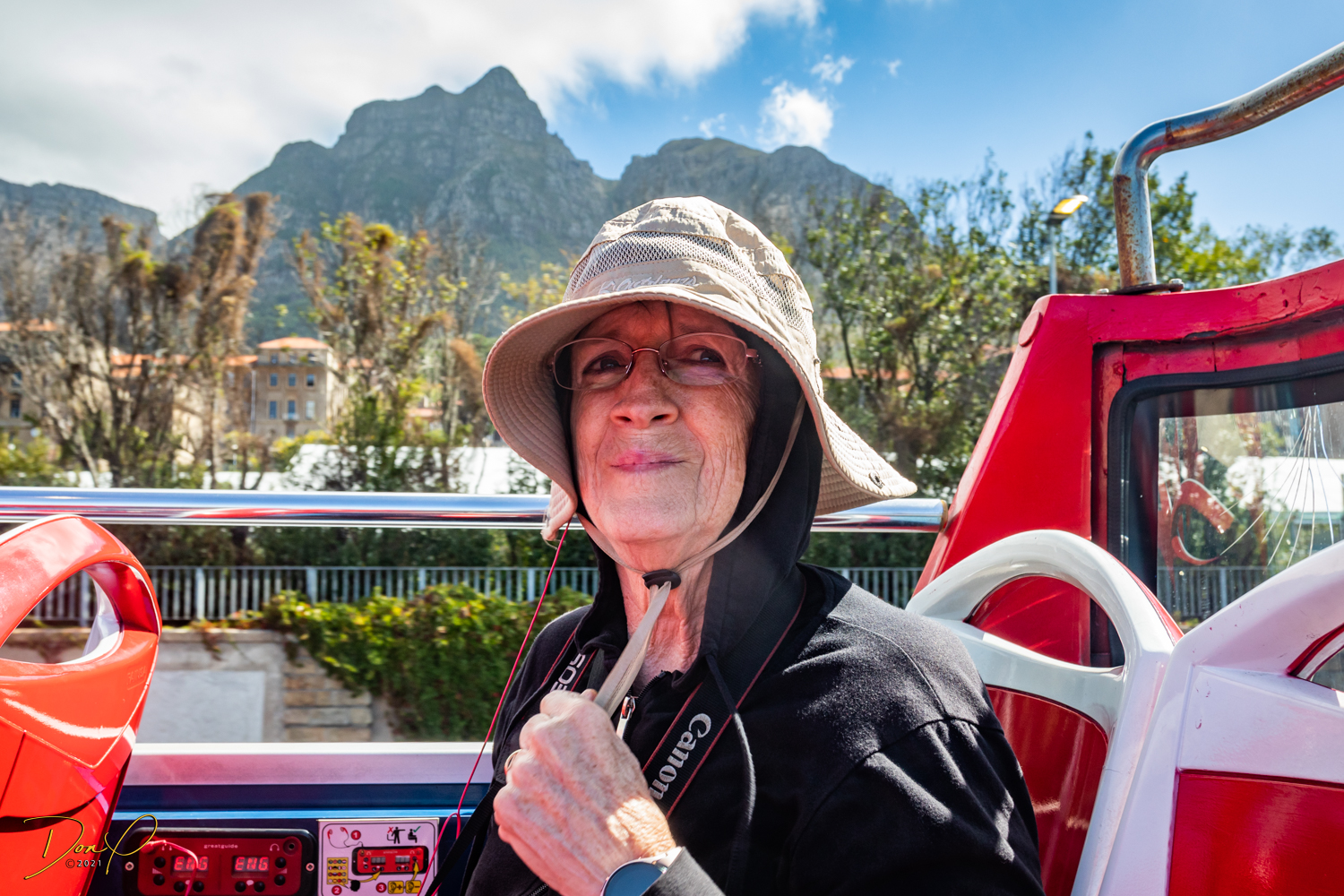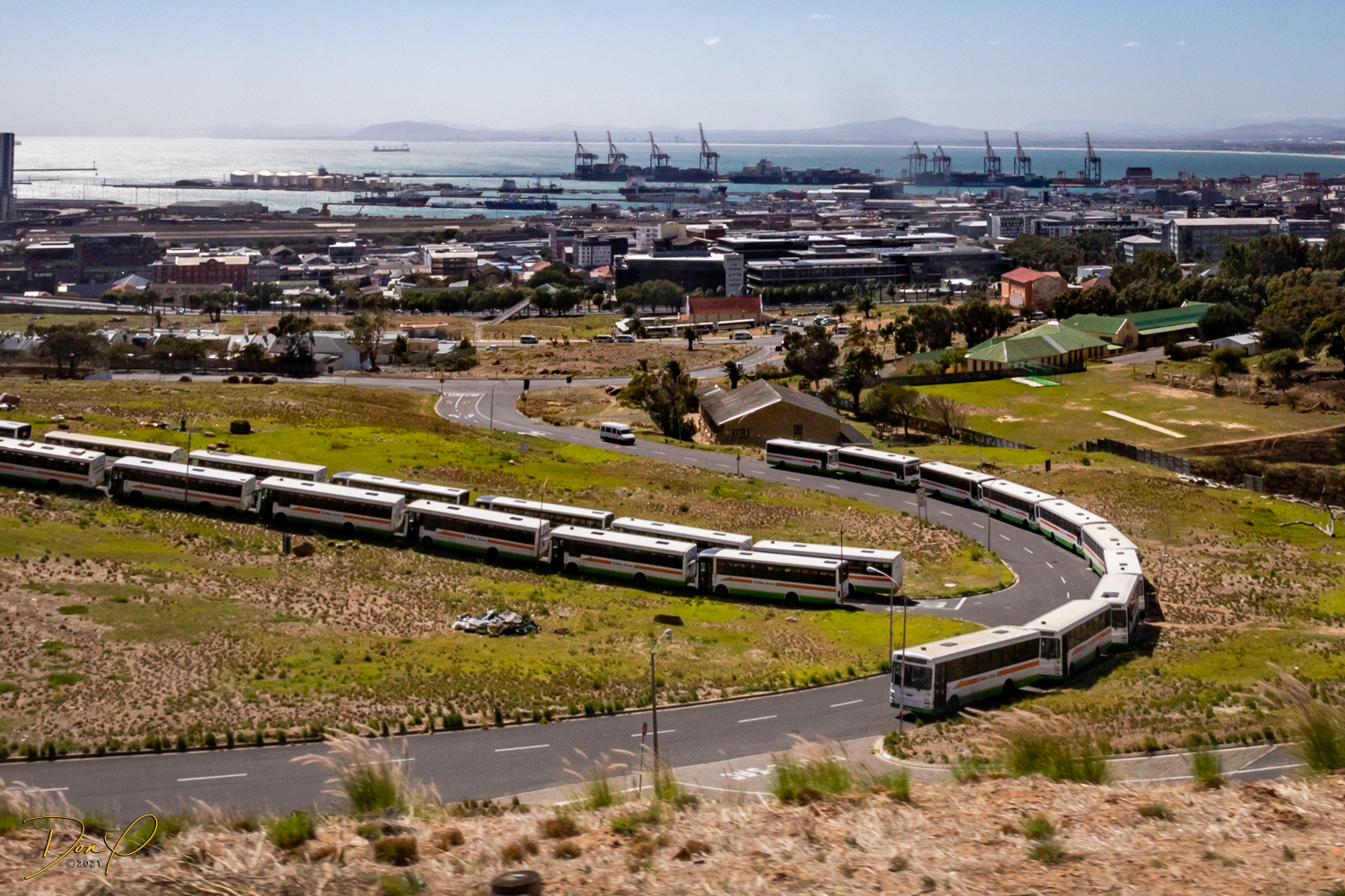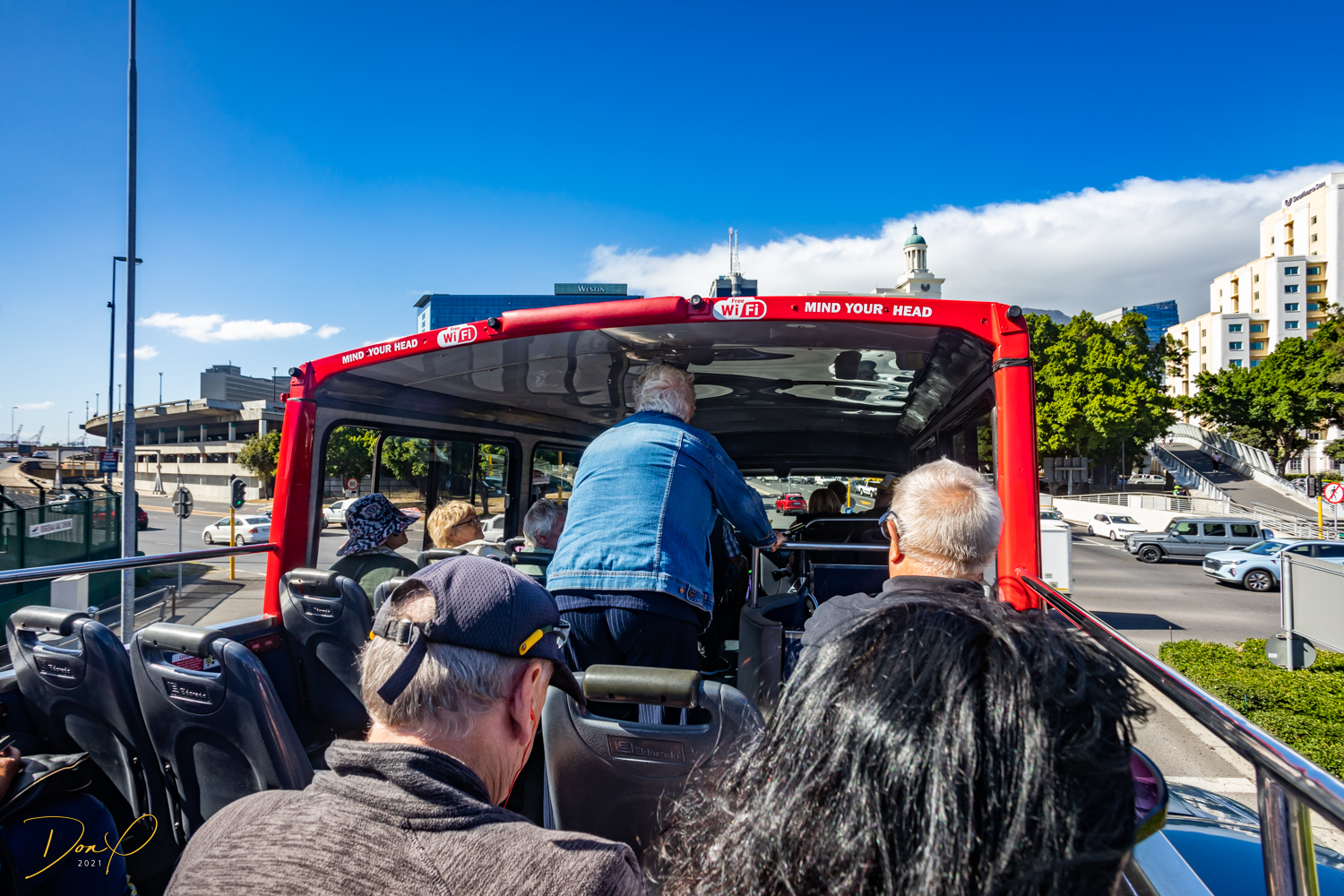 The winds are very strong and we are sitting in the top of the open top bus but our cameras have insisted that this is the place to be! So on we go until we get to the bus stop for the cablecar to the top of Table Mountain. As expected, though, the cablecar is not running today due to the high winds. A bit disappointed, but we also realize there is no way we’d want to be in a cablecar in these winds anyway.