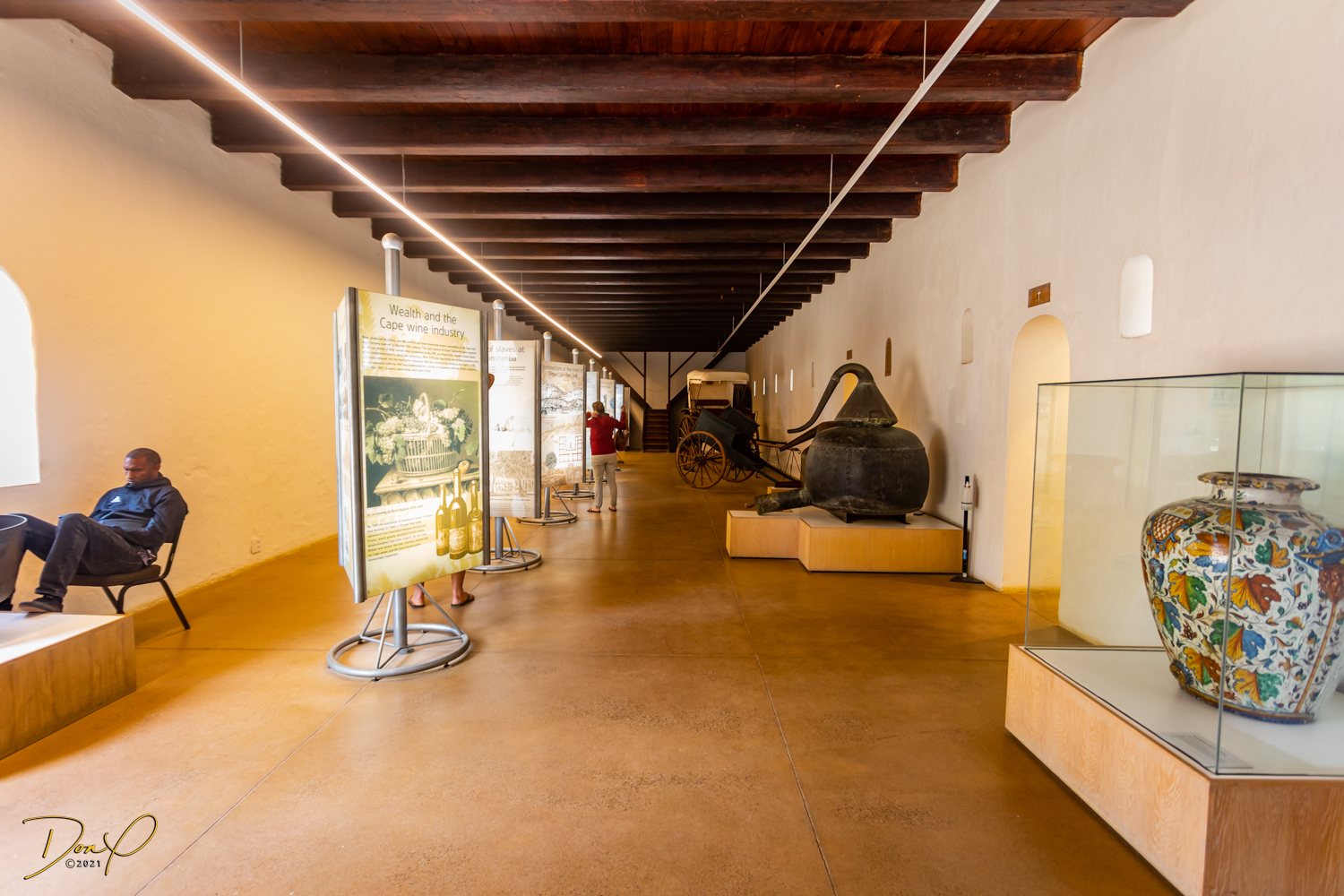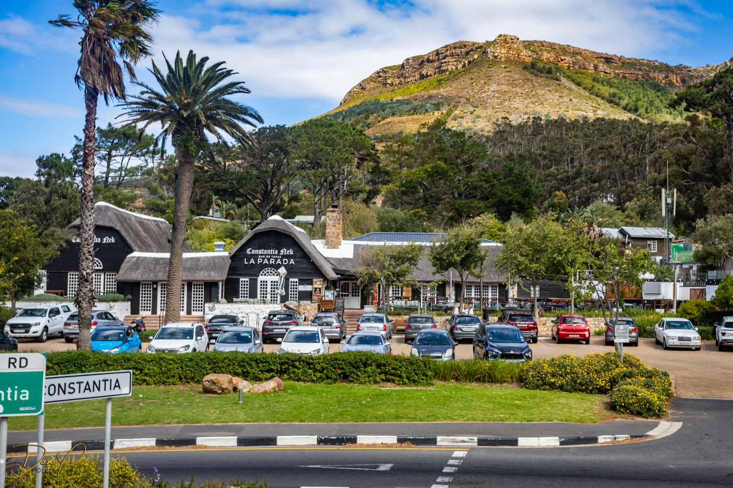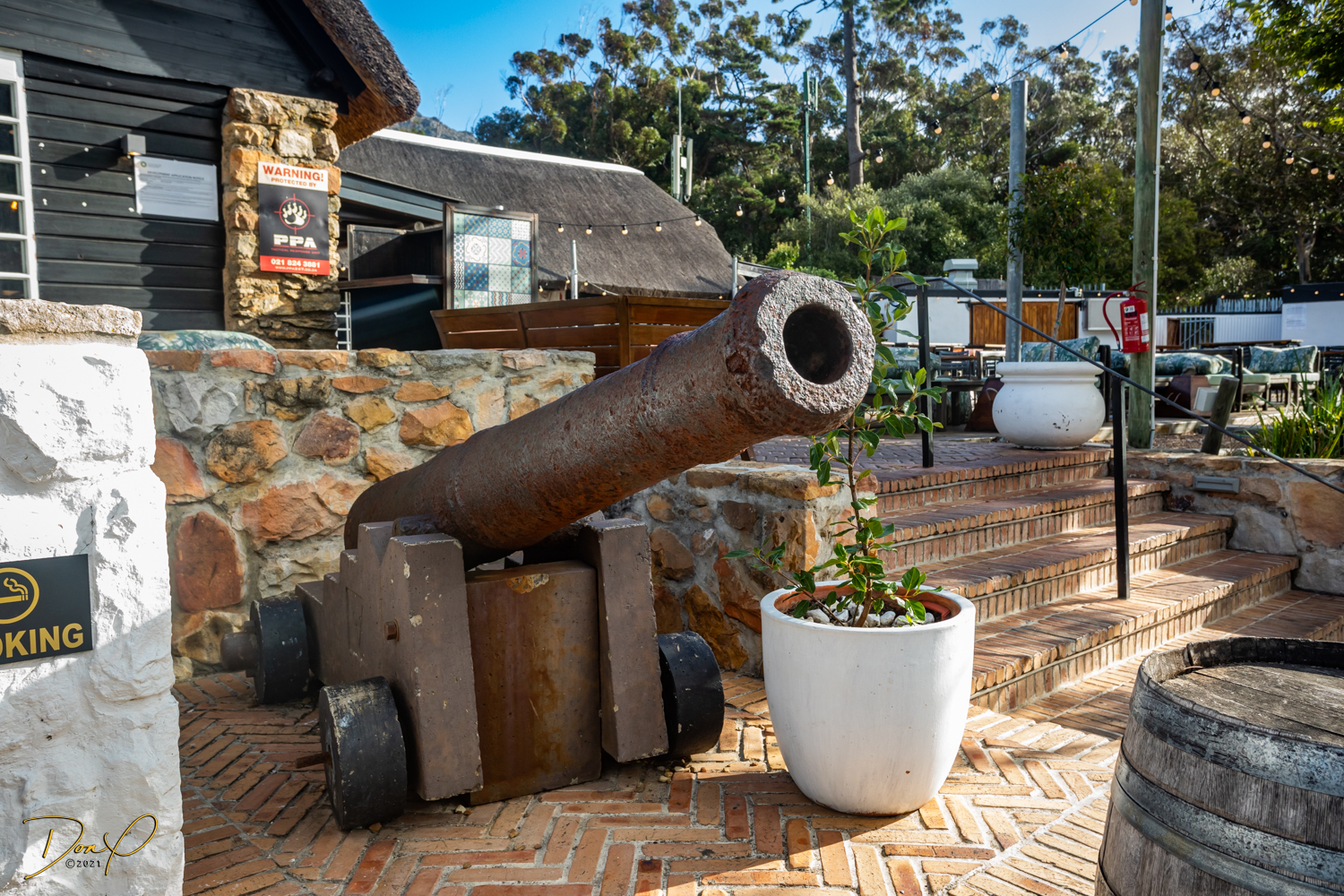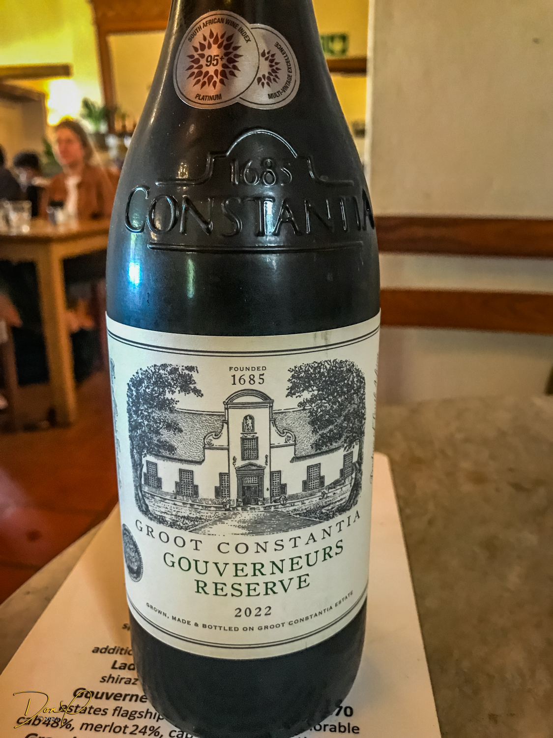 After a while, we come to a bus stop where we get off and board a different bus to take us around the ‘Wine Trail Loop’. We stop at Jonkershuit Wine Estate, also known as Groot Constantia Wine Estate. This turns out to be the Oldest Winery in the Southern Hemisphere! It is so windy, we opt to go into the first building we can and it turns out to be the restaurant. We get seated and place our orders for lunch. We share an appetizer of ‘Smoked Kudu Carpachio’, a kind of African antelope. It is excellent! Then I order Ostrich Steak and am informed they are out of it. But instead they give me Springbok Steak, another kind of antelope. It is fabulous and cooked perfectly! Elee orders ‘Beef Bobotie’, a ground beef dish with egg. It was also delicious! To compliment the meal we order the ‘Governeurs Reserve Wines, White for Elee and Red for me. Both excellent choices!