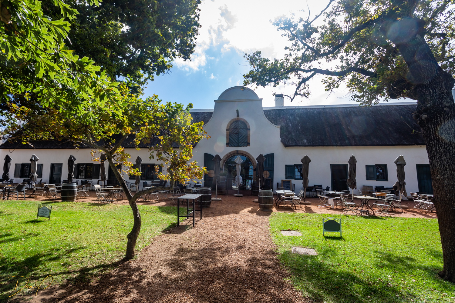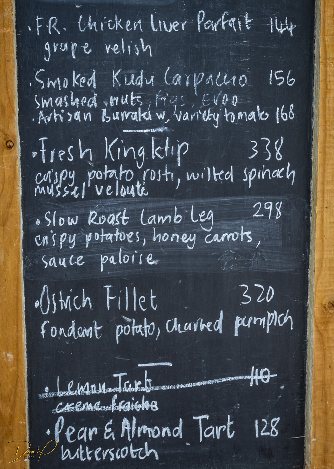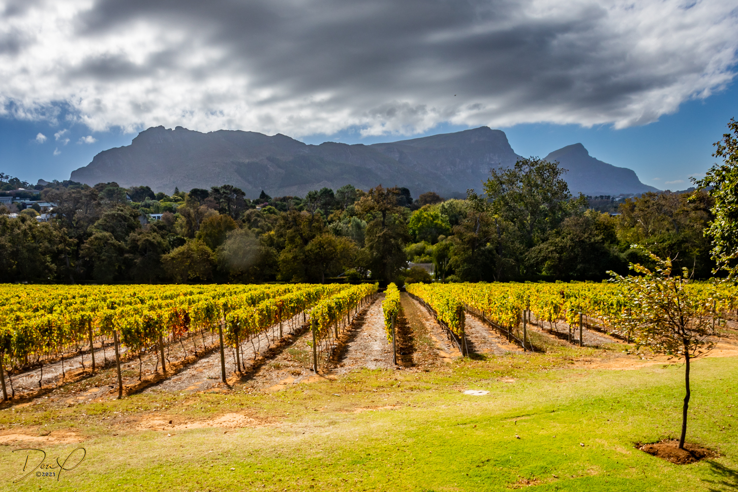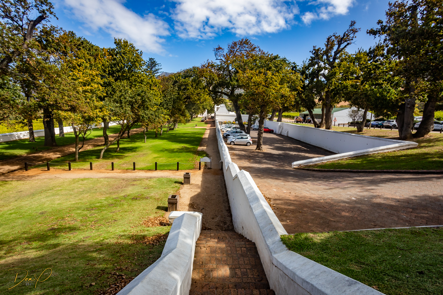 After a while, we come to a bus stop where we get off and board a different bus to take us around the ‘Wine Trail Loop’. We stop at Jonkershuit Wine Estate, also known as Groot Constantia Wine Estate. This turns out to be the Oldest Winery in the Southern Hemisphere! It is so windy, we opt to go into the first building we can and it turns out to be the restaurant. We get seated and place our orders for lunch. We share an appetizer of ‘Smoked Kudu Carpachio’, a kind of African antelope. It is excellent! Then I order Ostrich Steak and am informed they are out of it. But instead they give me Springbok Steak, another kind of antelope. It is fabulous and cooked perfectly! Elee orders ‘Beef Bobotie’, a ground beef dish with egg. It was also delicious! To compliment the meal we order the ‘Governeurs Reserve Wines, White for Elee and Red for me. Both excellent choices!