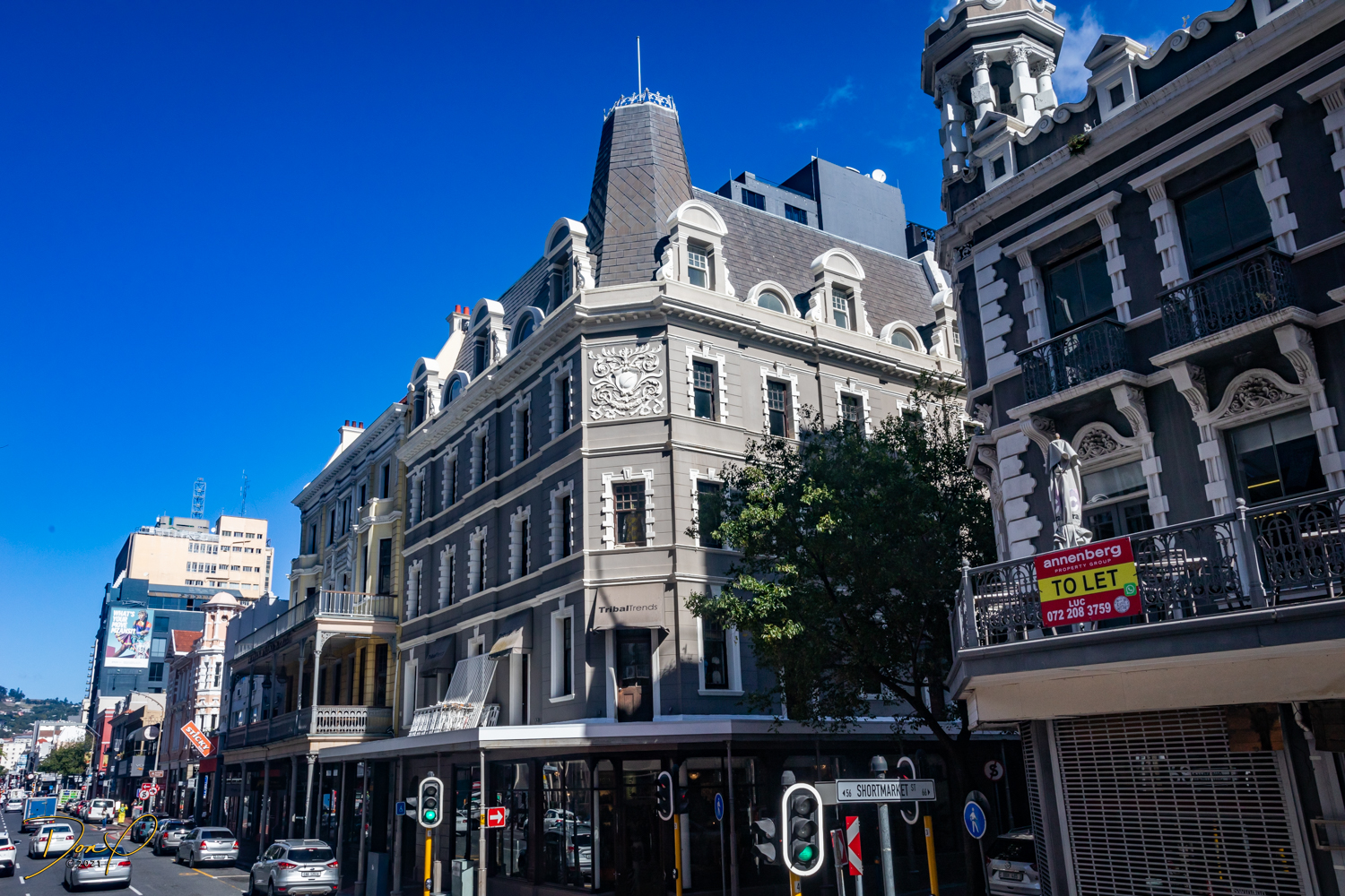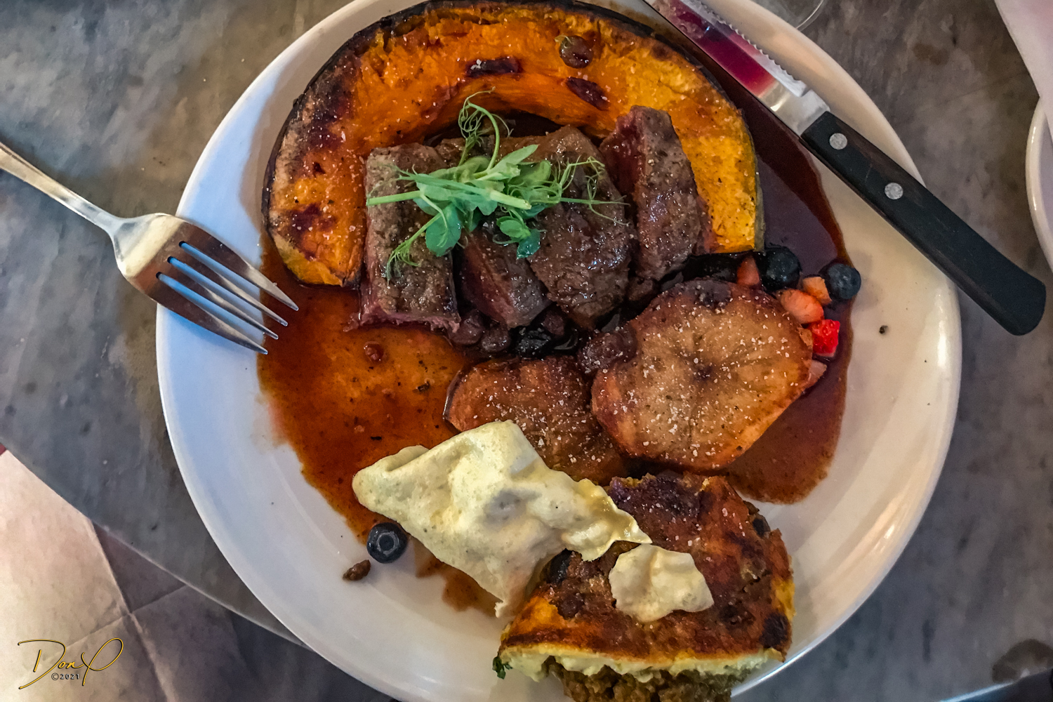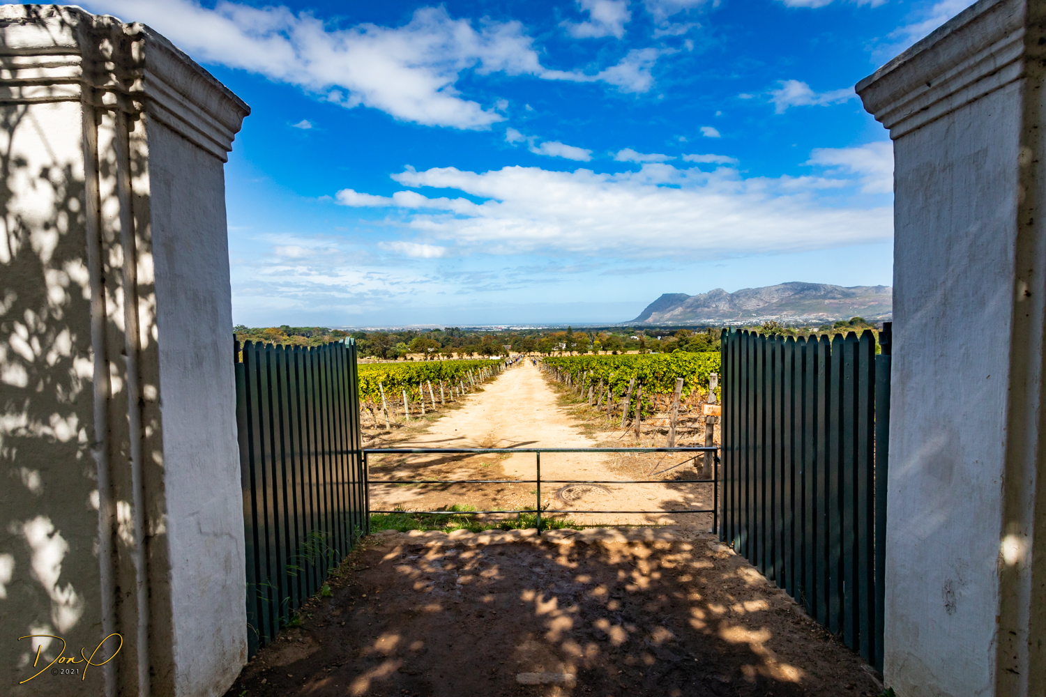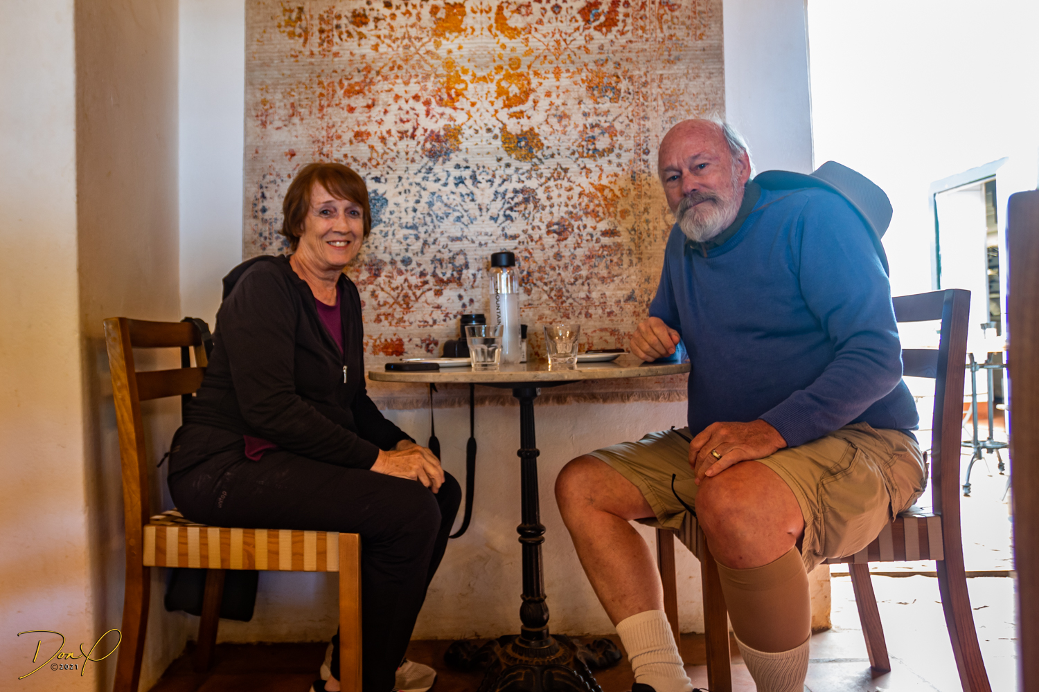 After a while, we come to a bus stop where we get off and board a different bus to take us around the ‘Wine Trail Loop’. We stop at Jonkershuit Wine Estate, also known as Groot Constantia Wine Estate. This turns out to be the Oldest Winery in the Southern Hemisphere! It is so windy, we opt to go into the first building we can and it turns out to be the restaurant. We get seated and place our orders for lunch. We share an appetizer of ‘Smoked Kudu Carpachio’, a kind of African antelope. It is excellent! Then I order Ostrich Steak and am informed they are out of it. But instead they give me Springbok Steak, another kind of antelope. It is fabulous and cooked perfectly! Elee orders ‘Beef Bobotie’, a ground beef dish with egg. It was also delicious! To compliment the meal we order the ‘Governeurs Reserve Wines, White for Elee and Red for me. Both excellent choices!