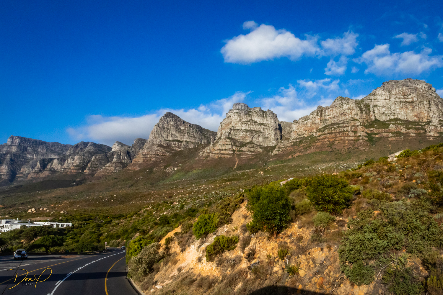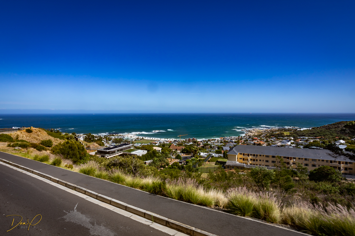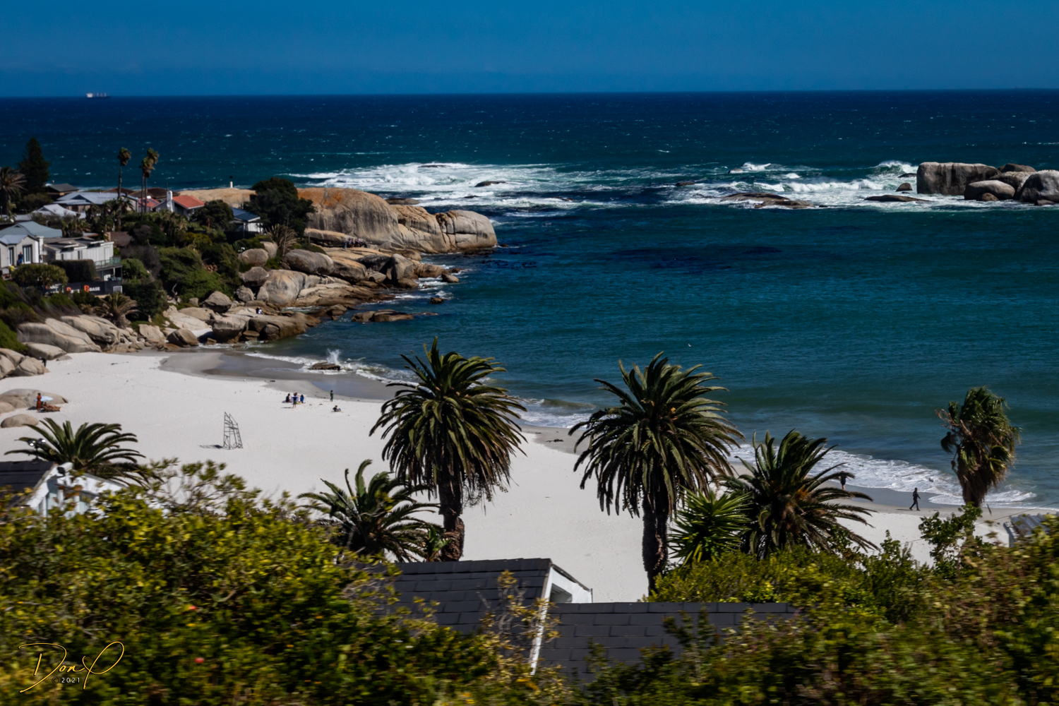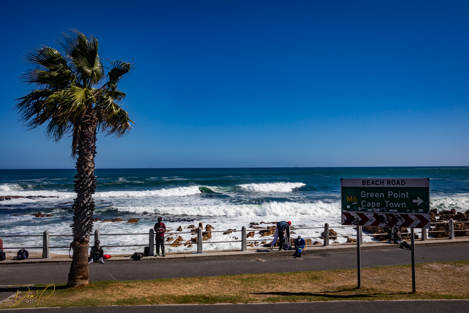 Back on the bus, we drive over the pass between Table Top Mountain and Lion’s Head, a pointy mountain that reminds me of photos I have seen of a mountain in Iceland that I someday want to photograph. Off to the other side of Table Top is a third mountain known as ‘Devil’s Peak’. The scenery here is fantastic and soon we descend down the mountain pass to beautiful beaches with waves crashing in the high winds!