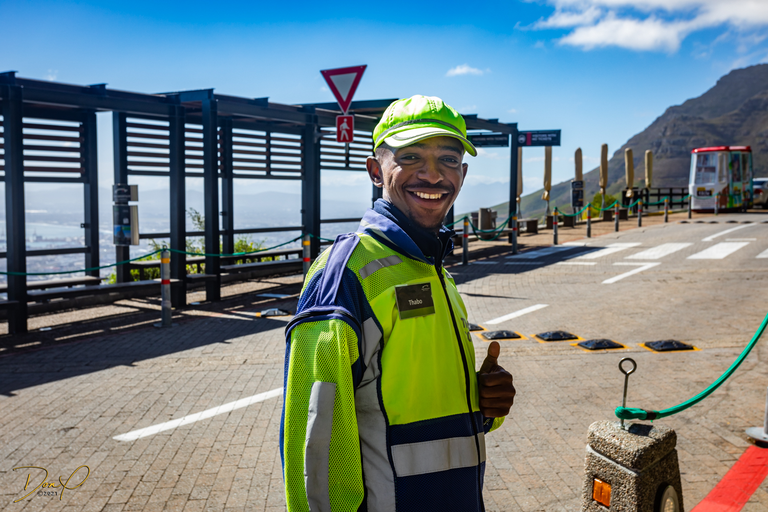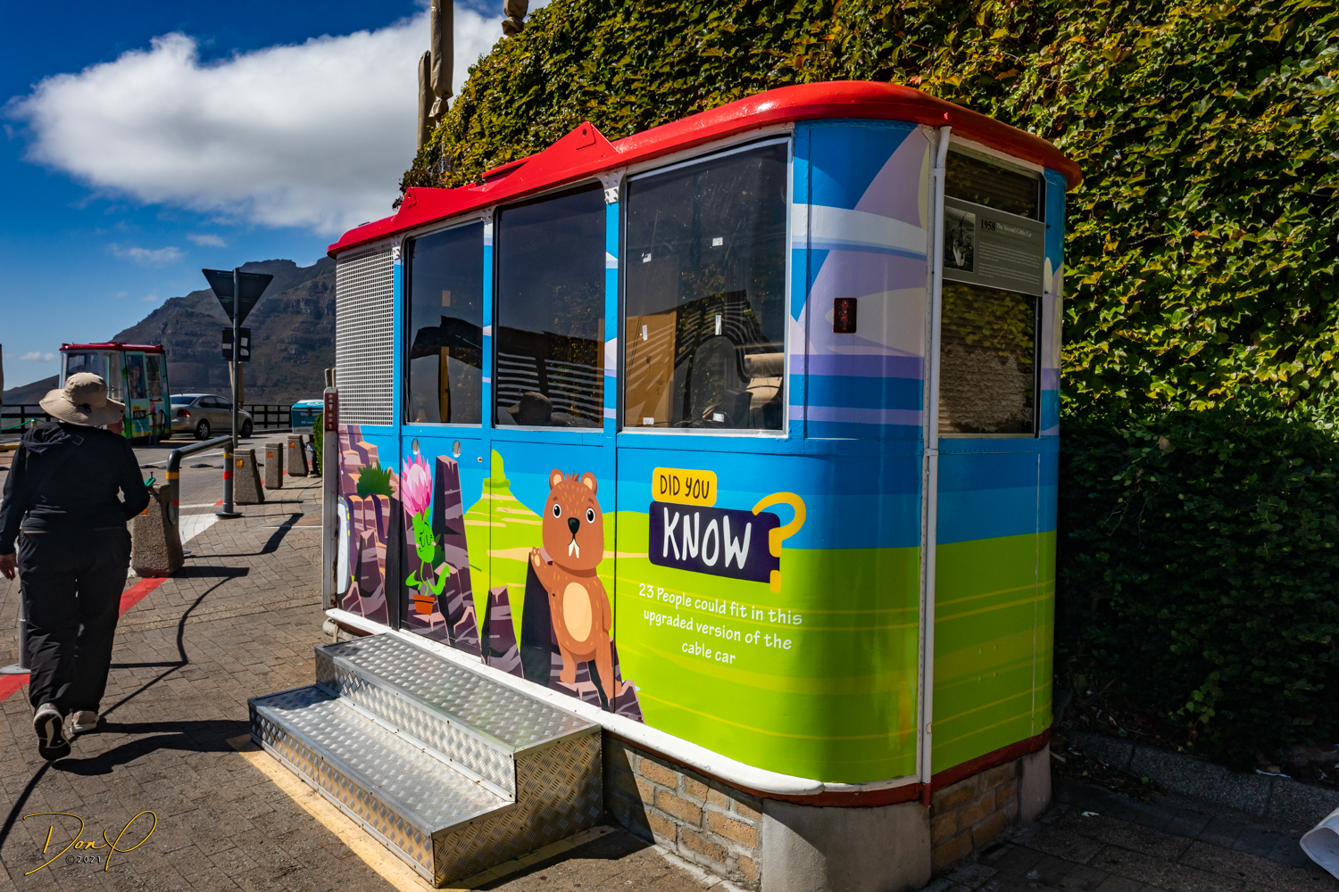 So our cameras guide us as we walk around and a friendly Traffic Control guy takes us under his wing and shows us around as he describes everything to us. Thabo (pronounced Taa-Bow) is very friendly and quite knowledgeable about the area and even takes us to the beginning of a hiking trail that we climb for only a short distance on the very rough path in the strong winds before we decide ‘not today’. Our cameras get some fun views of the port below and Table Mountain above and then we head back to the bus stop. Thabo meets us again and shows us the different displays of cable cars used since 1929 and we are amazed at how tiny they are and how many people they carried!