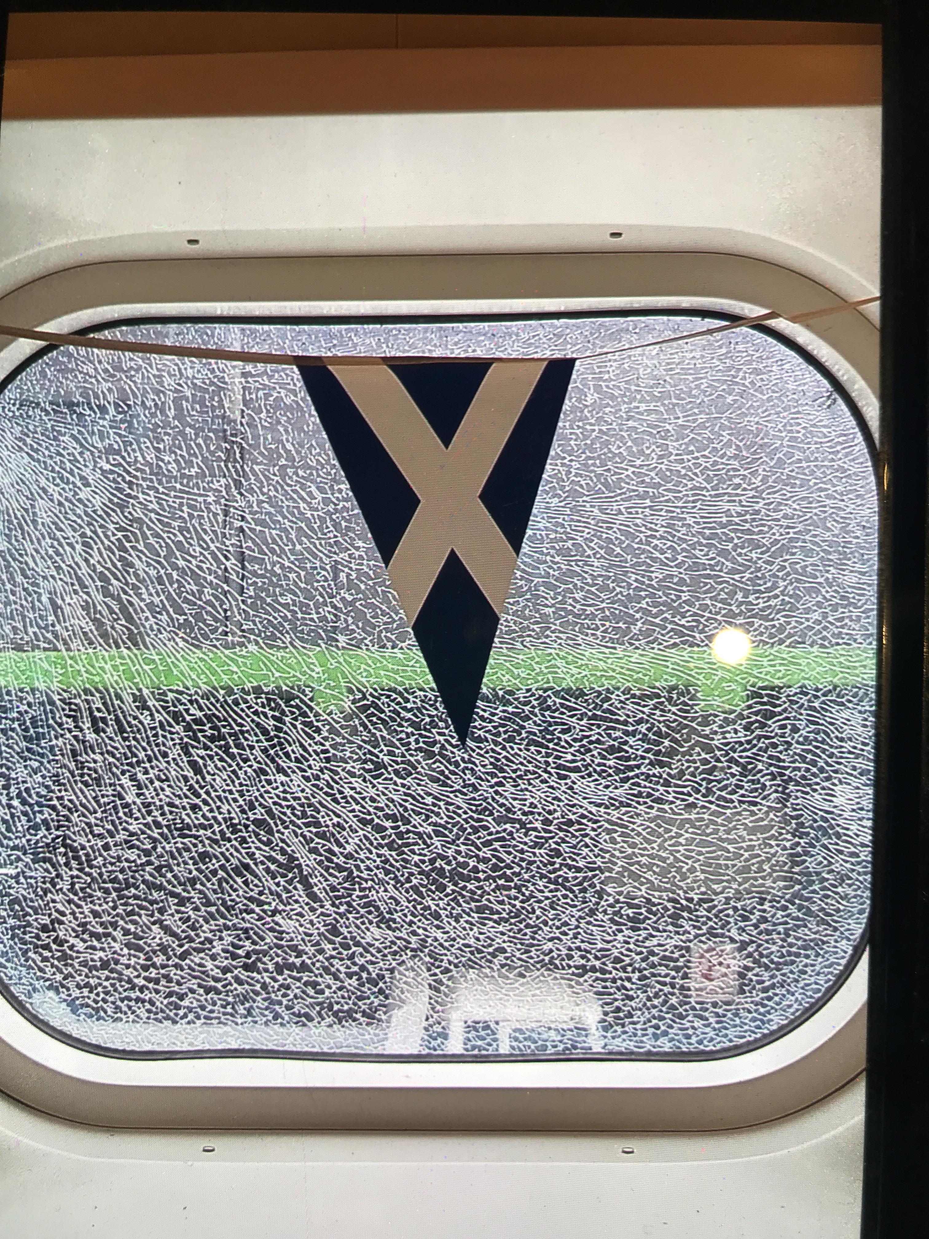 We have breakfast and disembark to find we have to walk through a wind tunnel to get to the Terminal. The wind is so strong that it actually blows my legs so hard that I have to fight to step where I want to! I take photos of the back corner of our ship that has sustained a dent, albeit a very small dent.