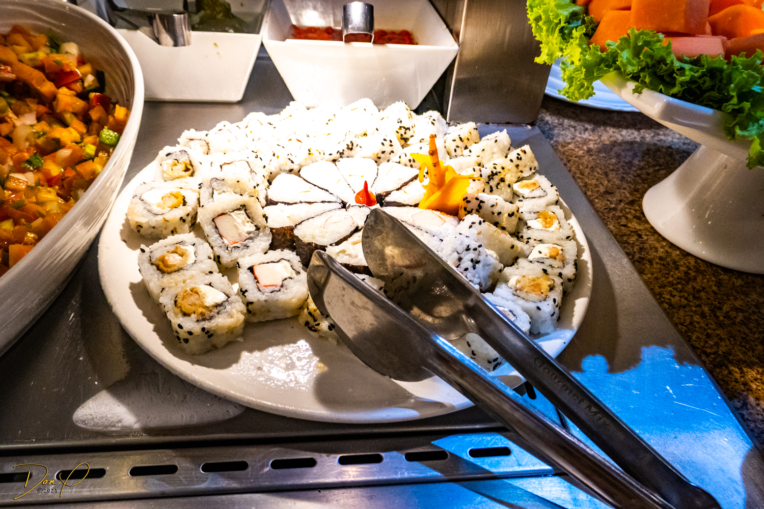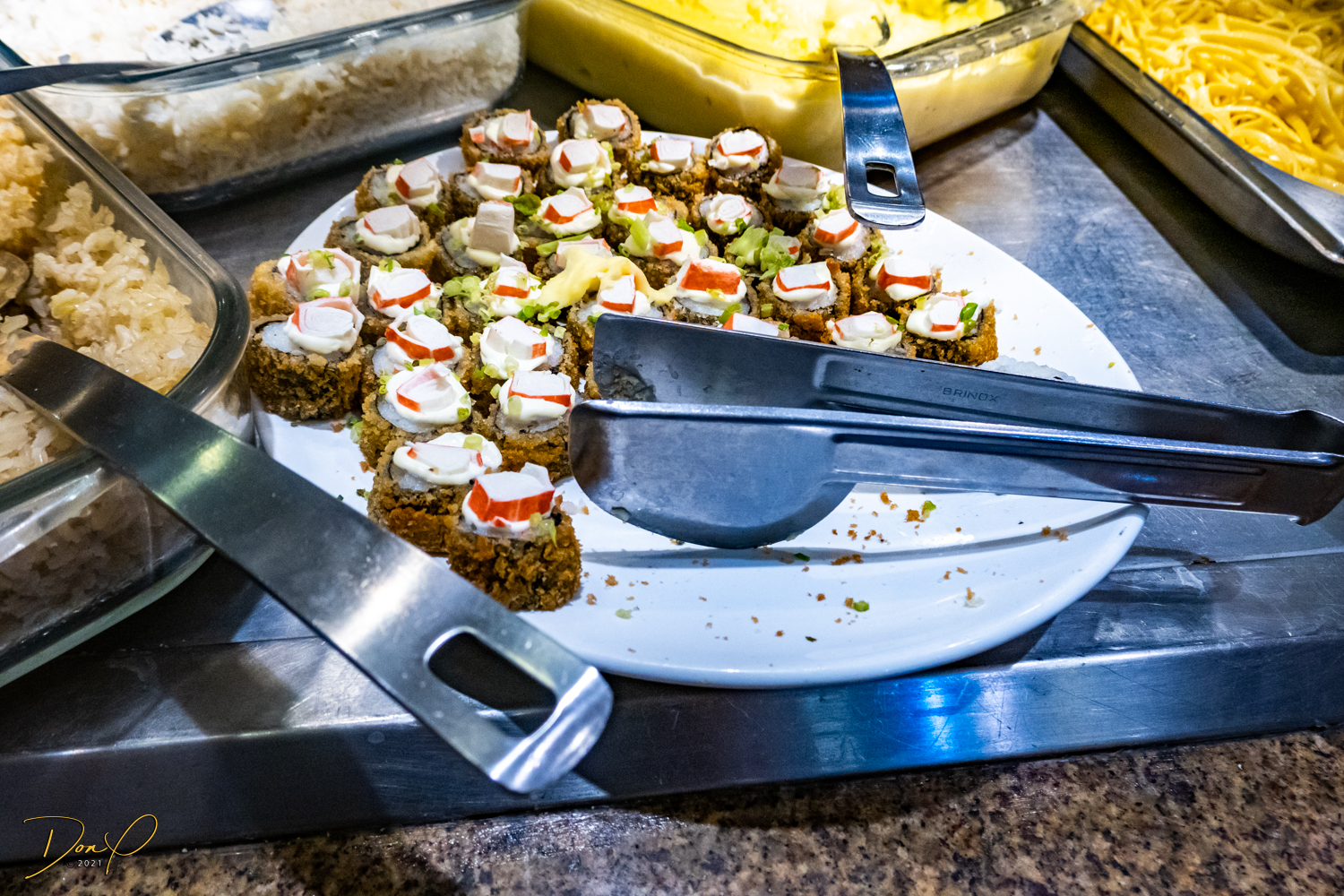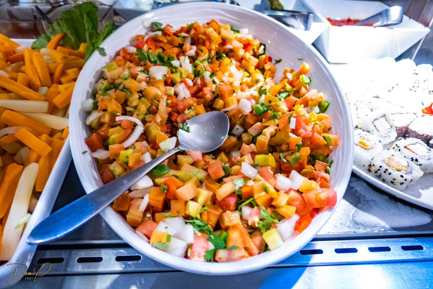 Franklin takes us to the Mercado and finds us a lunch restaurant called ‘Cafe de Mercado where they have an upstairs buffet of local foods, most of which we don’t recognize! But it all looks delicious, including some sushi. Franklin assures us that all the food is made fresh! We buy Franklin his lunch and we all have a good time, all the while chatting with Franklin via Google Translate!