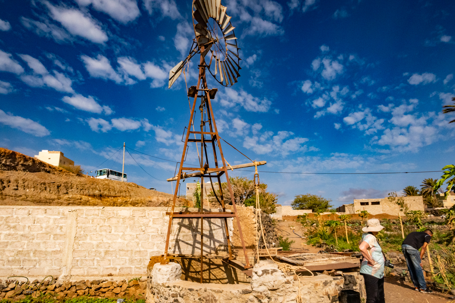 We drive off out of town and onto the island’s tundra. This is pretty much a desert isle and natural growth is rare. But he brings us to a local farm where we walk down into the farm and get to see the plants and vegetables grow. We also see a windmill as it pumps water out of a well. The people here are very self reliant and it is amazing to see how they prosper.